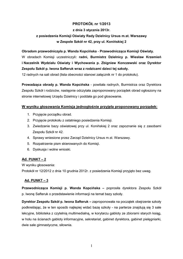 PROTOKÓŁ nr 1/2013 z dnia 3 stycznia 2013r. z posiedzenia Komisji Oświaty Rady Dzielnicy Ursus m.st. Warszawy w Zespole Szkół nr 42, przy ul. Konińskiej 2 Obradom przewodniczyła p. Wanda Kopcińska - Przewodnicząca Komisji Oświaty. W obradach Komisji uczestniczyli: radni, Burmistrz Dzielnicy p. Wiesław Krzemień i Naczelnik Wydziału Oświaty i Wychowania p. Zbigniew Konczewski oraz Dyrektor Zespołu Szkół p. Iwona Safteruk wraz z rodzicami dzieci tej szkoły. 12 radnych na sali obrad (lista obecności stanowi załącznik nr 1 do protokołu). Prowadząca obrady p. Wanda Kopcińska - powitała radnych, Burmistrza oraz Dyrektora Zespołu Szkół i rodziców, następnie odczytała zaproponowany porządek obrad ogłoszony na stronie internetowej Urzędu Dzielnicy i poddała go pod głosowanie. W wyniku głosowania Komisja jednogłośnie przyjęła proponowany porządek: 1. Przyjęcie porządku obrad. 2. Przyjęcie protokołu z ostatniego posiedzenia Komisji. 3. Zwiedzanie bazy oświatowej przy ul. Konińskiej 2 oraz zapoznanie się z zasobami Zespołu Szkół nr 42. 4. Sprawy wniesione przez Zarząd Dzielnicy Ursus m.st. Warszawy. 5. Rozpatrzenie pism skierowanych do Komisji. 6. Dyskusja i wolne wnioski. Ad. PUNKT – 2 W wyniku głosowania: Protokół nr 12/2012 z dnia 10 grudnia 2012r. z posiedzenia Komisji przyjęto bez uwag. Ad. PUNKT – 3 Przewodnicząca Komisji p. Wanda Kopcińska – poprosiła dyrektora Zespołu Szkół p. Iwonę Safteruk o przedstawienie informacji na temat bazy szkoły. Dyrektor Zespołu Szkół p. Iwona Safteruk – zaproponowała na początek obejrzenie szkoły podkreślając, że w ten sposób najlepiej widać bazę szkoły - na parterze znajdują się 3 sale lekcyjne, biblioteka z czytelnią multimedialną, w korytarzu gabloty ze zbiorami starych ksiąg, w holu na ścianach gabloty informacyjne, sekretariat, gabinet dyrektora, gabinet pielęgniarki, dwie sale gimnastyczne, siłownia. 1 Na pierwszym piętrze znajduje się 6 sal lekcyjnych oraz 3 sale komputerowe – w dwóch salach znajdują się pomoce dydaktyczne zakupione w ramach projektu UE Pt ”Tygrysy rynku pracy”, sala językowa również wyposażona w pomoce naukowe w ramach realizowanego przez szkołę projektu UE. Najnowsza sala komputerowa wyposażona jest w nowy sprzęt, okablowanie. Burmistrz Dzielnicy p. Wiesław Krzemień – mając na uwadze propozycję radnego w sprawie powołania Zespołu Roboczego w sprawie przeniesienia Zespołu Szkół nr 42 do budynku przy ul. Dzieci Warszawy 42 i Szkoły Podstawowej nr 4 na ul. Konińską 2 poprosił radnych oraz Dyrektora Zespołu Szkół o zgłaszanie kandydatur do tego zespołu. Do zespołu swój akces zgłosili: - Burmistrz Dzielnicy p. Wiesław Krzemień, - Naczelnik Wydziału Oświaty i Wychowania p. Zbigniew Konczewski, - Przedstawiciele Zespołu Szkół nr 42: p. Paweł Świeca i Michał Adamczyk, - Radni: p.p. Robert Faliszewski, Jolanta Dąbek, Wanda Kopcińska. Przewodnicząca Komisji p. Wanda Kopcińska – po obejrzeniu szkoły oraz zapoznaniu się z postulatami dyrektora skierowanymi do Burmistrza Dzielnicy poinformowała, że Komisja czeka na odpowiedź Zarządu Dzielnicy w tej kwestii. Dyrektor Zespołu Szkół p. Iwona Safteruk – wyraziła nadzieję, że postulaty będą zrealizowane. Radna p. Jolanta Dąbek – zapytała o remonty wykonane we własnym zakresie przez szkołę. Pani Dyrektor – poinformowała iż, szkoła we własnym zakresie ze środków szkoły i komitetu rodzicielskiego częściowo przy udziale środków z Urzędu odnowiła sale lekcyjne i dokonała wymiany podłóg, wyposażyła jedną salę gimnastyczną w drabinki. We własnym zakresie zorganizowała siłownię i jej wyposażenie. Radna p. Jolanta Dąbek – zwróciła uwagę, że skoro szkoła wydatkowała własne środki na remonty zapytała o satysfakcję dla szkoły w kwestii przenosin. Radna p. Urszula Bodych – nawiązując do powyższej wypowiedzi przypomniała, że Dyrektor Gimnazjum nr 132 p. Marzena Żeromska pięć lat temu z uwagi na przeniesienie do budynku przy ul. Dzieci Warszawy 42 pozostawiła szkołę przy ul. Konińskiej nr 2 w bardzo dobrym stanie. Podkreślając, że szkoła była zadbana również przy ogromnym wkładzie pracy i zaangażowaniu rodziców dzieci ówczesnego gimnazjum. Zatem dobrze, że obecnie szkoła jest też zadbana. Zapytała Burmistrza ile dzieci planuje się umieścić w budynku szkolnym przy ul. Konińskiej 2. 2 Burmistrz Dzielnicy p. Wiesław Krzemień – odpowiadając na zadane pytanie poinformował, że przewiduje od 12 do 17 oddziałów po 25 dzieci w klasie (tj. 12 oddziałów plus dzieci pięcioletnie) Praca szkoły w systemie dwu zmianowym. Przypomniał, że Zarząd Dzielnicy planuje rozbudowę tej szkoły - w tym roku zostanie wykonana koncepcja rozbudowy. W dyskusji na temat oraz na temat zasadności ówczesnego przeniesienia szkół Gimnazjum nr 132 z budynku przy ul. Konińskiej 2 i Liceum Ogólnokształcącego z budynku przy ul. Sosnkowskiego 10 do budynku przy ul. Dzieci Warszawy 42 oraz Zespołu Szkół nr 42 z budynku przy ul. Dzieci Warszawy 42 do budynku przy ul. Konińskiej 2 głos zabrali: radni: p. p. Robert Faliszewski, Anna Hanna Lewandowska, Marianna Jaguścik, Waldemar Humięcki, Stanisław Dratkiewicz, Urszula Bodych, Wanda Kopcińska, Wiesław Krzemień, Zbigniew Konczewski. Burmistrz Dzielnicy p. Wiesław Krzemień – nawiązując do powyższej dyskusji zwrócił uwagę, że postulat pani dyrektor odnośnie zorganizowania sali w pomieszczeniach piwnicznych może być trudny do realizacji z uwagi na obowiązujące zaostrzone przepisy w tym zakresie. Zaznaczył, że Zarząd zrobi wszystko aby z nowym rokiem szkolnym obydwie szkoły mogły funkcjonować, nie znaczy to jednak, że wszystkie postulaty będą zrealizowane od razu. Niektóre zadania będą realizowane w trakcie lub po prostu w późniejszym czasie. Podkreślił, że Zarząd ma ograniczone środki na ten cel. Ponadto