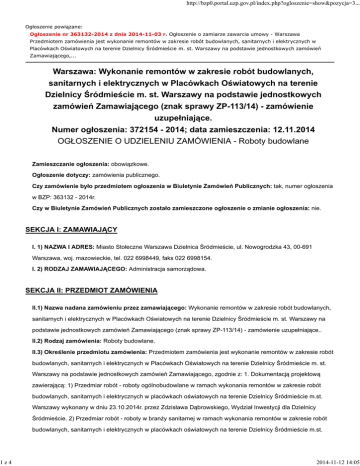 http://bzp0.portal.uzp.gov.pl/index.php?ogloszenie=show&pozycja=3... Ogłoszenie powiązane: Ogłoszenie nr 363132-2014 z dnia 2014-11-03 r. Ogłoszenie o zamiarze zawarcia umowy - Warszawa Przedmiotem zamówienia jest wykonanie remontów w zakresie robót budowlanych, sanitarnych i elektrycznych w Placówkach Oświatowych na terenie Dzielnicy Śródmieście m. st. Warszawy na podstawie jednostkowych zamówień Zamawiającego,... Warszawa: Wykonanie remontów w zakresie robót budowlanych, sanitarnych i elektrycznych w Placówkach Oświatowych na terenie Dzielnicy Śródmieście m. st. Warszawy na podstawie jednostkowych zamówień Zamawiającego (znak sprawy ZP-113/14) - zamówienie uzupełniające. Numer ogłoszenia: 372154 - 2014; data zamieszczenia: 12.11.2014 OGŁOSZENIE O UDZIELENIU ZAMÓWIENIA - Roboty budowlane Zamieszczanie ogłoszenia: obowiązkowe. Ogłoszenie dotyczy: zamówienia publicznego. Czy zamówienie było przedmiotem ogłoszenia w Biuletynie Zamówień Publicznych: tak, numer ogłoszenia w BZP: 363132 - 2014r. Czy w Biuletynie Zamówień Publicznych zostało zamieszczone ogłoszenie o zmianie ogłoszenia: nie. SEKCJA I: ZAMAWIAJĄCY I. 1) NAZWA I ADRES: Miasto Stołeczne Warszawa Dzielnica Śródmieście, ul. Nowogrodzka 43, 00-691 Warszawa, woj. mazowieckie, tel. 022 6998449, faks 022 6998154. I. 2) RODZAJ ZAMAWIAJĄCEGO: Administracja samorządowa. SEKCJA II: PRZEDMIOT ZAMÓWIENIA II.1) Nazwa nadana zamówieniu przez zamawiającego: Wykonanie remontów w zakresie robót budowlanych, sanitarnych i elektrycznych w Placówkach Oświatowych na terenie Dzielnicy Śródmieście m. st. Warszawy na podstawie jednostkowych zamówień Zamawiającego (znak sprawy ZP-113/14) - zamówienie uzupełniające.. II.2) Rodzaj zamówienia: Roboty budowlane. II.3) Określenie przedmiotu zamówienia: Przedmiotem zamówienia jest wykonanie remontów w zakresie robót budowlanych, sanitarnych i elektrycznych w Placówkach Oświatowych na terenie Dzielnicy Śródmieście m. st. Warszawy na podstawie jednostkowych zamówień Zamawiającego, zgodnie z: 1. Dokumentacją projektową zawierającą: 1) Przedmiar robót - roboty ogólnobudowlane w ramach wykonania remontów w zakresie robót budowlanych, sanitarnych i elektrycznych w placówkach oświatowych na terenie Dzielnicy Śródmieście m.st. Warszawy wykonany w dniu 23.10.2014r. przez Zdzisława Dąbrowskiego, Wydział Inwestycji dla Dzielnicy Śródmieście. 2) Przedmiar robót - roboty w branży sanitarnej w ramach wykonania remontów w zakresie robót budowlanych, sanitarnych i elektrycznych w placówkach oświatowych na terenie Dzielnicy Śródmieście m.st. 1z4 2014-11-12 14:05 http://bzp0.portal.uzp.gov.pl/index.php?ogloszenie=show&pozycja=3... Warszawy wykonany w dniu 23.10.2014r. przez Pawła Goniprowskiego, Wydział Inwestycji dla Dzielnicy Śródmieście. 3) Przedmiar robót - roboty w branży elektrycznej w ramach wykonania remontów w zakresie robót budowlanych, sanitarnych i elektrycznych w placówkach oświatowych na terenie Dzielnicy Śródmieście m.st. Warszawy wykonany w dniu 23.10.2014r. przez Arkadiusza Kieresia, Wydział Inwestycji dla Dzielnicy Śródmieście. 2. Specyfikacją techniczną wykonania i odbioru robót budowlanych dla wykonania drobnych remontów w zakresie robót budowlanych, sanitarnych i elektrycznych w placówkach oświatowych na terenie Dzielnicy Śródmieście m.st. Warszawy wykonana w dniu 24.01.2014r. przez Antoninę Kwaśniewską - Wójcicką. 3. Wykaz placówek oświatowych objętych przedmiotem umowy. Zamawiający dopuszcza rozwiązania równoważne opisanym w dokumentacji projektowej oraz specyfikacji technicznej wykonania i odbioru robót. Wykonawca, który powołuje się na rozwiązania równoważne do opisanych przez Zamawiającego jest obowiązany wykazać, że oferowane przez niego produkty, urządzenia i technologie spełniają wymagania określone przez Zamawiającego. W przypadku zaoferowania innych urządzeń niż określone w dokumentacji należy złożyć karty katalogowe tych urządzeń. W zakres zamówienia wchodzi wykonanie m.in.: 1) wykaz podstawowych robót objętych zamówieniem: - roboty ziemne; - roboty rozbiórkowe; - roboty murarskie; - roboty tynkarskie; - roboty okładzinowe ścian i posadzek; - roboty dotyczące stolarki drzwiowej i okiennej; - roboty malarskie z przygotowaniem powierzchni; - roboty stolarskie; - roboty ślusarskie; - roboty szklarskie; - roboty dekarskie i blacharskie; - roboty ciesielskie; - roboty izolacyjne; - roboty sanitarne; - roboty elektryczne; - roboty towarzyszące; - roboty tymczasowe związane z przygotowaniem i zabezpieczeniem pomieszczeń; a) roboty budowlane: - roboty ziemne polegające na odkopaniu fundamentów przy pracach izolacyjnych bądź drogowych, przy wymianie nawierzchni chodnika lub placu w rejonie placówek oświatowych; - w pomieszczeniach placówek oświatowych prace związane z poprawą ich stanu sanitarnego, polegające na wykonaniu prac tynkarskich i malarskich ścian i sufitów z ewentualnym wyburzeniem ścian działowych (remont sanitariatów); - roboty związane z wymianą okładzin ścian i podłóg (płytki terakoty i glazury, wykładzina PCV, wykładzina typu tarket, panele podłogowe, parkiet z deszczułek drewnianych); - wymiana stolarki drzwiowej i okiennej polegająca na demontażu i montażu nowych elementów wraz z pracami towarzyszącymi, - roboty stolarskie, ślusarskie i szklarskie polegające na wymianie poszczególnych elementów przy pracach remontowych pomieszczeń placówek oświatowych (wymiana szafek na pościel w pomieszczeniach przedszkolnych, montaż ścianek systemowych w pomieszczeniach sanitarnych montaż krat okiennych przy wymianie stolarki okiennej), - roboty dekarskie i blacharskie polegające na wykonaniu drobnych prac remontowych dachów i obróbek blacharskich przy wystąpieniu przecieków i nieszczelności, b) roboty elektryczne: - demontaż starych i montaż nowych instalacji, - dem