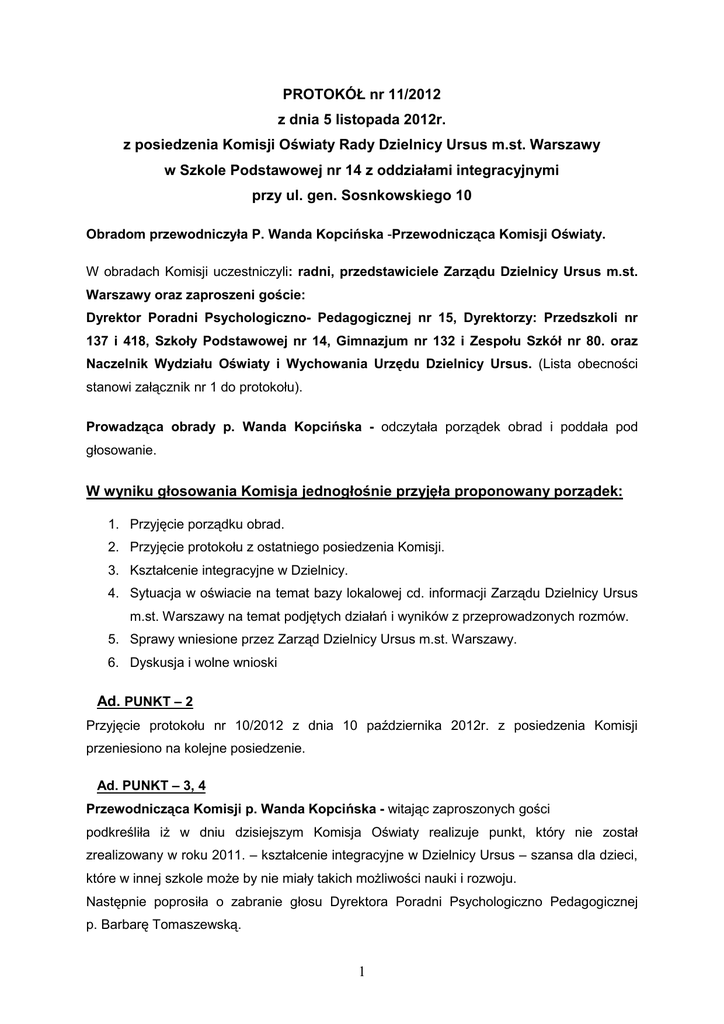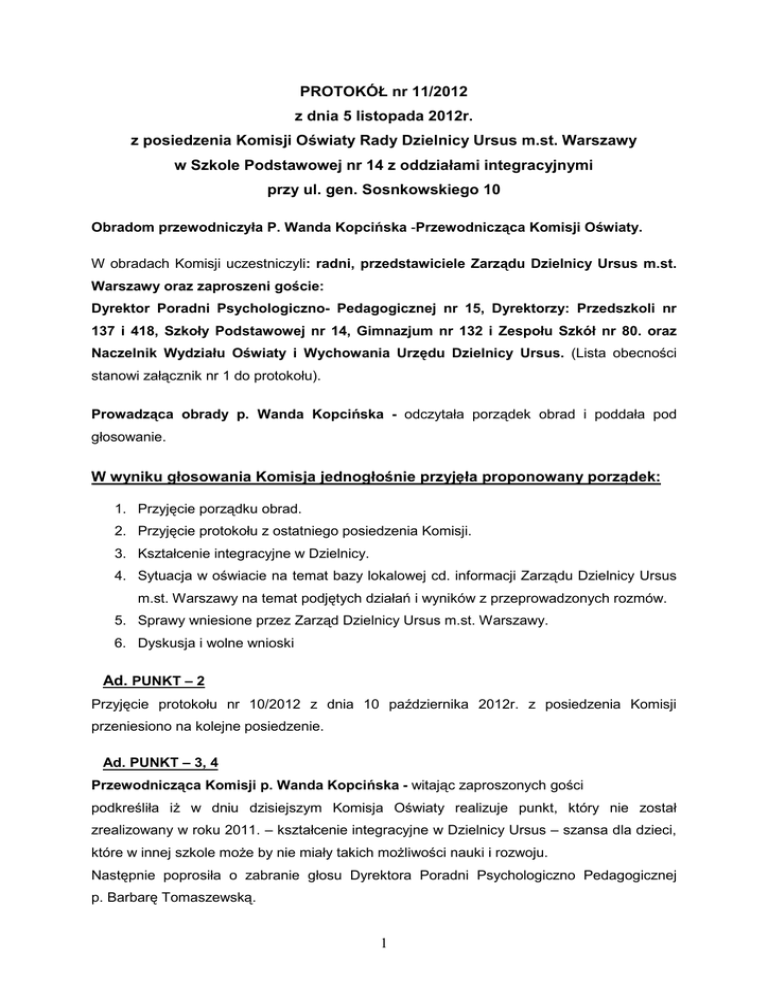 PROTOKÓŁ nr 11/2012 z dnia 5 listopada 2012r. z posiedzenia Komisji Oświaty Rady Dzielnicy Ursus m.st. Warszawy w Szkole Podstawowej nr 14 z oddziałami integracyjnymi przy ul. gen. Sosnkowskiego 10 Obradom przewodniczyła P. Wanda Kopcińska -Przewodnicząca Komisji Oświaty. W obradach Komisji uczestniczyli: radni, przedstawiciele Zarządu Dzielnicy Ursus m.st. Warszawy oraz zaproszeni goście: Dyrektor Poradni Psychologiczno- Pedagogicznej nr 15, Dyrektorzy: Przedszkoli nr 137 i 418, Szkoły Podstawowej nr 14, Gimnazjum nr 132 i Zespołu Szkół nr 80. oraz Naczelnik Wydziału Oświaty i Wychowania Urzędu Dzielnicy Ursus. (Lista obecności stanowi załącznik nr 1 do protokołu). Prowadząca obrady p. Wanda Kopcińska - odczytała porządek obrad i poddała pod głosowanie. W wyniku głosowania Komisja jednogłośnie przyjęła proponowany porządek: 1. Przyjęcie porządku obrad. 2. Przyjęcie protokołu z ostatniego posiedzenia Komisji. 3. Kształcenie integracyjne w Dzielnicy. 4. Sytuacja w oświacie na temat bazy lokalowej cd. informacji Zarządu Dzielnicy Ursus m.st. Warszawy na temat podjętych działań i wyników z przeprowadzonych rozmów. 5. Sprawy wniesione przez Zarząd Dzielnicy Ursus m.st. Warszawy. 6. Dyskusja i wolne wnioski Ad. PUNKT – 2 Przyjęcie protokołu nr 10/2012 z dnia 10 października 2012r. z posiedzenia Komisji przeniesiono na kolejne posiedzenie. Ad. PUNKT – 3, 4 Przewodnicząca Komisji p. Wanda Kopcińska - witając zaproszonych gości podkreśliła iż w dniu dzisiejszym Komisja Oświaty realizuje punkt, który nie został zrealizowany w roku 2011. – kształcenie integracyjne w Dzielnicy Ursus – szansa dla dzieci, które w innej szkole może by nie miały takich możliwości nauki i rozwoju. Następnie poprosiła o zabranie głosu Dyrektora Poradni Psychologiczno Pedagogicznej p. Barbarę Tomaszewską. 1 Dyrektor Poradni Psychologiczno-pedagogicznej nr 15 p. Barbara Tomaszewska poinformowała, że zarządzeniem dyrektora powołane zostały Zespoły do wydawania orzeczeń; o potrzebie kształcenia specjalnego dla dzieci i młodzieży niepełnosprawnej ruchowo, niesprawnej intelektualnie, z niepełnosprawnościami sprzężonymi, o potrzebie zajęć rewalidacyjnych indywidualnych lub grupowych dla dzieci z głębokim upośledzeniem umysłowym, do wydawania orzeczeń o potrzebie kształcenia specjalnego dla dzieci i młodzieży – zagrożonej niedostosowaniem społecznym, - niedostosowanych społecznie (nie są to dzieci niepełnosprawne i dlatego nie są one liczone jako jednostka do tworzenia klas integracyjnych - nie należy im się nauczyciel wspomagający), a socjoterapia, psychoterapia. Dla dzieci i młodzieży niesłyszącej i niewidzącej orzeczenia o potrzebie kształcenia specjalnego wydaje poradnia TOP przy ul. Raszyńskiej, a dla dzieci i młodzieży z Autyzmem i Zespołem Aspergera – poradnia nr 7 przy ul. Narbutta. W roku szkolnym 2011/2012 Zespół wydał 44 orzeczenia o potrzebie kształcenia, w roku szkolnym 2012/2013 wydano 3 orzeczenia. Podkreśliła, że Poradnia współpracuje z OPS, z Sądem Rodzinnym, Kuratorami i Rodzinnym Ośrodkiem Doradztwa Rodzinnego przy sądach rodzinnych oraz z poradniami zdrowia dla dzieci. Pomaga szukać dla uczniów odpowiednich szkół – na stronie internetowej poradni /www.poradnia14.pl/. Następnie poprosiła pedagoga p. Dorotę Kosno o udzielenie dodatkowych informacji w sprawie orzeczenia. Pedagog p. Dorota Kosno - poinformowała, że Zespół wydaje orzeczenia na podstawie rozporządzenia MEN z dnia 18 września 2008r. Aby uzyskać orzeczenie - rodzice lub prawni opiekunowie dziecka składają do Zespołu pisemny wniosek o wydanie orzeczenia. Jeśli oboje rodzice mają pełne prawa rodzicielskie, to wniosek wypełniony przez jedno z nich jest traktowany jako reprezentujący wolę zarówno matki jak i ojca. Do wniosku dołączają posiadaną dokumentację psychologicznych, uzasadniającą pedagogicznych, wniosek, lekarskich. w Jeśli szczególności wniosek wyniki dotyczy badań nauczania indywidualnego należy złożyć aktualne zaświadczenie lekarskie o stanie zdrowia ucznia określające czas niezdolności do uczestniczenia w zajęciach na terenie szkoły. Wnioski o nauczanie indywidualne muszą zawierać nazwę choroby (rozpoznanie) okres nauczania indywidualnego, informacja o miejscu nauczania w domu czy w szkole, czy należy włączyć dziecko w zajęcia z grupą rówieśniczą i w jakim zakresie. Jeśli rodzice nie posiadają dokumentacji psychologicznej i pedagogicznej badania niezbędne do wydania orzeczenia mogą być wykonane w poradni. Zespół przed podjęciem decyzji może zasięgnąć opinii nauczycieli uczących ucznia. W przypadku nieuwzględnienia wniosku Zespół wydaje orzeczenie odmowne. Przewodnicząca Komisji p. Wanda Kopcińska - podziękowała p. dyrektor za przybycie oraz informację a następnie udzieliła głosu p. Agacie Łopuszyńskiej. 2 Wicedyrektor szkoły i pedagog w Szkole Podstawowej nr 14 z oddziałami integracyjnymi p. Agata Łopuszyńska – podkreśliła, że pracuje w klasach integracyjnych od początku ich działalności tj. od 17 lat. Szkoła realizuje ideę integracji uczniów o specyficznych problemach edukacyjnych z innymi dziećmi. W placówce funkcjonuje 7 klas integracyjnych, uczy się w nich 138 uczniów, w tym 31 o specjalnych potrzebach edukacyjnych; z upośledzeniem umysłowym, z zaburzeniami zachowania, z autyzmem, z zespołem Aspergera, z niedosłuchem, z niedowidzeniem i z niepełnosprawnością ruchową. W klasach integracyjnych pracuje 40 nauczycieli: 5 - edukacji wczesnoszkolnej, 20 przedmiotów ogólnokształcących (języka polskiego, matematyki, przyrody, historii, języka angielskiego, muzyki, plastyki, techniki, wf, religii), 15 - specjalistów (nauczycieli wspomagających, rehabilitantów, logopedów, psychologów, reedukatorów, terapeutów). Pierwsza klasa integracyjna była również pierwszą klasą integracyjną w dz