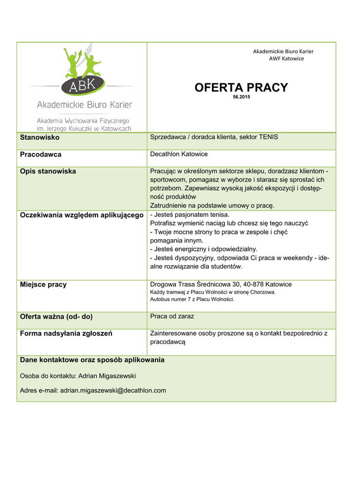 Akademickie Biuro Karier AWF Katowice OFERTA PRACY 56.2015 Stanowisko Sprzedawca / doradca klienta, sektor TENIS Pracodawca Decathlon Katowice Opis stanowiska Pracując w określonym sektorze sklepu, doradzasz klientom sportowcom, pomagasz w wyborze i starasz się sprostać ich potrzebom. Zapewniasz wysoką jakość ekspozycji i dostępność produktów Zatrudnienie na podstawie umowy o pracę. - Jesteś pasjonatem tenisa. Potrafisz wymienić naciąg lub chcesz się tego nauczyć - Twoje mocne strony to praca w zespole i chęć pomagania innym. - Jesteś energiczny i odpowiedzialny. - Jesteś dyspozycyjny, odpowiada Ci praca w weekendy - idealne rozwiązanie dla studentów. Oczekiwania względem aplikującego Miejsce pracy Drogowa Trasa Średnicowa 30, 40-878 Katowice Każdy tramwaj z Placu Wolności w stronę Chorzowa. Autobus numer 7 z Placu Wolności. Oferta ważna (od- do) Praca od zaraz Forma nadsyłania zgłoszeń Zainteresowane osoby proszone są o kontakt bezpośrednio z pracodawcą Dane kontaktowe oraz sposób aplikowania Osoba do kontaktu: Adrian Migaszewski Adres e-mail: [email protected]