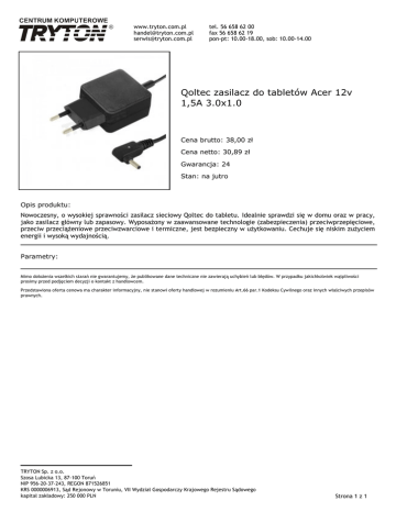 www.tryton.com.pl [email protected] [email protected] tel. 56 658 62 00 fax 56 658 62 19 pon-pt: 10.00-18.00, sob: 10.00-14.00 Qoltec zasilacz do tabletów Acer 12v 1,5A 3.0x1.0 Cena brutto: 38,00 zł Cena netto: 30,89 zł Gwarancja: 24 Stan: na jutro Opis produktu: Nowoczesny, o wysokiej sprawności zasilacz sieciowy Qoltec do tabletu. Idealnie sprawdzi się w domu oraz w pracy, jako zasilacz główny lub zapasowy. Wyposażony w zaawansowane technologie (zabezpieczenia) przeciwprzepięciowe, przeciw przeciążeniowe przeciwzwarciowe i termiczne, jest bezpieczny w użytkowaniu. Cechuje się niskim zużyciem energii i wysoką wydajnością. Parametry: Mimo dołożenia wszelkich starań nie gwarantujemy, że publikowane dane techniczne nie zawierają uchybień lub błędów. W przypadku jakichkolwiek wątpliwości prosimy przed podjęciem decyzji o kontakt z handlowcem. Przedstawiona oferta cenowa ma charakter informacyjny, nie stanowi oferty handlowej w rozumieniu Art.66 par.1 Kodeksu Cywilnego oraz innych właściwych przepisów prawnych. TRYTON Sp. z o.o. Szosa Lubicka 13, 87-100 Toruń NIP 956-20-37-243, REGON 871526851 KRS 0000006913, Sąd Rejonowy w Toruniu, VII Wydział Gospodarczy Krajowego Rejestru Sądowego kapitał zakładowy: 250 000 PLN Strona 1 z 1