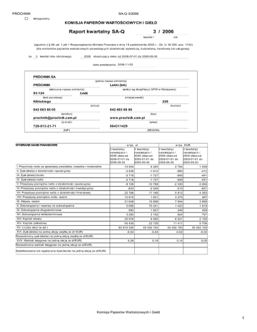 PRÓCHNIK SA-Q 3/2006 skorygowany KOM ISJA PAPIERÓW WARTOŚCIOWYCH I GIEŁD Raport kwartalny SA-Q 3 / 2006 kwartał / rok (zgodnie z § 86 ust. 1 pkt 1 Rozporządzenia Ministra Finansów z dnia 19 października 2005 r. - Dz. U. Nr 209, poz. 1744) (dla emitentów papierów wartośc iowyc h prowadząc ych działalność wytwórczą, budowlaną, handlową lub usługową) za 2006 obejmujący okres od 2006-07-01 do 2006-09-30 3 kwartał roku obrotowego data przekazania: 2006-11-03 PRÓCHNIK SA (pełna nazwa emitenta) PRÓCHNIK Lekki (lek) (skróc ona nazwa emitenta) 93-124 (sektor wg klasyfikac ji GPW w Warszawie) Łódź (kod poc ztowy) (miejscowość) Kilińskiego 228 (ulic a) 042 683 66 05 (numer) 042 683 66 06 (telefon) (fax) [email protected] www.prochnik.com.pl (e-mail) (www) 728-013-21-71 004311429 (NIP) (REGON) WYBRANE DANE FINANSOWE w tys. zł 3 kwartał(y) narastając o / 2006 okres od 2006-01-01 do 2006-09-30 w tys. EUR 3 kwartał(y) narastająco / 2005 okres od 2005-01-01 do 2005-09-30 3 kwartał(y) narastająco / 2006 okres od 2006-01-01 do 2006-06-30 3 kwartał(y) narastając o / 2005 okres od 2005-01-01 do 2005-09-30 I. Przychody netto ze sprzedaŜy produktów, towarów i materiałów 10 944 6 265 2 794 1 599 II. Zysk (strata) z działalnośc i operacyjnej -3 838 -1 612 -980 -412 III. Zysk (strata) brutto -3 716 -1 727 -949 -441 IV. Zysk (strata) netto -3 716 -1 727 -949 -441 V. Przepływy pienięŜne netto z działalnośc i operacyjnej -9 128 -12 788 -2 330 -3 265 VI. Przepływy pienięŜne netto z działalności inwestycyjnej -823 -2 549 -210 -651 VII. Przepływy pienięŜne netto z działalności finansowej 22 766 17 168 5 812 4 383 VIII. Przepływy pienięŜne netto, razem 12 815 1 831 3 272 467 IX. Aktywa, razem 31 646 15 806 7 944 3 968 X. Zobowiązania i rezerwy na zobowiązania 5 668 70 241 1 423 1 818 XI. Zobowiązania długoterminowe 993 1 827 249 459 XII. Zobowiązania krótkoterminowe 3 283 3 152 824 791 25 978 8 565 6 521 2 150 XIII. Kapitał własny XIV. Kapitał zakładowy XV. Liczba akcji (w szt.) XVI. Zysk (strata) na jedną akcję zwykłą (w zł/ EUR) 45 455 22 728 11 411 5 706 90 910 300 45 455 150 45 455 150 45 455 150 -0,04 -0,04 -0,02 -0,02 0,29 0,19 0,14 0,05 Rozwodniony zysk (strata) na jedną akcję zwykłą (w zł/EUR) XVII. Wartość księgowa na jedną akcję (w zł/EUR) Rozwodniona wartość księgowa na jedną akcję (w zł/EUR) Zadeklarowana lub wypłac ona dywidenda na jedną akcję (w zł/EUR) Komisja Papierów Wartościowych i Giełd 1 PRÓCHNIK SA-Q 3/2006 BILANS w tys. zł stan na stan na 2006-09-30 2006-06-30 koniec kwartału / koniec poprz. 2006 kwartału / 2006 stan na stan na 2005-12-31 2005-09-30 koniec poprz. roku koniec kwartału / / 2005 2005 AKTYWA I. Aktywa trwałe 5 968 5 675 5 416 76 57 78 64 5 715 5 441 5 289 4 555 3. Inwestyc je długoterminowe 177 177 49 70 3.1. Długoterminowe aktywa finansowe 177 177 49 70 a) w jednostkac h powiązanyc h, w tym: 177 177 49 70 25 678 27 837 10 049 11 117 1. Zapasy 7 454 5 468 4 104 4 018 2. NaleŜnośc i krótkoterminowe 4 738 3 988 4 786 3 724 2.1. Od pozostałych jednostek 4 738 3 988 4 786 3 724 3. Inwestyc je krótkoterminowe 13 374 18 171 981 3 364 3.1. Krótkoterminowe aktywa finansowe 13 374 18 171 981 3 364 22 22 445 1 445 13 352 18 149 536 1 919 112 210 178 46 31 646 33 512 15 465 15 806 1. Wartośc i niematerialne i prawne, w tym: 2. Rzeczowe aktywa trwałe II. Aktywa obrotowe a) w pozostałyc h jednostkach b) środki pienięŜne i inne aktywa pienięŜne 4. Krótkoterminowe rozlic zenia międzyokresowe A kt y w a ra z e m 4 689 PASYWA I. Kapitał własny 25 978 3 403 6 968 8 565 45 455 22 728 22 728 22 728 2. Kapitał zapasowy 166 163 163 163 3. Kapitał z aktualizacji wyc eny 365 368 368 368 -16 292 -16 292 -12 997 -12 967 -3 716 -3 564 -3 294 -1 727 5 668 30 109 8 497 7 241 1 331 1 595 1 573 1 345 1.1. Rezerwa na świadc zenia emerytalne i podobne 562 756 738 597 a) długoterminowa 428 469 455 389 b) krótkoterminowa 134 287 283 208 1.2. Pozostałe rezerwy 769 840 835 748 a) krótkoterminowe 769 840 835 748 993 993 1 445 1 827 1. Kapitał zakładowy 4. Zysk (strata) z lat ubiegłych 5. Zysk (strata) netto II. Zobowiązania i rezerwy na zobowiązania 1. Rezerwy na zobowiązania 2. Zobowiązania długoterminowe 2.1. Wobec pozostałych jednostek 993 993 1 445 1 827 3 283 26 567 4 525 3 152 33 96 2 947 26 077 4 255 2 813 303 394 270 339 4. Rozlic zenia międzyokresowe 61 954 954 917 4.1. Inne rozliczenia międzyokresowe 61 954 954 917 61 954 954 31 646 33 512 15 465 3. Zobowiązania krótkoterminowe 3.1. Wobec jednostek powiązanych 3.2. Wobec pozostałych jednostek 3.3. Fundusze specjalne a) długoterminowe b) krótkoterminowe P a sy w a ra z e m Wartość księgowa Lic zba akc ji (w szt.) Wartość księgowa na jedną akcję (w zł) 917 15 806 25 978 3 403 6 968 8 565 90 910 300 45 455 150 45 455 150 45 455 150 0,29 0,07 0,15 0,19 Uwaga! W przypadku raportów za I kwartał roku obrotowego, naleŜy wypełnić jedynie pierwszą (stan na koniec I kwartału bieŜącego roku obrotowego), trzec ią (stan na koniec poprzedniego roku obrotowego) i c zwartą kolumnę (stan na koniec I kwartału poprzedniego roku obrotowego). Komisja Papierów Wartościowych i Giełd 2 PRÓCHNIK SA-Q 3/2006 POZYCJE POZABILANSOWE w tys. zł stan na stan na 2006-09-30 2006-06-30 koniec kwartału / koniec poprz. 2006 kwartału / 2006 stan na stan na 2005-12-31 2006-09-30 koniec poprz. roku koniec kwartału / / 2005 2005 1. Zobowiązania warunkowe 100 100 100 100 1.1. Na rzec z jednostek powiązanych (z tytułu) 100 100 100 100 100 100 100 100 100 100 100 100 - udzielonych gwaranc ji i poręczeń Pozyc je pozabilansowe, razem Uwaga! W przypadku raportów za I kwartał roku obrotowego, naleŜy wypełnić jedynie pierwszą (stan na koniec I kwartału bieŜącego roku obrotowego), trzec ią (stan na koniec poprzedniego roku obrotowego) i c zwartą kolumnę (stan na koniec I kwartału poprzedniego roku obrotowego).