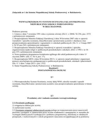 Załącznik nr 1 do Statutu Niepublicznej Szkoły Podstawowej w Bełchatowie. WEWNĄTRZSZKOLNY SYSTEM OCENIANIA I KLASYFIKOWANIA NIEPUBLICZNEJ SZKOŁY PODSTAWOWEJ W BEŁCHATOWIE. Podstawa prawna: 1. Ustawa z dnia 7 września 1991 roku o systemie oświaty (Dz.U. z 2004r. Nr 256, poz. 2572 z późniejszymi zmianami). 2. Rozporządzenie Ministra Edukacji Narodowej z dnia 30 kwietnia 2007 roku w sprawie warunków i sposobu oceniania, klasyfikowania i promowania uczniów i słuchaczy oraz przeprowadzania sprawdzianów i egzaminów w szkołach publicznych ( Dz. U. z 11maja 2007 r, Nr 83 poz.562 z późniejszymi zmianami). 3. Rozporządzenie Ministra Edukacji Narodowej w sprawie warunków i sposobu organizowania nauki religii w publicznych przedszkolach i szkołach. (DzU z 1992 r. nr 36 poz.155 z późniejszymi zmianami). 4. Nowa podstawa programowa kształcenia ogólnego dla szkół podstawowych z dnia 15 stycznia 2009 r. (Dz. U. Nr 4, poz. 17). 5. Rozporządzenie MEN z dnia 30 kwietnia 2013 r. w sprawie zasad udzielania i organizacji pomocy psychologiczno-pedagogicznej w publicznych przedszkolach, szkołach i placówkach (Dz. U. z dnia 7 maja 2013 r. poz. 532). 6. Statut Niepublicznej Szkoły Podstawowej w Bełchatowie. Rozdział I POSTANOWIENIA OGÓLNE §1 1.1Wewnątrzszkolny System Oceniania, zwany dalej WSO, określa warunki i sposób oceniania, klasyfikowania i promowania uczniów oraz przeprowadzania sprawdzianu w klasie szóstej. §2 Przedmiot, cele i zadania oceniania wewnątrzszkolnego 2.1.Ocenianiu podlegają: 1) osiągnięcia edukacyjne ucznia; 2) zachowanie ucznia. 2.2 Ocenianie osiągnięć edukacyjnych ucznia polega na rozpoznawaniu przez nauczycieli poziomu i postępów w opanowaniu przez ucznia wiadomości i umiejętności w stosunku do wymagań edukacyjnych wynikających z podstawy programowej, określonej w odrębnych przepisach, i realizowanych w szkole programów nauczania uwzględniających tę podstawę. 2.3.Ocenianie zachowania ucznia polega na rozpoznawaniu przez wychowawcę klasy, nauczycieli oraz uczniów danej klasy stopnia respektowania przez ucznia zasad współżycia społecznego i norm etycznych oraz obowiązków ucznia określonych w regulaminie szkoły. 2.4 Ocenianie wewnątrzszkolne ma na celu: a) informowanie ucznia o poziomie jego osiągnięć edukacyjnych i jego zachowaniu oraz o postępach w tym zakresie; b) udzielanie uczniowi pomocy w samodzielnym planowaniu swojego rozwoju; c) motywowanie ucznia do dalszych postępów w nauce i zachowaniu; d) dostarczenie rodzicom (prawnym opiekunom) i nauczycielom informacji o postępach, trudnościach w nauce, zachowaniu oraz specjalnych uzdolnieniach ucznia; e) umożliwienie nauczycielom doskonalenia organizacji i metod pracy dydaktycznowychowawczej. 2.5 Ocenianie wewnątrzszkolne obejmuje: a) formułowanie przez nauczycieli wymagań edukacyjnych niezbędnych do uzyskania poszczególnych śródrocznych i rocznych ocen klasyfikacyjnych z obowiązkowych i dodatkowych zajęć edukacyjnych; b) ustalanie kryteriów oceniania zachowania; c) ocenianie bieżące i ustalanie śródrocznych ocen klasyfikacyjnych z obowiązkowych i dodatkowych zajęć edukacyjnych oraz śródrocznej oceny klasyfikacyjnej zachowania, według skali i w formach przyjętych w szkole; d) przeprowadzanie egzaminów klasyfikacyjnych, poprawkowych oraz sprawdzianu po klasie VI szkoły podstawowej. e) ustalanie rocznych ocen klasyfikacyjnych z obowiązkowych i dodatkowych zajęć edukacyjnych oraz rocznej oceny klasyfikacyjnej zachowania; f) ustalanie warunków i trybu uzyskania wyższych niż przewidywane rocznych ocen klasyfikacyjnych z obowiązkowych i dodatkowych zajęć edukacyjnych oraz rocznej oceny klasyfikacyjnej zachowania; g) ustalanie warunków i sposobu przekazywania rodzicom (prawnym opiekunom) informacji o postępach i trudnościach ucznia w nauce. h) ustalanie warunków i trybu uzyskania wyższych niż przewidywane rocznych ocen. 2.6 Informowanie rodziców i uczniów o przepisach WSO. 1. Nauczyciele na początku każdego roku szkolnego informują uczniów o: a) wymaganiach edukacyjnych niezbędnych do uzyskania poszczególnych śródrocznych i rocznych ocen klasyfikacyjnych z obowiązkowych i dodatkowych zajęć edukacyjnych, wynikających z realizowanego przez siebie programu nauczania, b) sposobach sprawdzania osiągnięć edukacyjnych uczniów. Fakt ten nauczyciele odnotowują w dzienniku lekcyjnym. 2. Wychowawca klasy na pierwszym w danym roku szkolnym zebraniu z rodzicami informuje ich o kryteriach oceniania zachowania, o warunkach i trybie uzyskania wyższej niż przewidywana rocznej oceny klasyfikacyjnej zachowania oraz rocznej oceny klasyfikacyjnej z obowiązkowych i dodatkowych zajęć edukacyjnych, a także o skutkach ustalenia uczniowi nagannej rocznej oceny klasyfikacyjnej zachowania. 3. Rodzice zostają także powiadomieni o możliwości zapoznania się z: 1) Wewnątrzszkolnym Systemem Oceniania; 2) wymaganiami edukacyjnymi niezbędnymi do uzyskania poszczególnych śródrocznych i rocznych ocen klasyfikacyjnych. Wymagania te opracowują nauczyciele prowadzący poszczególne obowiązkowe i dodatkowe zajęcia edukacyjne. 4. Sposoby informowania rodziców o efektach pracy ich dzieci: 1) zebrania klasowe – co najmniej cztery razy w roku, 2) indywidualne rozmowy w terminie ustalonym przez wychowawcę (fakt ten odnotowany jest w dzienniku lekcyjnym), 3) rozmowa telefoniczna, 4) korespondencja listowna, 5) adnotacje w zeszycie przedmiotowym, 6) adnotacje w dzienniczku ucznia. §3 Szczególne warunki oceniania 1. Nauczyciel jest zobowiązany, na podstawie opinii publicznej poradni psychologicznopedagogicznej, w tym publicznej poradni specjalistycznej, dostosować wymagania edukacyjne, o których mowa w §7 ust. 1 do indywidualnych potrzeb psychofizycznych i edukacyjnych ucznia, u którego stwierdzono zaburzenia i odchylenia rozwojowe lub specyficzne trudności w uczeniu się, uniemożliwiające sprostanie tym wymaganiom. 2. Dosto