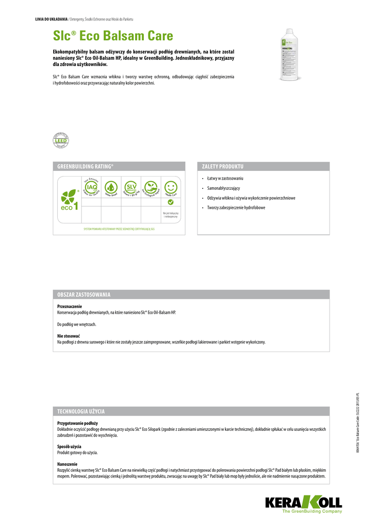 Linia do Układania / Detergenty, Środki Ochronne oraz Woski do Parkietu Slc® Eco Balsam Care Ekokompatybilny balsam odżywczy do konserwacji podłóg drewnianych, na które zostal naniesiony Slc® Eco Oil-Balsam HP, idealny w GreenBuilding. Jednoskładnikowy, przyjazny dla zdrowia użytkowników. NT R I BUTES PO TO INTS lit REDUCED W ater Based lve n t ≤ 8 0 g/ Ec • Samonabłyszczający ct y VOC pa IAQ r Air Qua Low SLV So Ind oo • Łatwy w zastosowaniu Emissio kg ow Zalety Produktu n L GreenBuilding Rating® ological Im 1 He a lth Care • Odżywia włókna i ożywia wykończenie powierzchniowe • Tworzy zabezpieczenie hydrofobowe Nie jest toksyczny i niebezpieczny SYSTEM POMIARU ATESTOWANY PRZEZ JEDNOSTKĘ CERTYFIKUJĄCĄ SGS Obszar zastosowania Przeznaczenie Konserwacja podłóg drewnianych, na które naniesiono Slc® Eco Oil-Balsam HP. Do podłóg we wnętrzach. Nie stosować Na podłogi z drewna surowego i które nie zostały jeszcze zaimpregnowane, wszelkie podłogi lakierowane i parkiet wstępnie wykończony. Technologia użycia Przygotowanie podłoży Dokładnie oczyścić podłogę drewnianą przy użyciu Slc® Eco Silopark (zgodnie z zaleceniami umieszczonymi w karcie technicznej), dokładnie spłukać w celu usunięcia wszystkich zabrudzeń i pozostawić do wyschnięcia. Sposób użycia Produkt gotowy do użycia. Nanoszenie Rozpylić cienką warstwę Slc® Eco Balsam Care na niewielką część podłogi i natychmiast przystępować do polerowania powierzchni podłogi Slc® Pad białym lub płaskim, miękkim mopem. Polerować, pozostawiając cienką i jednolitą warstwę produktu, zwracając na uwagę by Slc® Pad biały lub mop były jednolicie, ale nie nadmiernie nasączone produktem. 00641Slc® Eco Balsam Care Code: SLC222 2013/05-PL CO Slc® Eco Balsam Care wzmacnia włókna i tworzy warstwę ochronną, odbudowując ciągłość zabezpieczenia i hydrofobowości oraz przywracając naturalny kolor powierzchni. Inne wskazówki Dla uzyskania jednorodnego wykończenia należy nanosić warstwy o takiej samej grubości i przestrzegać zalecanych ilości. Dla oczyszczenia podłóg, na które naniesiono Slc® Eco Balsam Care stosować Slc® Eco Silopark zgodnie ze wskazówkami zamieszczonymi w karcie technicznej produktu. W zależności od warunków użytkowania, nanosić ponownie Slc® Eco Balsam Care, co jakiś czas i gdy jest to konieczne, po uprzednim przygotowaniu powierzchni parkietu. Dane techniczne wg Normy Jakości Kerakoll Wygląd Opakowanie Przechowywanie Uwagi Temperatura użycia Wysychanie Wydajność biały przezroczysty płyn opakowania 1 l ≈ 12 miesięcy w oryginalnym opakowaniu i suchym miejscu chronić przed mrozem, bezpośrednim nasłonecznieniem i źródłami ciepła od +10 °C do +30 °C ≈6h ≈ 15 ml/m2 na warstwę Dane uzyskane w temp. +23 °C, przy wilgotności względnej 50% i przy braku wentylacji. Dane mogą ulec zmianie w zależności od warunków panujących na budowie: temperatury, wentylacji i nasiąkliwości podłoża. - Produkt do użytku profesjonalnego - przestrzegać wszelkich norm i przepisów krajowych - w razie potrzeby zażądać karty bezpieczeństwa - nie chodzić po podłodze przed jej całkowitym wyschnięciem - pozostałości produktu oraz narzędzia, pył drzewny, tkaniny bawełniane, papier i podobne, nasączone produktem i pozostawione w normalnych warunkach mogą spowodować samozapłon, konieczne jest, aby przed utylizacją zwilżyć je wodą i pozostawić do wyschnięcia na obszarach bez niebezpieczeństwa zapłonu - w razie potrzeby zażądać karty bezpieczeństwa - w przypadku innych wątpliwości prosimy o kontakt z Kerakoll Worldwide Global Service +48 42 225 17 00 - [email protected] Dane dotyczące klasyfikacji Eco i Bio odnoszą się do GreenBuilding Rating® Manual 2012. Niniejsze informacje zostały uaktualnione w kwietniu 2013 (ref. GBR Data Report - 05.13); precyzuje się, że mogą one podlegać w miarę upływu czasu uzupełnieniom i/lub zmianom przeprowadzanym przez KERAKOLL SpA; celem zapoznania się z ewentualnymi aktualizacjami zapraszamy na stronę www.kerakoll.com. Z tego to powodu firma KERAKOLL SpA jest odpowiedzialna za ważność, aktualność i uaktualnienia własnych informacji jedynie w takim przypadku, gdy zostały one zaczerpnięte z jej własnych stron internetowych. Karta techniczna jest opracowana na podstawie naszej najlepszej wiedzy technicznej i praktycznej. Ponieważ jednak nie możemy bezpośrednio wpływać na warunki budowy i sposób wykonywania prac, zastrzegamy, że są to wskazówki o charakterze ogólnym, które nie zobowiązują w żaden sposób naszej firmy. Dlatego zalecamy przeprowadzenie próby w celu sprawdzenia przydatności produktu do przewidywanego zastosowania. KERAKOLL POLSKA Sp. z o.o. ul. Katowicka 128 – 95-030 Rzgów, Polska Tel. +48 42 225 17 00 – Fax +48 42 225 17 01 e-mail: [email protected] 00641Slc® Eco Balsam Care Code: SLC222 2013/05-PL Uwagi