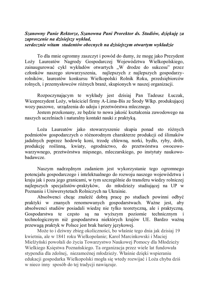 Szanowny Panie Rektorze, Szanowna Pani Prorektor ds. Studiów, dziękuję za zaproszenie na dzisiejszy wykład, serdecznie witam studentów obecnych na dzisiejszym otwartym wykładzie To dla mnie ogromny zaszczyt i powód do dumy, że mogę jako Prezydent Loży Laureatów Nagrody Gospodarczej Województwa Wielkopolskiego, zainaugurować cykl wykładów otwartych „W drodze do sukcesu” przez członków naszego stowarzyszenia, najlepszych z najlepszych gospodarzyrolników, laureatów konkursu Wielkopolski Rolnik Roku, przedsiębiorców rolnych, i przemysłowców różnych branż, skupionych w naszej organizacji. Rozpoczynającym te wykłady jest dzisiaj Pan Tadeusz Łuczak, Wiceprezydent Loży, właściciel firmy A-Lima-Bis ze Środy Wlkp. produkującej wozy paszowe, urządzenia do udoju i przetwórstwa mlecznego. Jestem przekonany, ze będzie to nowa jakość kształcenia zawodowego na naszych uczelniach i naturalny kontakt nauki z praktyką. Loża Laureatów jako stowarzyszenie skupia ponad sto różnych podmiotów gospodarczych o różnorodnym charakterze produkcji od ślimaków jadalnych poprzez hodowlę koni, trzodę chlewną, norki, bydło, ryby, drób, produkcję roślinną, kwiaty, ogrodnictwo, do przetwórstwa owocowowarzywnego, przetwórstwa mięsnego, mleczarskiego, po instytuty naukowobadawcze. Naszym nadrzędnym zadaniem jest wykorzystanie tego ogromnego potencjału gospodarczego i intelektualnego do rozwoju naszego województwa i kraju jak i poza jego granicami, w tym szczególnie do transferu wiedzy rolniczej najlepszych specjalistów-praktyków, do młodzieży studiującej na UP w Poznaniu i Uniwersytetach Rolniczych na Ukrainie. Absolwenci chcąc znaleźć dobrą pracę po studiach powinni odbyć praktyki w znanych renomowanych gospodarstwach. Ważne jest, aby absolwenci studiów posiadali wiedzę nie tylko teoretyczną, ale i praktyczną. Gospodarstwa te często są na wyższym poziomie technicznym i technologicznym niż gospodarstwa niektórych krajów UE. Bardzo ważną przewagą praktyk w Polsce jest brak bariery językowej. Może to i dziwny zbieg okoliczności, bo właśnie tego dnia jak dzisiaj 19 kwietnia, ale w 1841 roku Wielkopolanie; Karol Marcinkowski i Maciej Mielżyński powołali do życia Towarzystwo Naukowej Pomocy dla Młodzieży Wielkiego Księstwa Poznańskiego. Ta organizacja przez wiele lat fundowała stypendia dla zdolnej, niezamożnej młodzieży. Właśnie dzięki wspieraniu edukacji gospodarka Wielkopolski mogła się wtedy rozwijać i Loża chyba dziś w nieco inny sposób do tej tradycji nawiązuje. Uważamy bowiem, że właśnie zdolna, dobrze wyedukowana młodzież jest najważniejszym kapitałem dla rozwijającego się biznesu, dzięki któremu polskie firmy mogą z sukcesem konkurować na rynkach UE i świata. Dzisiaj z ogromną satysfakcją mogę Państwu tez oznajmić, że po kilku latach prac i dyskusji została utworzona na bazie gospodarstw laureatów konkursu Wielkopolski Rolnik Roku, członków naszego stowarzyszenia, grupa 70 Gospodarstw Demonstracyjnych, która w maju br. otrzyma Certyfikat Gospodarstwa Demonstracyjnego. W tych gospodarstwach będą podnosić swoje kwalifikacje rolnicze doradcy Wielkopolskiego Ośrodka Doradztwa Rolniczego a studenci Uniwersytetu Przyrodniczego i Ukrainy, będą odbywać praktyki zawodowe, magistranci pisać swoje prace pod nadzorem naukowym kadry dydaktycznej Uniwersytetu, których tematy będą powstawać z udziałem właściciela gospodarstwa, a wyniki tych prac nie trafią tylko na biblioteczne półki, ale zostaną także wykorzystane do dalszego rozwoju tego gospodarstwa. Na zakończenie pragnę serdecznie podziękować Panu Rektorowi Uniwersytetu Przyrodniczemu Prof. dr hab. Grzegorzowi Skrzypczakowi i Pani Prorektor ds. Studiów Prof. dr hab. Monice Kozłowskiej za współpracę z Lożą dla dobra i rozwoju naszego rolnictwa i regionu-wielkie dzięki . Na zakończenie Prezydent przy wykorzystaniu slajdów scharakteryzował cztery gospodarstwa laureatów WRR tj. Rajmunda Gąsiorka, Henryka Święcickiego, własną RSP „Zdrowie” w Izdebnie i Zakładu Doświadczalnego Instytutu Zootechniki w Pawłowicach.