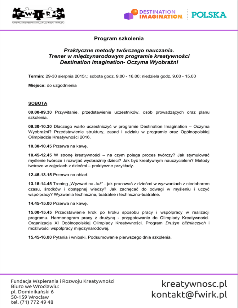 Program szkolenia Praktyczne metody twórczego nauczania. Trener w międzynarodowym programie kreatywności Destination Imagination- Oczyma Wyobraźni Termin: 29-30 sierpnia 2015r.; sobota godz. 9.00 - 16.00; niedziela godz. 9.00 - 15.00 Miejsce: do uzgodnienia SOBOTA 09.00-09.30 Przywitanie, przedstawienie uczestników, osób prowadzących oraz planu szkolenia. 09.30-10.30 Dlaczego warto uczestniczyć w programie Destination Imagination – Oczyma Wyobraźni? Przedstawienie struktury, zasad i udziału w programie oraz Ogólnopolskiej Olimpiadzie Kreatywności 2016. 10.30-10.45 Przerwa na kawę. 10.45-12.45 W stronę kreatywności – na czym polega proces twórczy? Jak stymulować myślenie twórcze i rozwijać wyobraźnię dzieci? Jak być kreatywnym nauczycielem? Metody twórcze w zajęciach z dziećmi – praktyczne przykłady. 12.45-13.15 Przerwa na obiad. 13.15-14.45 Trening „Wyzwań na Już” - jak pracować z dziećmi w wyzwaniach z niedoborem czasu, środków i dostępnej wiedzy? Jak zachęcać do odwagi w myśleniu i uczyć współpracy? Wyzwania techniczne, teatralne i techniczno-teatralne. 14.45-15.00 Przerwa na kawę. 15.00-15.45 Przedstawienie krok po kroku sposobu pracy i współpracy w realizacji programu. Harmonogram pracy z drużyną - przygotowanie do Olimpiady Kreatywności. Organizacja XI Ogólnopolskiej Olimpiady Kreatywności. Program Drużyn bliźniaczych i możliwości współpracy międzynarodowej. 15.45-16.00 Pytania i wnioski. Podsumowanie pierwszego dnia szkolenia. NIEDZIELA 9.00-10.30 Rola nauczyciela - Trenera w programie. Budowanie zespołu, motywowanie dzieci na różnych etapach przygotowań. Organizacja i przebieg zajęć. Ważne pytania i odpowiedzi Trenera drużyny. 10.30-10.45 Przerwa na kawę 10.45-12.15 „Gra edukacyjna jako narzędzie pracy nauczyciela” – czym jest gra? Obszary wykorzystywania gier i korzyści płynące z ich zastosowania w nauczaniu. Rodzaje gier oraz ich elementy właściwe w pracy z dziećmi. 12.15-12.30 Przerwa na obiad 12.30-14.30 Trening „Wyzwań drużynowych”- jak pracować z drużyną nad rozwiązaniem wyzwania z elementami technicznymi i konstrukcyjnymi, z wykorzystaniem wiedzy na temat dzieł sztuki, literatury, filmu czy teatru? Jak stymulować twórcze pytania i znajdować na nie zaskakujące i trafne odpowiedzi – generowanie pomysłów rozwiązań do Wyzwania Drużynowego. 14.30-15.00 Podsumowanie i zakończenie. Wręczenie materiałów i zaświadczeń. Więcej informacji na stronie www.kreatywnosc.pl oraz www.destinationimagination.org Dlaczego warto? Uczestnicy szkolenia otrzymują: 1. możliwość uczestnictwa w największym międzynarodowym edukacyjnym programie kreatywności oraz reprezentowania i promocji przedszkola/szkoły w kraju i za granicą, 2. tytuł Trenera Programu Destination Imagination oraz uprawnienie do prowadzenia drużyny/drużyn w programie, 3. zaświadczenie o odbytym szkoleniu, 4. materiały zawierające wszystkie treści i ćwiczenia ze szkolenia, 5. nowe metody i materiały do pracy z dziećmi.