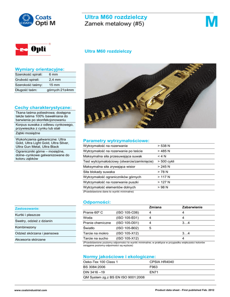 Ultra M60 rozdzielczy Zamek metalowy (#5) M Ultra M60 rozdzielczy Wymiary orientacyjne: Szerokość spirali: 6 mm Grubość spirali: 2,4 mm Szerokość taśmy: 15 mm Długość taśm: górnych:21±4mm Cechy charakterystyczne: Tkana taśma poliestrowa; dostępna także taśma 100% bawełniana do barwienia po skonfekcjonowaniu Korpus suwaka z odlewu cynkowego, przywieszka z cynku lub stali Ząbki mosiężne Wykończenia galwaniczne: Ultra Gold, Ultra Light Gold, Ultra Silver, Ultra Gun Metal, Ultra Black Parametry wytrzymałościowe: Wytrzymałość na rozerwanie > 538 N Ograniczniki górne – mosiężne, dolne–cynkowe galwanizowane do koloru ząbków Wytrzymałość na rozerwanie po teście > 485 N Maksymalna siła przesuwająca suwak <4N Test wytrzymałościowy (otwarcie/zamknięcie) > 500 cykli Maksymalna siła zrywająca wisior > 245 N Siła blokady suwaka > 78 N Wytrzymałość ograniczników górnych > 117 N Wytrzymałość na rozerwanie puszki > 127 N Wytrzymałość elementów dolnych > 98 N (Przedstawione dane to wyniki minimalne) Odporności: Zastosowanie: Zmiana Zabarwienie Pranie 60º C (ISO 105-C06) 4 4 Woda (ISO 105-E01) 4 4 Pranie chemiczne (ISO 105-D01) 4 3…4 Kombinezony Światło (ISO 105-B02) 5 Odzież skórzana i jeansowa Tarcie na mokro (ISO 105-X12) 3…4 Akcesoria skórzane Tarcie na sucho (ISO 105-X12) 4 Kurtki i płaszcze Swetry, odzież z dzianin (Przedstawione poziomy odporności to wyniki minimalne; w praktyce w przypadku większości kolorów osiągane poziomy odporności są wyższe) Normy jakościowe i ekologiczne: Oeko-Tex 100 Class 1 CPSIA HR4040 BS 3084:2006 F963 DIN 3416 –19 EN71 QM System zg.z BS EN ISO 9001:2008 www.coatsindustrial.com Product data sheet - First published Feb. 2012