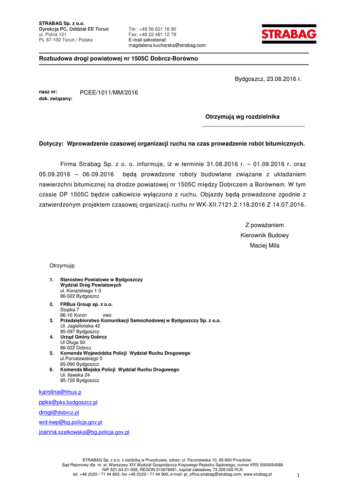 STRABAG Sp. z o.o. Dyrekcja PC, Oddział EE Toruń ul. Polna 121 PL 87-100 Toruń / Polska Tel.: +48 56 621 16 90 Fax: +48 22 481 12 79 E-mail sekretariat: [email protected] Rozbudowa drogi powiatowej nr 1505C Dobrcz-Borówno Bydgoszcz, 23.08.2016 r. nasz nr: dok. związany: PCEE/1011/MM/2016 Otrzymują wg rozdzielnika Dotyczy: Wprowadzenie czasowej organizacji ruchu na czas prowadzenie robót bitumicznych. Firma Strabag Sp. z o. o. informuje, iż w terminie 31.08.2016 r. – 01.09.2016 r. oraz 05.09.2016 – 06.09.2016 będą prowadzone roboty budowlane związane z układaniem nawierzchni bitumicznej na drodze powiatowej nr 1505C między Dobrczem a Borównem. W tym czasie DP 1505C będzie całkowicie wyłączona z ruchu. Objazdy będą prowadzone zgodnie z zatwierdzonym projektem czasowej organizacji ruchu nr WK-XII.7121.2.118.2016 Z 14.07.2016. Z poważaniem Kierownik Budowy Maciej Mila Otrzymują: 1. Starostwo Powiatowe w Bydgoszczy Wydział Dróg Powiatowych ul. Konarskiego 1-3 86-022 Bydgoszcz 2. FRBus Group sp. z o.o. Stopka 7 86-10 Koron owo Przedsiębiorstwo Komunikacji Samochodowej w Bydgoszczy Sp. z o.o. Ul. Jagiellońska 42 85-097 Bydgoszcz Urząd Gminy Dobrcz Ul Długa 50 86-022 Dobrcz Komenda Wojewódzka Policji Wydział Ruchu Drogowego ul.Poniatowskiego 5 85-090 Bydgoszcz Komenda Miejska Policji Wydział Ruchu Drogowego Ul. Iławska 24 85-720 Bydgoszcz 3. 4. 5. 6. [email protected] [email protected] [email protected] [email protected] [email protected] STRABAG Sp. z o.o. z siedzibą w Pruszkowie, adres: ul. Parzniewska 10, 05-800 Pruszków, Sąd Rejonowy dla m. st. Warszawy XIV Wydział Gospodarczy Krajowego Rejestru Sądowego, numer KRS 0000054588 NIP 521-04-21-928, REGON 010676681, kapitał zakładowy 73.328.000 PLN tel. +48 (0)22 / 71 44 800, fax +48 (0)22 / 71 44 900, e-mail: [email protected], www.strabag.pl 1