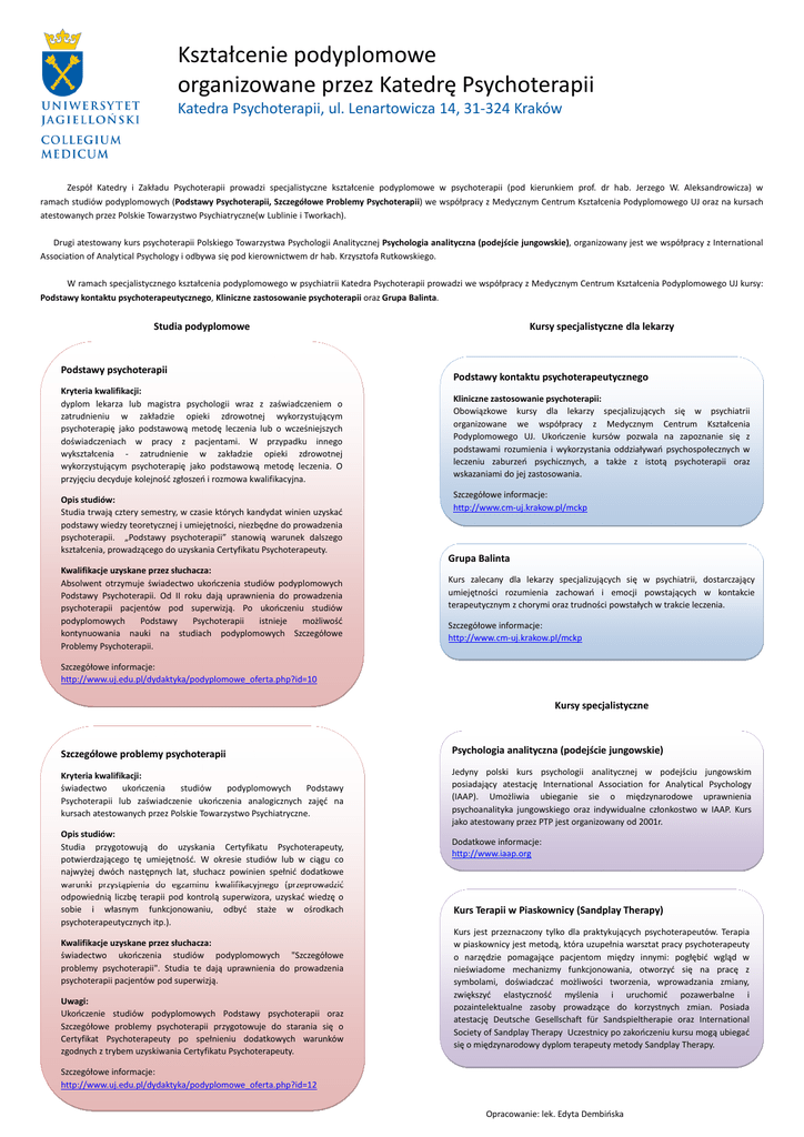 Kształcenie podyplomowe organizowane przez Katedrę Psychoterapii Katedra Psychoterapii, ul. Lenartowicza 14, 31-324 Kraków Zespół Katedry i Zakładu Psychoterapii prowadzi specjalistyczne kształcenie podyplomowe w psychoterapii (pod kierunkiem prof. dr hab. Jerzego W. Aleksandrowicza) w ramach studiów podyplomowych (Podstawy Psychoterapii, Szczegółowe Problemy Psychoterapii) we współpracy z Medycznym Centrum Kształcenia Podyplomowego UJ oraz na kursach atestowanych przez Polskie Towarzystwo Psychiatryczne(w Lublinie i Tworkach). Drugi atestowany kurs psychoterapii Polskiego Towarzystwa Psychologii Analitycznej Psychologia analityczna (podejście jungowskie), organizowany jest we współpracy z International Association of Analytical Psychology i odbywa się pod kierownictwem dr hab. Krzysztofa Rutkowskiego. W ramach specjalistycznego kształcenia podyplomowego w psychiatrii Katedra Psychoterapii prowadzi we współpracy z Medycznym Centrum Kształcenia Podyplomowego UJ kursy: Podstawy kontaktu psychoterapeutycznego, Kliniczne zastosowanie psychoterapii oraz Grupa Balinta. Studia podyplomowe Podstawy psychoterapii Kryteria kwalifikacji: dyplom lekarza lub magistra psychologii wraz z zaświadczeniem o zatrudnieniu w zakładzie opieki zdrowotnej wykorzystującym psychoterapię jako podstawową metodę leczenia lub o wcześniejszych doświadczeniach w pracy z pacjentami. W przypadku innego wykształcenia - zatrudnienie w zakładzie opieki zdrowotnej wykorzystującym psychoterapię jako podstawową metodę leczenia. O przyjęciu decyduje kolejność zgłoszeń i rozmowa kwalifikacyjna. Opis studiów: Studia trwają cztery semestry, w czasie których kandydat winien uzyskać podstawy wiedzy teoretycznej i umiejętności, niezbędne do prowadzenia psychoterapii. „Podstawy psychoterapii” stanowią warunek dalszego kształcenia, prowadzącego do uzyskania Certyfikatu Psychoterapeuty. Kwalifikacje uzyskane przez słuchacza: Absolwent otrzymuje świadectwo ukończenia studiów podyplomowych Podstawy Psychoterapii. Od II roku dają uprawnienia do prowadzenia psychoterapii pacjentów pod superwizją. Po ukończeniu studiów podyplomowych Podstawy Psychoterapii istnieje możliwość kontynuowania nauki na studiach podyplomowych Szczegółowe Problemy Psychoterapii. Kursy specjalistyczne dla lekarzy Podstawy kontaktu psychoterapeutycznego Kliniczne zastosowanie psychoterapii: Obowiązkowe kursy dla lekarzy specjalizujących się w psychiatrii organizowane we współpracy z Medycznym Centrum Kształcenia Podyplomowego UJ. Ukończenie kursów pozwala na zapoznanie się z podstawami rozumienia i wykorzystania oddziaływań psychospołecznych w leczeniu zaburzeń psychicznych, a także z istotą psychoterapii oraz wskazaniami do jej zastosowania. Szczegółowe informacje: http://www.cm-uj.krakow.pl/mckp Grupa Balinta Kurs zalecany dla lekarzy specjalizujących się w psychiatrii, dostarczający umiejętności rozumienia zachowań i emocji powstających w kontakcie terapeutycznym z chorymi oraz trudności powstałych w trakcie leczenia. Szczegółowe informacje: http://www.cm-uj.krakow.pl/mckp Szczegółowe informacje: http://www.uj.edu.pl/dydaktyka/podyplomowe_oferta.php?id=10 Kursy specjalistyczne Szczegółowe problemy psychoterapii Psychologia analityczna (podejście jungowskie) Kryteria kwalifikacji: świadectwo ukończenia studiów podyplomowych Podstawy Psychoterapii lub zaświadczenie ukończenia analogicznych zajęć na kursach atestowanych przez Polskie Towarzystwo Psychiatryczne. Jedyny polski kurs psychologii analitycznej w podejściu jungowskim posiadający atestację International Association for Analytical Psychology (IAAP). Umożliwia ubieganie sie o międzynarodowe uprawnienia psychoanalityka jungowskiego oraz indywidualne członkostwo w IAAP. Kurs jako atestowany przez PTP jest organizowany od 2001r. Opis studiów: Studia przygotowują do uzyskania Certyfikatu Psychoterapeuty, potwierdzającego tę umiejętność. W okresie studiów lub w ciągu co najwyżej dwóch następnych lat, słuchacz powinien spełnić dodatkowe warunki przystąpienia do egzaminu kwalifikacyjnego (przeprowadzić odpowiednią liczbę terapii pod kontrolą superwizora, uzyskać wiedzę o sobie i własnym funkcjonowaniu, odbyć staże w ośrodkach psychoterapeutycznych itp.). Kwalifikacje uzyskane przez słuchacza: świadectwo ukończenia studiów podyplomowych "Szczegółowe problemy psychoterapii". Studia te dają uprawnienia do prowadzenia psychoterapii pacjentów pod superwizją. Uwagi: Ukończenie studiów podyplomowych Podstawy psychoterapii oraz Szczegółowe problemy psychoterapii przygotowuje do starania się o Certyfikat Psychoterapeuty po spełnieniu dodatkowych warunków zgodnych z trybem uzyskiwania Certyfikatu Psychoterapeuty. Dodatkowe informacje: http://www.iaap.org Kurs Terapii w Piaskownicy (Sandplay Therapy) Kurs jest przeznaczony tylko dla praktykujących psychoterapeutów. Terapia w piaskownicy jest metodą, która uzupełnia warsztat pracy psychoterapeuty o narzędzie pomagające pacjentom między innymi: pogłębić wgląd w nieświadome mechanizmy funkcjonowania, otworzyć się na pracę z symbolami, doświadczać możliwości tworzenia, wprowadzania zmiany, zwiększyć elastyczność myślenia i uruchomić pozawerbalne i pozaintelektualne zasoby prowadzące do korzystnych zmian. Posiada atestację Deutsche Gesellschaft für Sandspieltherapie oraz International Society of Sandplay Therapy Uczestnicy po zakończeniu kursu mogą ubiegać się o międzynarodowy dyplom terapeuty metody Sandplay Therapy. Szczegółowe informacje: http://www.uj.edu.pl/dydaktyka/podyplomowe_oferta.php?id=12 Opracowanie: lek. Edyta Dembińska