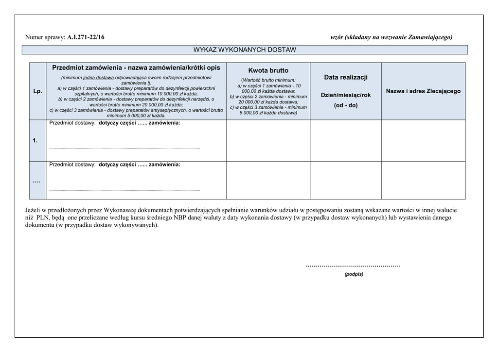 wzór (składany na wezwanie Zamawiającego) Numer sprawy: A.I.271-22/16 WYKAZ WYKONANYCH DOSTAW Przedmiot zamówienia - nazwa zamówienia/krótki opis Lp. (minimum jedna dostawa odpowiadająca swoim rodzajem przedmiotowi zamówienia tj. a) w części 1 zamówienia - dostawy preparatów do dezynfekcji powierzchni szpitalnych, o wartości brutto minimum 10 000,00 zł każda; b) w części 2 zamówienia - dostawy preparatów do dezynfekcji narzędzi, o wartości brutto minimum 20 000,00 zł każda; c) w części 3 zamówienia - dostawy preparatów antyseptycznych, o wartości brutto minimum 5 000,00 zł każda. Kwota brutto (Wartość brutto minimum: a) w części 1 zamówienia - 10 000,00 zł każda dostawa; b) w części 2 zamówienia - minimum 20 000,00 zł każda dostawa; c) w części 3 zamówienia - minimum 5 000,00 zł każda dostawa) Data realizacji Dzień/miesiąc/rok Nazwa i adres Zlecającego (od - do) Przedmiot dostawy: dotyczy części …... zamówienia: 1. ……………………………………………………………………………………………………………………………………… Przedmiot dostawy: dotyczy części …... zamówienia: …. ……………………………………………………………………………………………………………………………………… Jeżeli w przedłożonych przez Wykonawcę dokumentach potwierdzających spełnianie warunków udziału w postępowaniu zostaną wskazane wartości w innej walucie niż PLN, będą one przeliczane według kursu średniego NBP danej waluty z daty wykonania dostawy (w przypadku dostaw wykonanych) lub wystawienia danego dokumentu (w przypadku dostaw wykonywanych). ………………………………………… (podpis)