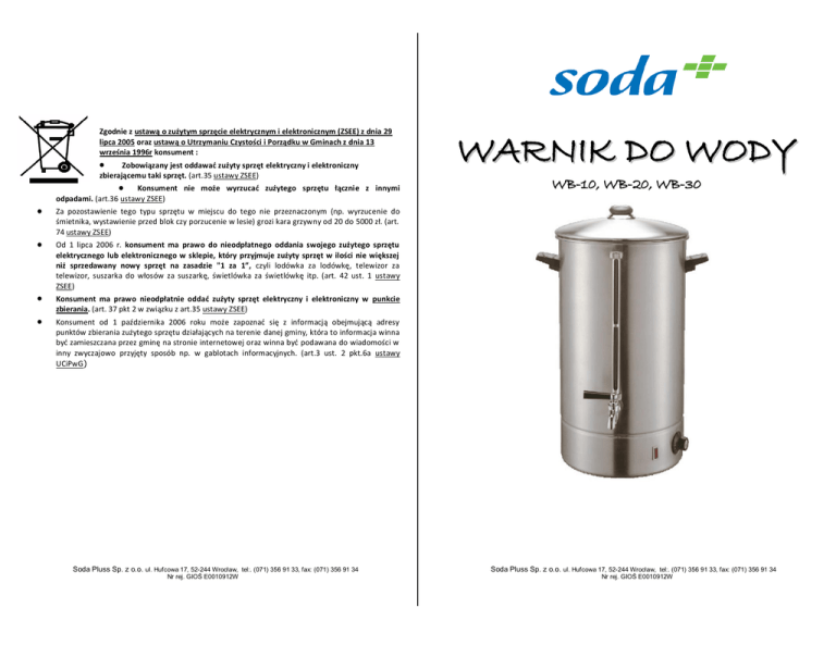 Zgodnie z ustawą o zużytym sprzęcie elektrycznym i elektronicznym (ZSEE) z dnia 29 lipca 2005 oraz ustawą o Utrzymaniu Czystości i Porządku w Gminach z dnia 13 września 1996r konsument : Zobowiązany jest oddawad zużyty sprzęt elektryczny i elektroniczny zbierającemu taki sprzęt. (art.35 ustawy ZSEE) Konsument nie może wyrzucad zużytego sprzętu łącznie z innymi odpadami. (art.36 ustawy ZSEE) WARNIK DO WODY WB-10, WB-20, WB-30 Za pozostawienie tego typu sprzętu w miejscu do tego nie przeznaczonym (np. wyrzucenie do śmietnika, wystawienie przed blok czy porzucenie w lesie) grozi kara grzywny od 20 do 5000 zł. (art. 74 ustawy ZSEE) Od 1 lipca 2006 r. konsument ma prawo do nieodpłatnego oddania swojego zużytego sprzętu elektrycznego lub elektronicznego w sklepie, który przyjmuje zużyty sprzęt w ilości nie większej niż sprzedawany nowy sprzęt na zasadzie "1 za 1”, czyli lodówka za lodówkę, telewizor za telewizor, suszarka do włosów za suszarkę, świetlówka za świetlówkę itp. (art. 42 ust. 1 ustawy ZSEE) Konsument ma prawo nieodpłatnie oddad zużyty sprzęt elektryczny i elektroniczny w punkcie zbierania. (art. 37 pkt 2 w związku z art.35 ustawy ZSEE) Konsument od 1 października 2006 roku może zapoznad się z informacją obejmującą adresy punktów zbierania zużytego sprzętu działających na terenie danej gminy, która to informacja winna byd zamieszczana przez gminę na stronie internetowej oraz winna byd podawana do wiadomości w inny zwyczajowo przyjęty sposób np. w gablotach informacyjnych. (art.3 ust. 2 pkt.6a ustawy UCiPwG) Soda Pluss Sp. z o.o. ul. Hufcowa 17, 52-244 Wrocław, tel:. (071) 356 91 33, fax: (071) 356 91 34 Nr rej. GIOŚ E0010912W Soda Pluss Sp. z o.o. ul. Hufcowa 17, 52-244 Wrocław, tel:. (071) 356 91 33, fax: (071) 356 91 34 Nr rej. GIOŚ E0010912W UWAGA: Przed pierwszym użyciem urządzenia należy dokładnie zapoznad się z instrukcją obsługi. Instrukcję należy przechowywad w bezpiecznym miejscu. producent zastrzega sobie prawo do zmiany parametrów technicznych urządzeo bez zapowiedzi. Zdjęcia oraz opis urządzeo mają charakter poglądowy. INSTRUKCJA OBSŁUGI 1. WSKAZÓWKI BEZPIECZEŃSTWA 1. 2. 3. 4. 5. 6. 7. Zabrania się przemieszczania urządzenia podczas jego pracy. Zabrania się zanurzania w wodzie lub innych płynach przewodu zasilającego, wtyczki oraz bazy. Nie zastosowanie się do niniejszego zakazu grozi porażeniem prądem elektrycznym oraz uszkodzeniem urządzenia. Warnik zawsze musi być ustawiony na równym, stabilnym podłożu. Dzieci mogą korzystać z urządzenia jedynie pod nadzorem osób dorosłych. Zawsze, gdy urządzenie nie pracuje należy je wyłączyć z sieci. Przed rozpoczęciem czyszczenia urządzenia również należy się upewnić, że jest ono wyłączone z sieci. Urządzenie nadaje się do użytku jedynie w pomieszczeniach zamkniętych. Producent udzielił 12 miesięcznej gwarancji na niniejszy produkt. Warunkiem uznania gwarancji jest stosowanie się do niniejszej instrukcji obsługi. Szkody powstałe w wyniku niepoprawnej wymiany części lub niewłaściwego użytkowania nie są objęte gwarancją. UWAGA: Producent nie ponosi żadnej odpowiedzialności za wypadki lub uszkodzenia powstałe w wyniku niewłaściwego użytkowania lub instalacji urządzenia. należy stosować się do instrukcji i informacji zawartych w niniejszej instrukcji. Nie należy dotykać obudowy podczas pracy urządzenia! Urządzenie jest gorące. 2. 3. 4. 5. UWAGA: JAKIEKOLWIEK PRACE MAJĄCE NA CELU UTRZYMANIE URZĄDZENIA W CZYSTOŚCI LUB JEGO PRZEGLĄD NALEŻY WYKONYWAĆ PO ODŁĄCZENIU KABLA ZASILAJĄCEGO Z SIECI. UWAGI: 1. 2. 3. 4. BUDOWA URZĄDZENIA 5. 6. 1. 2. 3. 6. 4. 5. 6. 7. 7. Pokrywa Zbiornik Wskażnik poziomu wody Zawór Lampka kontrolna Regulator temperatury Przycisk „Reset” Soda Pluss Sp. z o.o. ul. Hufcowa 17, 52-244 Wrocław, tel:. (071) 356 91 33, fax: (071) 356 91 34 Nr rej. GIOŚ E0010912W Przed pierwszym użyciem należy się upewnić, że przewód zasilający jest poprawnie podłączony. Kabel zasilający musi być podłączony do osobnego gniazdka z własnym zabezpieczeniem, co zapewni bezpieczeństwo użytkowników. Przed włączeniem warnika należy podnieść pokrywkę i napełnić pojemnik wodą. Przykryć. Ustawić regulator temperatury na pożądana temperaturę. Po włączeniu warnika zaświeci się lampka kontrolna, gdy woda zagotuje się zaświeci się na zielono, temperatura wody będzie utrzymywana na stałym poziomie. Należy regularnie czyścić wskaźnik poziomu wody. Aby utrzymać urządzenie w najlepszym stanie, zalecamy przeprowadzać okresowe przeglądy oraz odkamienianie urządzenia. W celu odkamienienia urządzenia należy zastosować środek odkamieniający, dostępny w sprzedaży. 7. Urządzenie powinno być użytkowane w pomieszczeniu dobrze wentylowanym, w którym wilgotność powietrza nie przekracza 85%. Zawsze, gdy wskaźnik poziomu wody spadnie poniżej minimum, należy dolać wody do zbiornika. Termostat wyłączy urządzenie gdy woda zagotuje się. Jeżeli woda, po zagotowaniu przez 3 minuty nadal wrze użytkownik musi wyłączyć urządzenie z sieci. W przypadku wystąpienia awarii urządzenia, należy je oddać do serwisu. Samodzielna naprawa jest zabroniona. Nie należy wyjmować wtyczki z gniazdka gwałtownie gdyż może to spowodować uszkodzenie kabla zasilającego I porażenie prądem. Zawsze, gdy urządzenie nie jest używane, należy wyjąć wtyczkę z gniazdka. PRZYCISK „RESET” W przypadku wygotowania się wody lub innych problemów z urządzeniem, powodujących przegrzewanie się elementu grzewczego, zasilanie zostanie automatycznie odłączone. W celu ponownego użycia urządzenia należy wcisnąć przycisk „reset”. PARAMERTY TECHNICZNE MODEL MOC WAGA NETTO WYMIARY (opakowanie) WB - 10 230V/50HZ/2000W 2,73 kg 290x290x405mm WB - 20 230V/50HZ/2500W 3,88 kg 310x310x523mm WB - 30 230V/50HZ/3000W 4,17 kg 390x390x420mm W przypadku jakichkol