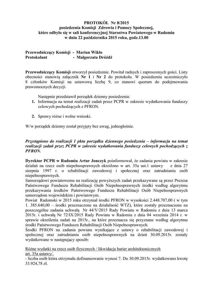 PROTOKÓŁ Nr 8/2015 posiedzenia Komisji Zdrowia i Pomocy Społecznej, które odbyło się w sali konferencyjnej Starostwa Powiatowego w Radomiu w dniu 22 października 2015 roku, godz.13.00 Przewodniczący Komisji - Marian Wikło Protokolant - Małgorzata Dróżdż Przewodniczący Komisji otworzył posiedzenie. Powitał radnych i zaproszonych gości. Listy obecności stanowią załącznik Nr 1 i Nr 2 do protokołu. W posiedzeniu uczestniczyło 8 członków Komisji na ustawową liczbę 9, co stanowi quorum do podejmowania prawomocnych decyzji. Następnie przedstawił porządek dzienny posiedzenia: 1. Informacja na temat realizacji zadań przez PCPR w zakresie wydatkowania funduszy celowych pochodzących z PFRON. 2. Sprawy różne i wolne wnioski. W/w porządek dzienny został przyjęty bez uwag, jednogłośnie. Przystąpiono do realizacji 1 pktu porządku dziennego posiedzenia – informacja na temat realizacji zadań przez PCPR w zakresie wydatkowania funduszy celowych pochodzących z PFRON. Dyrektor PCPR w Radomiu Artur Jonczyk poinformował, że zadania powiatu w zakresie działań na rzecz osób niepełnosprawnych określono w art. 35a ust.1 ustawy z dnia 27 sierpnia 1997 r. o rehabilitacji zawodowej i społecznej oraz zatrudnianiu osób niepełnosprawnych. Samorządowi powiatowemu na realizację powyższych zadań przekazywane są przez Prezesa Państwowego Funduszu Rehabilitacji Osób Niepełnosprawnych środki według algorytmu przekazywania środków Państwowego Funduszu Rehabilitacji Osób Niepełnosprawnych samorządom wojewódzkim i powiatowym. Powiat Radomski w 2015 roku otrzymał środki PFRON w wysokości 2.448.707,00 ( w tym 1. 385.640,00 – środki przeznaczone na działalność WTZ), które zostały przeznaczone na poszczególne zadania uchwałą Nr 44/V/2015 Rady Powiatu w Radomiu z dnia 13 marca 2015r. i uchwałą Nr 72/IX/2015 Rady Powiatu w Radomiu z dnia 04 września 2014 r. w sprawie określenia zadań na 2015r., na które przeznacza się przyznane według algorytmu środki Państwowego Funduszu Rehabilitacji Osób Niepełnosprawnych. Środki PFRON na zadania powiatu wynikające z ustawy o rehabilitacji zawodowej i społecznej oraz zatrudnianiu osób niepełnosprawnych na dzień 30.09.2015r. zostały wydatkowane w następujący sposób: Różne wydatki na rzecz osób fizycznych / likwidacja barier architektonicznych art. 35a ustawy/. - liczba osób która otrzymała dofinansowanie wynosi 7. Do 30.09.2015r. wydatkowano kwotę 33.924,78 zł. Rożne wydatki na rzecz osób fizycznych / dofinansowanie zaopatrzenia w sprzęt rehabilitacyjny, przedmioty ortopedyczne i środki pomocnicze - liczba osób która otrzymała dofinansowanie wynosi 747. Do 30.09.2015r. wydatkowano kwotę 638.531,53 zł. Rożne wydatki na rzecz osób fizycznych /wydatki na instrumenty lub usługi rynku pracy ( wraz z pochodnymi) wynikające z art. 11 ustawy dotyczące osób niepełnosprawnych poszukujących zatrudnienia - liczba osób która otrzymała dofinansowanie wynosi 2. Do 30.09.2015r. wydatkowano kwotę 13.733,00 zł. Różne wydatki na rzecz osób fizycznych/ dofinansowanie do uczestnictwa w turnusach rehabilitacyjnych art.35a ustawy/ - liczba osób która otrzymała dofinansowanie wynosi 70. Do 30.09.2015r. wydatkowano kwotę 69.771,00 zł. Różne wydatki na rzecz osób fizycznych/ dofinansowanie likwidacji barier w komunikowaniu się i technicznych art. 35a ustawy/ - liczba osób która otrzymała dofinansowanie wynosi 16. Do 30.09.2015r. wydatkowano kwotę 68.900,00 zł. Dotacje przekazane z funduszy celowych na realizację zadań bieżących dla jednostek zaliczonych do sektora finansów publicznych / zobowiązania dotyczące dofinansowania kosztów działania warsztatów terapii - liczba osób która otrzymała dofinansowanie wynosi 35. Do 30.09.2015r. wydatkowano kwotę 388.395,00 zł. Dotacje przekazane z funduszy celowych na realizację zadań bieżących dla jednostek niezaliczonych do sektora finansów publicznych / zobowiązania dotyczące dofinansowania kosztów działania - liczba osób która otrzymała dofinansowanie wynosi 30. Do 30.09.2015r. wydatkowano kwotę 332.910,00 zł. Dotacje przekazane z funduszy celowych na realizację zadań bieżących dla jednostek niezaliczonych do sektora finansów publicznych / zobowiązania dotyczące dofinansowania kosztów działania - liczba osób która otrzymała dofinansowanie wynosi 25. Do 30.09.2015r. wydatkowano kwotę 277.425,00 zł. Dotacje przekazane z funduszy celowych na realizację zadań bieżących dla jednostek niezliczonych do sektora finansów publicznych / dofinansowanie sportu, kultury, rekreacji i turystyki - liczba osób która otrzymała dofinansowanie wynosi 12. Do 30.09.2015r. wydatkowano kwotę 42.461,00 zł. Różne wydatki na rzecz osób fizycznych/ dofinansowanie do rozpoczęcia działalności gospodarczej lub rolniczej albo wniesienia wkładu do spółdzielni - liczba osób która otrzymała dofinansowanie wynosi 2. Do 30.09.2015r. wydatkowano kwotę 43.000,00 zł. Do 30 września br. z pomocy skorzystało 1.493 osób na łączną kwotę 1.909.051,31 zł. Poinformował, że w 2015r. w powiecie radomskim realizowany był program pn. „Aktywny samorząd”. Program ten realizowany jest od 2012 r. na podstawie porozumienia zawartego pomiędzy PFRON, a powiatem radomskim. Dofinansowanie udzielone w ramach tego programu skierowane jest do osób niepełnosprawnych zagrożonych wykluczeniem społecznym. Głównym celem programu jest wyeliminowanie lub zmniejszenie barier ograniczających uczestnictwo beneficjentów programu w życiu społecznym i zawodowym i w dostępie do edukacji. Informacja o możliwości otrzymania dofinansowania przez osoby niepełnosprawne na cele zawarte w programie została zamieszczona na stronie internetowej PCPR. Ponadto informację o programie rozesłano do szkół ponadgimnazjalnych znajdujących się na terenie powiatu 2 radomskiego. W ramach promocji programu również rozdawano