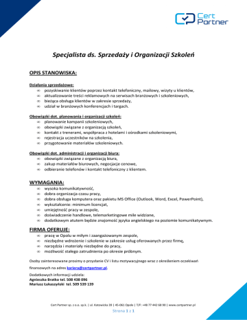 Specjalista ds. Sprzedaży i Organizacji Szkoleń OPIS STANOWISKA: Działania sprzedażowe: • pozyskiwanie klientów poprzez kontakt telefoniczny, mailowy, wizyty u klientów, • aktualizowanie treści reklamowych na serwisach branżowych i szkoleniowych, • bieżąca obsługa klientów w zakresie sprzedaży, • udział w branżowych konferencjach i targach. Obowiązki dot. planowania i organizacji szkoleń: • planowanie kampanii szkoleniowych, • obowiązki związane z organizacją szkoleń, • kontakt z trenerami, współpraca z hotelami i ośrodkami szkoleniowymi, • rejestracja uczestników na szkolenia, • przygotowanie materiałów szkoleniowych. Obowiązki dot. administracji i organizacji biura: • obowiązki związane z organizacją biura, • zakup materiałów biurowych, negocjacje cenowe, • odbieranie telefonów i kontakt telefoniczny z klientem. WYMAGANIA: • • • • • • • wysoka komunikatywność, dobra organizacja czasu pracy, dobra obsługa komputera oraz pakietu MS Office (Outlook, Word, Excel, PowerPoint), wykształcenie: minimum licencjat, umiejętność pracy w zespole, doświadczenie handlowe, telemarketingowe mile widziane, dodatkowym atutem będzie znajomość języka angielskiego na poziomie komunikatywnym. FIRMA OFERUJE: • • • • pracę w Opolu w miłym i zaangażowanym zespole, niezbędne wdrożenie i szkolenie w zakresie usług oferowanych przez firmę, narzędzia i materiały niezbędne do pracy, możliwość stałego zatrudnienia po okresie próbnym. Osoby zainteresowane prosimy o przysłanie CV i listu motywacyjnego wraz z określeniem oczekiwań finansowych na adres [email protected]. Dodatkowych informacji udziela: Agnieszka Bratko tel. 508 438 096 Mariusz Łukaszyński tel. 509 539 139 Cert Partner sp. z o.o. sp.k. | ul. Katowicka 39 | 45-061 Opole | T/F: +48 77 442 68 90 | www.certpartner.pl Strona 1 z 1