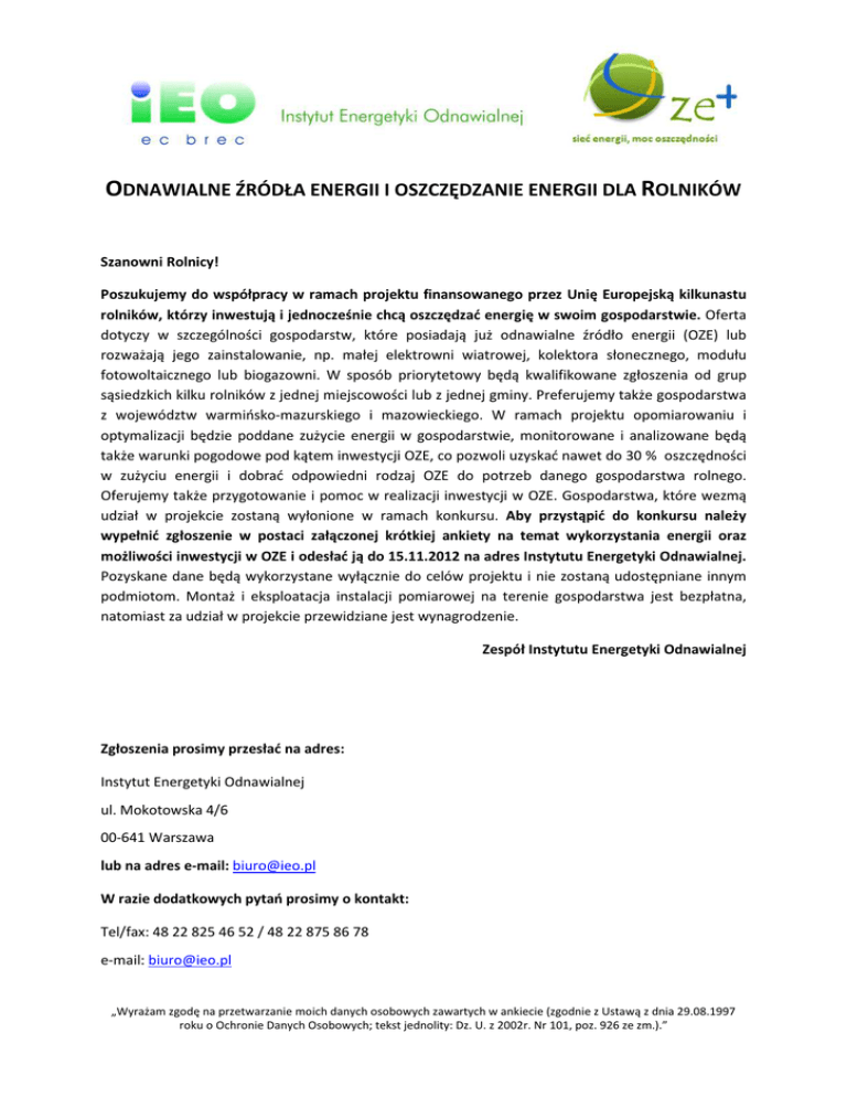 ODNAWIALNE ŹRÓDŁA ENERGII I OSZCZĘDZANIE ENERGII DLA ROLNIKÓW Szanowni Rolnicy! Poszukujemy do współpracy w ramach projektu finansowanego przez Unię Europejską kilkunastu rolników, którzy inwestują i jednocześnie chcą oszczędzać energię w swoim gospodarstwie. Oferta dotyczy w szczególności gospodarstw, które posiadają już odnawialne źródło energii (OZE) lub rozważają jego zainstalowanie, np. małej elektrowni wiatrowej, kolektora słonecznego, modułu fotowoltaicznego lub biogazowni. W sposób priorytetowy będą kwalifikowane zgłoszenia od grup sąsiedzkich kilku rolników z jednej miejscowości lub z jednej gminy. Preferujemy także gospodarstwa z województw warmińsko-mazurskiego i mazowieckiego. W ramach projektu opomiarowaniu i optymalizacji będzie poddane zużycie energii w gospodarstwie, monitorowane i analizowane będą także warunki pogodowe pod kątem inwestycji OZE, co pozwoli uzyskać nawet do 30 % oszczędności w zużyciu energii i dobrać odpowiedni rodzaj OZE do potrzeb danego gospodarstwa rolnego. Oferujemy także przygotowanie i pomoc w realizacji inwestycji w OZE. Gospodarstwa, które wezmą udział w projekcie zostaną wyłonione w ramach konkursu. Aby przystąpić do konkursu należy wypełnić zgłoszenie w postaci załączonej krótkiej ankiety na temat wykorzystania energii oraz możliwości inwestycji w OZE i odesłać ją do 15.11.2012 na adres Instytutu Energetyki Odnawialnej. Pozyskane dane będą wykorzystane wyłącznie do celów projektu i nie zostaną udostępniane innym podmiotom. Montaż i eksploatacja instalacji pomiarowej na terenie gospodarstwa jest bezpłatna, natomiast za udział w projekcie przewidziane jest wynagrodzenie. Zespół Instytutu Energetyki Odnawialnej Zgłoszenia prosimy przesłać na adres: Instytut Energetyki Odnawialnej ul. Mokotowska 4/6 00-641 Warszawa lub na adres e-mail: [email protected] W razie dodatkowych pytań prosimy o kontakt: Tel/fax: 48 22 825 46 52 / 48 22 875 86 78 e-mail: [email protected] „Wyrażam zgodę na przetwarzanie moich danych osobowych zawartych w ankiecie (zgodnie z Ustawą z dnia 29.08.1997 roku o Ochronie Danych Osobowych; tekst jednolity: Dz. U. z 2002r. Nr 101, poz. 926 ze zm.).” Podstawowe kryteria udziału w projekcie • Posiadanie instalacji OZE lub chęć i realne możliwości realizacji takiej inwestycji • Wysokie zapotrzebowanie na energię na procesy produkcyjne • Stały dostęp do Internetu Kryteria dodatkowo punktowane • Lokalizacja gospodarstwa w województwie warmińsko-mazurskim lub mazowieckim • Wspólny udział w projekcie z gospodarstwami sąsiadującymi lub innymi gospodarstwami z tej samej miejscowości bądź gminy Co oferujemy - czyli korzyści z udziału w projekcie • Bezpłatny monitoring zużycia energii oraz warunków meteorologicznych • Darmowe doradztwo w zakresie optymalizacji zużycia energii i doboru odnawialnego źródła energii • Miesięczne wynagrodzenie za udział w projekcie • Wyjazd studyjny do zagranicznego gospodarstwa rolnego opierającego produkcję na energii z odnawialnych źródeł • Przygotowanie dokumentacji projektowej do inwestycji w OZE (wkład do wniosku o uzyskanie warunków oraz pozwolenia na budowę) Konkurs 1-y etap Odesłanie wypełnionego zgłoszenia w formie ankiety do 15.11.2012 na adres e-mailowy: [email protected] lub pocztowy: Instytut Energetyki Odnawialnej, ul. Mokotowska 4/6, 00-641 Warszawa 2-gi etap Wypełnienie szczegółowej ankiety on-line na temat zużycia i zapotrzebowania energii na stronie internetowej projektu www.ozeplus.pl (strona w budowie) „Wyrażam zgodę na przetwarzanie moich danych osobowych zawartych w ankiecie (zgodnie z Ustawą z dnia 29.08.1997 roku o Ochronie Danych Osobowych; tekst jednolity: Dz. U. z 2002r. Nr 101, poz. 926 ze zm.).” Regulamin Konkursu 1. W konkursie mogą uczestniczyć właściciele gospodarstw rolnych, którzy spełnią podstawowe kryteria udziału w projekcie oraz wypełnią kompletnie i prześlą do dn. 15.11.2012 zgłoszenie w formie ankiety wstępnej pt. „Zużycie energii w gospodarstwie rolnym” na adres pocztowy lub elektroniczny Instytutu Energetyki Odnawialnej, bądź on-line na stronie: www.ozeplus.pl 2. Dane przekazane w ramach ankiety podlegają ochronie zgodnie z zapisami Ustawy o Ochronie Danych Osobowych (z dnia 29.08.1997 roku tekst jednolity: Dz. U. z 2002r. Nr 101, poz. 926 ze zm.) i zostaną wykorzystane lub przetworzone wyłącznie na potrzeby opracowań związanych z realizacją niniejszego projektu 3. Wybór gospodarstw – laureatów konkursu, które wezmą udział w projekcie, nastąpi w wyniku oceny nadesłanych ankiet przez ekspertów Instytutu Energetyki Odnawialnej 4. Decyzja o ocenie i wyborze poszczególnych gospodarstw może być w uzasadnionych przypadkach poprzedzona wizytą w gospodarstwie i weryfikacją ankiet w trakcie rozmowy ekspertów Instytutu Energetyki Odnawialnej z właścicielem gospodarstwa 5. Zastrzegamy sobie prawo do powiadomienia o wynikach konkursu i zakwalifikowaniu się do kolejnego etapu tylko wybranych gospodarstw 6. Przetwarzanie ankiety i wykorzystywanie jej treści w innym celu niż na potrzeby niniejszego konkursu, bez zgody autorów, jest zabronione 7. Z gospodarstwami wybranymi do udziału w projekcie zostanie podpisana szczegółowa umowa określająca zobowiązania stron oraz obowiązki wynikające z ochrony danych Akceptuję warunki regulaminu Data i podpis „Wyrażam zgodę na przetwarzanie moich danych osobowych zawartych w ankiecie (zgodnie z Ustawą z dnia 29.08.1997 roku o Ochronie Danych Osobowych; tekst jednolity: Dz. U. z 2002r. Nr 101, poz. 926 ze zm.).” „Zużycie energii w gospodarstwie rolnym” - Ankieta wstępna. Pierwszy etap kwalifikacji gospodarstw, zakończenie planowane na 15.11.2012 1. Dane kontaktowe Imię, nazwisko Adres, kod pocztowy Telefon e-mail Wybierz hasło do logowania (min. 6 znaków) 2. Charakterystyka topografii gospodarstwa (zaznacz stawiaj