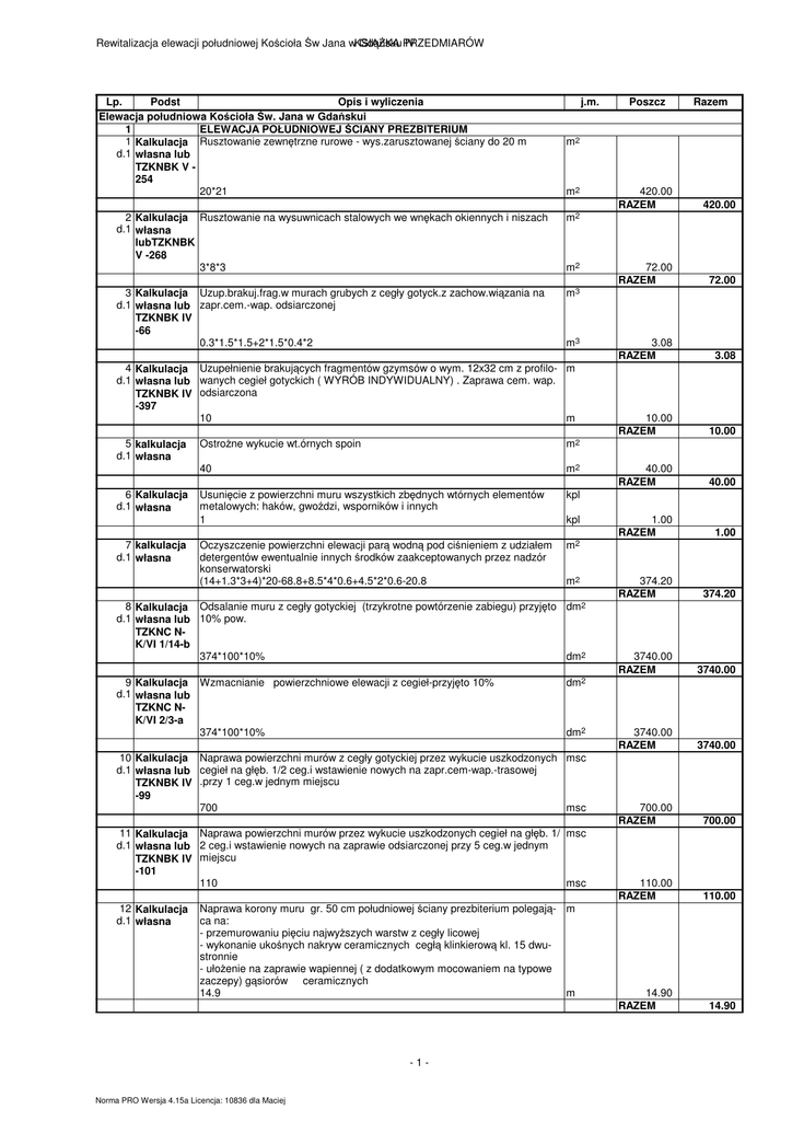 Rewitalizacja elewacji południowej Kościoła Św Jana wKSIĄŻKA Gdansku PRZEDMIARÓW IV Lp. Podst Opis i wyliczenia Elewacja południowa Kościoła Św. Jana w Gdańskui 1 ELEWACJA POŁUDNIOWEJ ŚCIANY PREZBITERIUM 1 Kalkulacja Rusztowanie zewnętrzne rurowe - wys.zarusztowanej ściany do 20 m d.1 własna lub TZKNBK V 254 20*21 j.m. m2 m2 3 Kalkulacja Uzup.brakuj.frag.w murach grubych z cegły gotyck.z zachow.wiązania na d.1 własna lub zapr.cem.-wap. odsiarczonej TZKNBK IV -66 0.3*1.5*1.5+2*1.5*0.4*2 m3 m2 m3 4 Kalkulacja Uzupełnienie brakujących fragmentów gzymsów o wym. 12x32 cm z profilo- m d.1 własna lub wanych cegieł gotyckich ( WYRÓB INDYWIDUALNY) . Zaprawa cem. wap. TZKNBK IV odsiarczona -397 10 m 5 kalkulacja d.1 własna Ostrożne wykucie wt.órnych spoin m2 40 m2 6 Kalkulacja d.1 własna Usunięcie z powierzchni muru wszystkich zbędnych wtórnych elementów metalowych: haków, gwoździ, wsporników i innych 1 kpl 7 kalkulacja d.1 własna Oczyszczenie powierzchni elewacji parą wodną pod ciśnieniem z udziałem detergentów ewentualnie innych środków zaakceptowanych przez nadzór konserwatorski (14+1.3*3+4)*20-68.8+8.5*4*0.6+4.5*2*0.6-20.8 m2 kpl m2 8 Kalkulacja Odsalanie muru z cegły gotyckiej (trzykrotne powtórzenie zabiegu) przyjęto dm2 d.1 własna lub 10% pow. TZKNC NK/VI 1/14-b 374*100*10% dm2 dm2 11 Kalkulacja Naprawa powierzchni murów przez wykucie uszkodzonych cegieł na głęb. 1/ msc d.1 własna lub 2 ceg.i wstawienie nowych na zaprawie odsiarczonej przy 5 ceg.w jednym TZKNBK IV miejscu -101 110 msc Naprawa korony muru gr. 50 cm południowej ściany prezbiterium polegają- m ca na: - przemurowaniu pięciu najwyższych warstw z cegły licowej - wykonanie ukośnych nakryw ceramicznych cegłą klinkierową kl. 15 dwustronnie - ułożenie na zaprawie wapiennej ( z dodatkowym mocowaniem na typowe zaczepy) gąsiorów ceramicznych 14.9 m -1- Norma PRO Wersja 4.15a Licencja: 10836 dla Maciej 420.00 RAZEM 420.00 72.00 RAZEM 72.00 3.08 RAZEM 3.08 10.00 RAZEM 10.00 40.00 RAZEM 40.00 1.00 RAZEM 1.00 374.20 RAZEM 374.20 3740.00 RAZEM 3740.00 3740.00 RAZEM 3740.00 700.00 RAZEM 700.00 110.00 RAZEM 110.00 14.90 RAZEM 14.90 dm2 10 Kalkulacja Naprawa powierzchni murów z cegły gotyckiej przez wykucie uszkodzonych msc d.1 własna lub cegieł na głęb. 1/2 ceg.i wstawienie nowych na zapr.cem-wap.-trasowej TZKNBK IV .przy 1 ceg.w jednym miejscu -99 700 msc 12 Kalkulacja d.1 własna Razem m2 2 Kalkulacja Rusztowanie na wysuwnicach stalowych we wnękach okiennych i niszach d.1 własna lubTZKNBK V -268 3*8*3 9 Kalkulacja Wzmacnianie powierzchniowe elewacji z cegieł-przyjęto 10% d.1 własna lub TZKNC NK/VI 2/3-a 374*100*10% Poszcz Rewitalizacja elewacji południowej Kościoła Św Jana wKSIĄŻKA Gdansku PRZEDMIARÓW IV Lp. Podst Opis i wyliczenia 13 Kalkulacja Wzmacnianie - impregnacja wzmacniającastrukturę cegieł preparatami na d.1 własna lub bazie mineralnej np. Remmers "FUNCOSIL KSE 300 E" TZKNC N- przyjęto 10% powierzchni K/VI 2/3-a 374*100*10% 14 Kalkulacja d.1 własna lub TZKNC NK/VI 5/2-a Uzupełnienie ubytków - flekowanie. Flek o powierzchni od 10 do 30 cm2. cegła - z zastosowaniem kitów renomowanych producentów materiałów konserwatorskich FLEKOWANIE UBYTKÓW W SPUDROWANYCH CEGŁACH 250 j.m. dm2 dm2 szt. m2 16 Kalkulacja Klejenie i przytwierdzanie rozluźnionych i oberwanych elementów tynku d.1 własna lub przyjęto 10% TZKNC NK/VI 2/4-a 20.8*10%*100 dm2 17 Kalkulacja Usuwanie z powierzchni tynku nierozpuszczalnych powłok (tempery kazeid.1 własna lub nowe, fluaty, smoła, nawarstwienie soli) Wybranie fragmentów tynku do zaTZKNC N- chowania i wyrównanie krawędzi. K/VI 1/12-a 208.0 dm2 m2 dm2 dm2 18 Kalkulacja Tynk zewn.szlachet.gladzony z wyk.podkładu i wierzch.warstwy z zapr.szla- m2 d.1 własna lub chet.z przyg.zapr.na ścianach płaskich. Uzupełnienie brakujących fragmentów tynku barwionego w masie-zgodnie z wytycznymi konserwatorskimi TZKNBK VIII 02-60 20.8-2.08 m2 19 Kalkulacja Scalenie kolorystyczne elewacji - przyjęto 3% d.1 własna lub TZKNC NK/VI 2/3-a 374*100*3% dm2 20 Kalkulacja d.1 własna m dm2 m 21 Kaslkulacja Spoinowanie murów z wystrojem architektonicznym odsiarczoną zaprawą d.1 własna lub wapienną - mur z cegły gotyckiej KNR 19-01 0325-06 374 m2 22 Kalkulacja d.1 własna szt Wykonanie konserwatorskiej dokumentacji powykonawczej fotograficznej i opisowej 1 2 ELEWACJE TRANSEPTU POŁUDNIOWEGO 23 Kalkulacja Rusztowanie zewnętrzne rurowe - wys.zarusztowanej ściany do 20 m d.2 własna lub TZKNBK V 254 14.24*17+7.4*8+7.4*20+1.1*4.19 m2 szt m2 m2 25 Kalkulacja Wykonanie daszków zabezpieczających d.2 własna lub KNR 4-01 0420-04 3*3 m2 Norma PRO Wersja 4.15a Licencja: 10836 dla Maciej 3740.00 RAZEM 3740.00 250.00 RAZEM 250.00 20.80 RAZEM 20.80 208.00 RAZEM 208.00 208.00 RAZEM 208.00 18.72 RAZEM 18.72 1122.00 RAZEM 1122.00 1.00 RAZEM 1.00 374.00 RAZEM 374.00 1.00 RAZEM 1.00 453.89 RAZEM 453.89 67.20 RAZEM 67.20 m2 24 Kalkulacja Rusztowanie na wysuwnicach stalowych we wnękach okiennych i niszach d.2 własna lubTZKNBK V -268 2.8*8*3 m2 m2 -2- Razem szt. 15 Kalkulacja Wstępne odczyszczenie powierzchni tynku d.1 własna lub TZKNC NK/VI 1/1-a 20*0.95+1.2*1.5 Uzupełnienie w robotach tynkarskich brakujących fragmentów górnego gzymsu kościoła I gzymsu wieży - szerokość gzymsu do 60 cm 1 Poszcz 9.00 Rewitalizacja elewacji południowej Kościoła Św Jana wKSIĄŻKA Gdansku PRZEDMIARÓW IV Lp. Podst Opis i wyliczenia j.m. 26 Kalkulacja Zabezpieczenie stolarki folią d.2 własna lub KNR 19-01 0832-04 3*8.5 m2 27 kalkulacja d.2 własna Ostrożne wykucie spoin m2 100 m2 m2 28 Kalkulacja Uzup.brakuj.frag.w murach grubych z cegły gotyck.z zachow.wiązania na d.2 własna lub zapr.cem.-wap.do 1 m3 w jednym miejscu mur gładki gr. 1 ceg. TZKNBK IV -66 0.30*1.0*1.5*2+2.0*1.5*0.6 Oczyszczenie powierzchni elewacji parą wodną pod ciśnieniem z udziałem detergentów ewentualnie innych środków zaakceptowanych przez nadzór konserwa