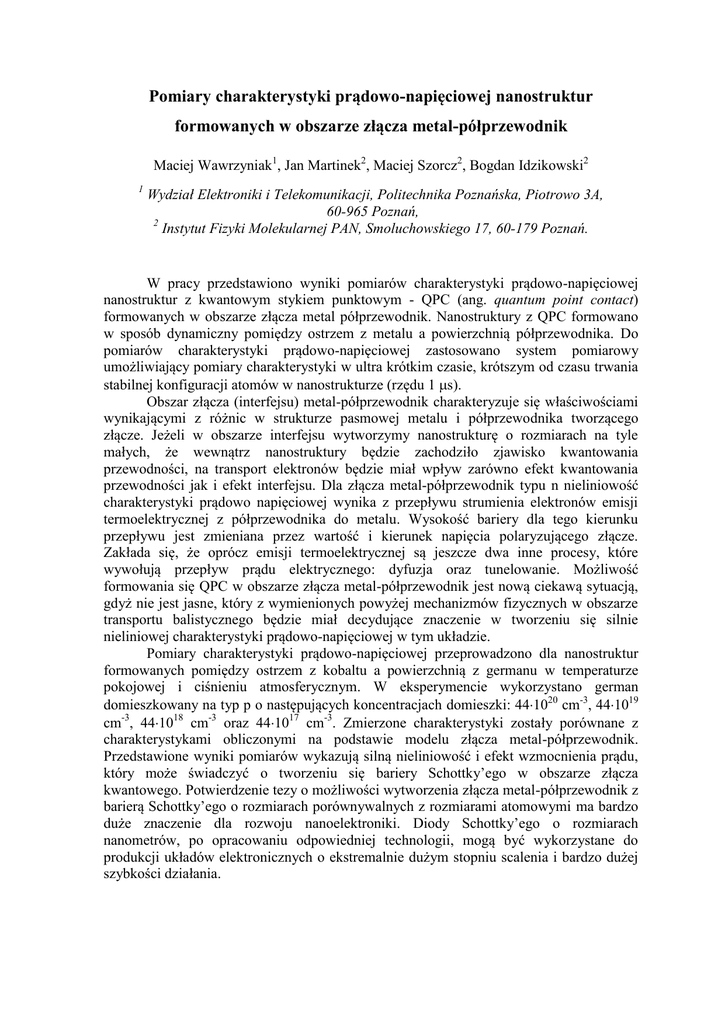 Pomiary charakterystyki prądowo-napięciowej nanostruktur formowanych w obszarze złącza metal-półprzewodnik Maciej Wawrzyniak1, Jan Martinek2, Maciej Szorcz2, Bogdan Idzikowski2 1 Wydział Elektroniki i Telekomunikacji, Politechnika Poznańska, Piotrowo 3A, 60-965 Poznań, 2 Instytut Fizyki Molekularnej PAN, Smoluchowskiego 17, 60-179 Poznań. W pracy przedstawiono wyniki pomiarów charakterystyki prądowo-napięciowej nanostruktur z kwantowym stykiem punktowym - QPC (ang. quantum point contact) formowanych w obszarze złącza metal półprzewodnik. Nanostruktury z QPC formowano w sposób dynamiczny pomiędzy ostrzem z metalu a powierzchnią półprzewodnika. Do pomiarów charakterystyki prądowo-napięciowej zastosowano system pomiarowy umożliwiający pomiary charakterystyki w ultra krótkim czasie, krótszym od czasu trwania stabilnej konfiguracji atomów w nanostrukturze (rzędu 1 s). Obszar złącza (interfejsu) metal-półprzewodnik charakteryzuje się właściwościami wynikającymi z różnic w strukturze pasmowej metalu i półprzewodnika tworzącego złącze. Jeżeli w obszarze interfejsu wytworzymy nanostrukturę o rozmiarach na tyle małych, że wewnątrz nanostruktury będzie zachodziło zjawisko kwantowania przewodności, na transport elektronów będzie miał wpływ zarówno efekt kwantowania przewodności jak i efekt interfejsu. Dla złącza metal-półprzewodnik typu n nieliniowość charakterystyki prądowo napięciowej wynika z przepływu strumienia elektronów emisji termoelektrycznej z półprzewodnika do metalu. Wysokość bariery dla tego kierunku przepływu jest zmieniana przez wartość i kierunek napięcia polaryzującego złącze. Zakłada się, że oprócz emisji termoelektrycznej są jeszcze dwa inne procesy, które wywołują przepływ prądu elektrycznego: dyfuzja oraz tunelowanie. Możliwość formowania się QPC w obszarze złącza metal-półprzewodnik jest nową ciekawą sytuacją, gdyż nie jest jasne, który z wymienionych powyżej mechanizmów fizycznych w obszarze transportu balistycznego będzie miał decydujące znaczenie w tworzeniu się silnie nieliniowej charakterystyki prądowo-napięciowej w tym układzie. Pomiary charakterystyki prądowo-napięciowej przeprowadzono dla nanostruktur formowanych pomiędzy ostrzem z kobaltu a powierzchnią z germanu w temperaturze pokojowej i ciśnieniu atmosferycznym. W eksperymencie wykorzystano german domieszkowany na typ p o następujących koncentracjach domieszki: 441020 cm-3, 441019 cm-3, 441018 cm-3 oraz 441017 cm-3. Zmierzone charakterystyki zostały porównane z charakterystykami obliczonymi na podstawie modelu złącza metal-półprzewodnik. Przedstawione wyniki pomiarów wykazują silną nieliniowość i efekt wzmocnienia prądu, który może świadczyć o tworzeniu się bariery Schottky’ego w obszarze złącza kwantowego. Potwierdzenie tezy o możliwości wytworzenia złącza metal-półprzewodnik z barierą Schottky’ego o rozmiarach porównywalnych z rozmiarami atomowymi ma bardzo duże znaczenie dla rozwoju nanoelektroniki. Diody Schottky’ego o rozmiarach nanometrów, po opracowaniu odpowiedniej technologii, mogą być wykorzystane do produkcji układów elektronicznych o ekstremalnie dużym stopniu scalenia i bardzo dużej szybkości działania.
