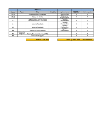 MUZYKA Numer Autor M1.1 Tytuł Zostańmy wierni Papieżowi M1.2 Raduj się Afryko M3 Najpiekniejsze arie barakowe, Misteria Paschalia -2006-2008 M4 Misteria Paschalia M5 Misteria Paschalia M6 M7 M8 Gian Francesco De Majo Małkowicz Zbigniew Podtytuł wydawca / seria Helenów 2003 Misjonarze Kombonianie Tygodnik Powszechny Tygodnik Powszechny Tygodnik Powszechny Tygodnik Powszechny Psalmy Dawida (nuty +płyta CD) Litanie do świętych Stan na 12.09.2016 pozycji 8 ilość płyt w komplecie ilość kompletów 1 1 1 1 1 3 1 3 1 3 1 3 1 1 1 1 łącznie płyt 16 ilość komletów 16