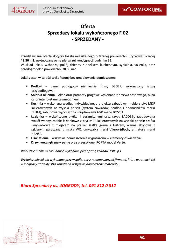 Oferta Sprzedaży lokalu wykończonego F 02 - SPRZEDANY Przedstawiana oferta dotyczy lokalu mieszkalnego o łącznej powierzchni użytkowej liczącej 48,30 m2, usytuowanego na pierwszej kondygnacji budynku B2. W skład lokalu wchodzą: pokój dzienny z aneksem kuchennym, sypialnia, łazienka, oraz przedogródek o powierzchni 38,80 m2. Lokal został w całości wykończony bez umeblowania pomieszczeń: Podłogi – panel podłogowy niemieckiej firmy EGGER, wykończony listwą przypodłogową; Solarka okienna – okna oraz parapety progowe wykonane z drzewa sosnowego, okna osłonięte roletami zewnętrznymi; Kuchnia – wykonana według indywidualnego projektu zabudowy, meble z płyt MDF lakierowanych na wysoki połysk (system zawiasów, szuflad i podnośników marki BLUM), zabudowa wyposażona urządzeniami AGD marki BOSCH; Łazienka – wykończone płytkami ceramicznymi oraz szybą LACOBEL zabudowana wokół wanny, meble łazienkowe z płyt MDF lakierowanych na wysoki połysk: szafka umywalkowa z miejscem na pralkę, szafka górna z lustrem, wanna akrylowa z szklanym parawanem, miska WC, umywalka marki Vileroy&Boch, armatura marki HANSA; Oświetlenie – wszystkie pomieszczenia wyposażono w elementy oświetlenia; Drzwi wewnętrzne – pełne oraz przeszklone, PORTA model Verte. Wszystkie meble w zabudowie wykonane przez firmę KOMANDOR Sp.J. Wykończenie lokalu wykonano przy współpracy z renomowanymi firmami, które w ramach tej współpracy udzieliły 30% rabatu na wszystkie dostarczone materiały. Biuro Sprzedaży os. 4OGRODY, tel. 091 812 0 812 F02