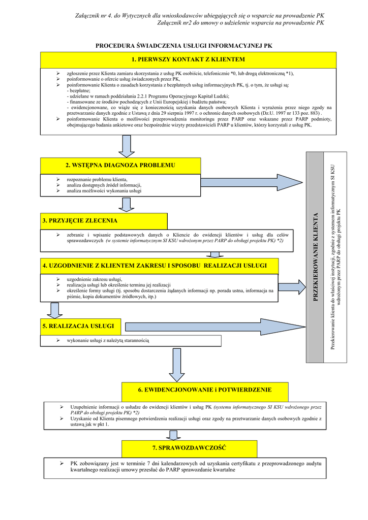 Załącznik nr 4. do Wytycznych dla wnioskodawców ubiegających się o wsparcie na prowadzenie PK Załącznik nr2 do umowy o udzielenie wsparcia na prowadzenie PK PROCEDURA ŚWIADCZENIA USŁUGI INFORMACYJNEJ PK 1. PIERWSZY KONTAKT Z KLIENTEM zgłoszenie przez Klienta zamiaru skorzystania z usług PK osobiście, telefonicznie *0, lub drogą elektroniczną *1), poinformowanie o ofercie usług świadczonych przez PK, poinformowanie Klienta o zasadach korzystania z bezpłatnych usług informacyjnych PK, tj. o tym, Ŝe usługi są: - bezpłatne; - udzielane w ramach poddziałania 2.2.1 Programu Operacyjnego Kapitał Ludzki; - finansowane ze środków pochodzących z Unii Europejskiej i budŜetu państwa; - ewidencjonowane, co wiąŜe się z koniecznością uzyskania danych osobowych Klienta i wyraŜenia przez niego zgody na przetwarzanie danych zgodnie z Ustawą z dnia 29 sierpnia 1997 r. o ochronie danych osobowych (Dz.U. 1997 nr 133 poz. 883) . poinformowanie Klienta o moŜliwości przeprowadzenia monitoringu przez PARP oraz wskazane przez PARP podmioty, obejmującego badania ankietowe oraz bezpośrednie wizyty przedstawicieli PARP u klientów, którzy korzystali z usług PK. 2. WSTĘPNA DIAGNOZA PROBLEMU rozpoznanie problemu klienta, analiza dostępnych źródeł informacji, analiza moŜliwości wykonania usługi 3. PRZYJĘCIE ZLECENIA zebranie i wpisanie podstawowych danych o Kliencie do ewidencji klientów i usług dla celów sprawozdawczych (w systemie informatycznym SI KSU wdroŜonym przez PARP do obsługi projektu PK) *2) 4. UZGODNIENIE Z KLIENTEM ZAKRESU I SPOSOBU REALIZACJI USŁUGI uzgodnienie zakresu usługi, realizacja usługi lub określenie terminu jej realizacji określenie formy usługi (tj. sposobu dostarczenia Ŝądanych informacji np. porada ustna, informacja na piśmie, kopia dokumentów źródłowych, itp.) PRZEKIEROWANIE KLIENTA 5. REALIZACJA USŁUGI wykonanie usługi z naleŜytą starannością 6. EWIDENCJONOWANIE i POTWIERDZENIE Uzupełnienie informacji o usłudze do ewidencji klientów i usług PK (systemu informatycznego SI KSU wdroŜonego przez PARP do obsługi projektu PK) *2) Uzyskanie od Klienta pisemnego potwierdzenia realizacji usługi oraz zgody na przetwarzanie danych osobowych zgodnie z ustawą jak w pkt 1. 7. SPRAWOZDAWCZOŚĆ PK zobowiązany jest w terminie 7 dni kalendarzowych od uzyskania certyfikatu z przeprowadzonego audytu kwartalnego realizacji umowy przesłać do PARP sprawozdanie kwartalne Przekierowanie klienta do właściwej instytucji, zgodnie z systemem informatycznym SI KSU wdroŜonym przez PARP do obsługi projektu PK Załącznik nr 4 do Wytycznych dla Wnioskodawców ubiegających się o wsparcie na prowadzenie PK Załącznik nr 2 do umowy o udzielenie wsparcia na prowadzenie PK Niezbędne etapy realizacji usługi informacyjnej świadczonej drogą telefoniczną: 1. Uruchomienie aktywnej linii telefonicznej umoŜliwiającej wykonywanie połączeń głosowych (w tym zapewnienie aparatu posiadającego homologację dopuszczającą do uŜycia na terenie RP oraz urządzenia rejestrującego rozmowy telefoniczne). 2. Zapewnienie przekazania informacji o zasadach korzystania z bezpłatnych usług informacyjnych PK tj. przekazanie, przed uzyskaniem połączenia klienta z konsultantem PK, komunikatu informującego o tym, Ŝe usługi informacyjne są: − bezpłatne; − udzielane w ramach poddziałania 2.2.1 Programu Operacyjnego Kapitał Ludzki; − finasowane ze środków pochodzących z Unii Europejskiej i budŜetu państwa; − ewidencjonowane, co wiąŜe się z koniecznością uzyskania danych osobowych Klienta i wyraŜenia przez niego zgody na przetwarzanie danych zgodnie z Ustawą z dnia 29 sierpnia 1997 r. o ochronie danych osobowych (Dz.U. 1997 nr 133 poz. 883) 3. Zapewnienie konieczności wyraŜenia osobowych w celach i przez okres prowadzenie PK, tj. przekazanie połączenia klienta z konsultantem z brakiem połączenia. zgody przez klienta na przetwarzanie jego danych wskazany w umowie o udzieleniu wsparcia na odpowiedniego komunikatu przez uzyskaniem PK. Brak wyraŜenia zgody jest równoznaczny 4. Połączenie z konsultantem: − zapewnienie moŜliwości zbierania podstawowych danych o Kliencie, zgodnie z ewidencją klientów i usług PK wraz ze szczegółową charakterystyką klientów (załącznik nr 2 do wniosku Beneficjenta o płatność) oraz z zachowaniem poufności przetwarzanych danych − realizacja usługi 5. Uwzględnienie usług informacyjnych wyświadczonych sprawozdaniach kwartalnych z realizacji umowy. 6. drogą telefoniczną w Zapewnienie archiwizacji i zabezpieczenia nośników pochodzących z urządzeń rejestrujących wykonane usługi w formie rozmowy telefonicznej. 1) Niezbędne etapy realizacji usługi informacyjnej świadczonej drogą elektroniczną: 1. Uruchomienie formularza zapytań dla Klientów korzystających z usług świadczonych drogą elektroniczną z wykorzystaniem serwisu internetowego dostępnego pod adresem WWW Beneficjenta (w tym zapewnienie przeglądarki internetowej MSIE 6.0, Firefox 1.0, Opera 7.0 lub kompatybilnej, z włączoną opcją „cookies”, o rozdzielczości ekranu przynajmniej 800x600). 2. Na stronie WWW z formularzem zapytań – umieszczenie informacji o zasadach korzystania z bezpłatnych usług informacyjnych PK, tj. o tym, Ŝe usługi są: − bezpłatne; − udzielane w ramach poddziałania 2.2.1 Programu Operacyjnego Kapitał Ludzki; − finasowane ze środków pochodzących z Unii Europejskiej i budŜetu państwa; − ewidencjonowane, co wiąŜe się z koniecznością uzyskania danych osobowych Klienta i wyraŜenia przez niego zgody na przetwarzanie danych zgodnie z Ustawą z dnia 29 Załącznik nr 4. do Wytycznych dla wnioskodawców ubiegających się o wsparcie na prowadzenie PK Załącznik nr2 do umowy o udzielenie wsparcia na prowadzenie PK sierpnia 1997 r. o ochronie danych osobowych (Dz.U. 1997 nr 133 poz. 883) . 3. Zapewnienie moŜliwości zbierania podstawowych danych o Kl