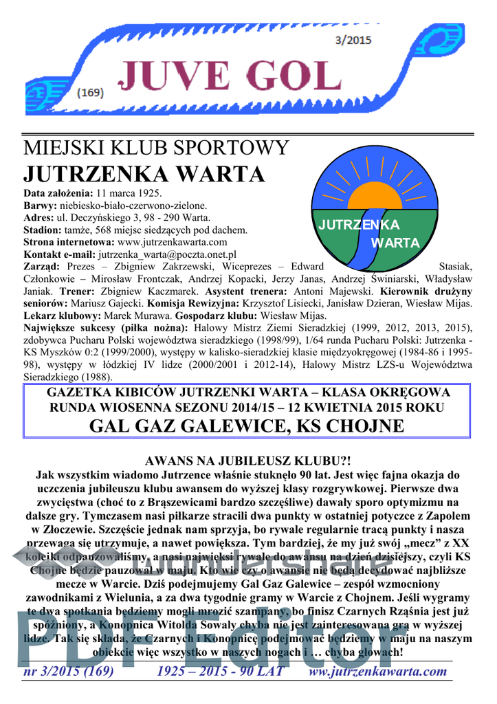 MIEJSKI KLUB SPORTOWY JUTRZENKA WARTA Data założenia: 11 marca 1925. Barwy: niebiesko-biało-czerwono-zielone. Adres: ul. Deczyńskiego 3, 98 - 290 Warta. JUTRZENKA Stadion: tamże, 568 miejsc siedzących pod dachem. Strona internetowa: www.jutrzenkawarta.com WARTA Kontakt e-mail: [email protected] Zarząd: Prezes – Zbigniew Zakrzewski, Wiceprezes – Edward Stasiak, Członkowie – Mirosław Frontczak, Andrzej Kopacki, Jerzy Janas, Andrzej Świniarski, Władysław Janiak. Trener: Zbigniew Kaczmarek. Asystent trenera: Antoni Majewski. Kierownik drużyny seniorów: Mariusz Gajecki. Komisja Rewizyjna: Krzysztof Lisiecki, Janisław Dzieran, Wiesław Mijas. Lekarz klubowy: Marek Murawa. Gospodarz klubu: Wiesław Mijas. Największe sukcesy (piłka nożna): Halowy Mistrz Ziemi Sieradzkiej (1999, 2012, 2013, 2015), zdobywca Pucharu Polski województwa sieradzkiego (1998/99), 1/64 runda Pucharu Polski: Jutrzenka KS Myszków 0:2 (1999/2000), występy w kalisko-sieradzkiej klasie międzyokręgowej (1984-86 i 199598), występy w łódzkiej IV lidze (2000/2001 i 2012-14), Halowy Mistrz LZS-u Województwa Sieradzkiego (1988). GAZETKA KIBICÓW JUTRZENKI WARTA – KLASA OKRĘGOWA RUNDA WIOSENNA SEZONU 2014/15 – 12 KWIETNIA 2015 ROKU GAL GAZ GALEWICE, KS CHOJNE AWANS NA JUBILEUSZ KLUBU?! Jak wszystkim wiadomo Jutrzence właśnie stuknęło 90 lat. Jest więc fajna okazja do uczczenia jubileuszu klubu awansem do wyższej klasy rozgrywkowej. Pierwsze dwa zwycięstwa (choć to z Brąszewicami bardzo szczęśliwe) dawały sporo optymizmu na dalsze gry. Tymczasem nasi piłkarze stracili dwa punkty w ostatniej potyczce z Zapolem w Złoczewie. Szczęście jednak nam sprzyja, bo rywale regularnie tracą punkty i nasza przewaga się utrzymuje, a nawet powiększa. Tym bardziej, że my już swój „mecz” z XX TM kolejki odpauzowaliśmy, a nasi najwięksi rywale do awansu na dzień dzisiejszy, czyli KS Chojne będzie pauzował w maju. Kto wie czy o awansie nie będą decydować najbliższe mecze w Warcie. Dziś podejmujemy Gal Gaz Galewice – zespół wzmocniony zawodnikami z Wielunia, a za dwa tygodnie gramy w Warcie z Chojnem. Jeśli wygramy te dwa spotkania będziemy mogli mrozić szampany, bo finisz Czarnych Rząśnia jest już spóźniony, a Konopnica Witolda Sowaly chyba nie jest zainteresowana grą w wyższej lidze. Tak się składa, że Czarnych i Konopnicę podejmować będziemy w maju na naszym obiekcie więc wszystko w naszych nogach i … chyba głowach! PDF Editor nr 3/2015 (169) 1925 – 2015 - 90 LAT ww.jutrzenkawarta.com KLUB FINANSOWANY I WSPIERANY PRZEZ: GMINA I MIASTO WARTA PAN MAREK MURAWA TM PDF Editor nr 3/2015 (169) 1925 – 2015 - 90 LAT ww.jutrzenkawarta.com OKIEM KIBICA: Bo jak nie teraz to kiedy Ostatni mecz polskiej reprezentacji pokazał jak nieobliczalną mamy drużynę. Historyczne zwycięstwo z Niemcami to jedno, remis z irlandzkimi kopaczami to drugie. Dwa światy? Zbieg okoliczności (tryumf z sąsiadami)? A może codzienność (kopanina z wyspiarzami)? Nie sposób pozbyć się wrażenia, że jeśli wygrywamy z mistrzami świata i chcemy cokolwiek znaczyć z piłkarskiej Europie, to taki mecz z 29 marca powinniśmy wygrywać łatwo, strzelając dodatkowo kilka bramek. Jednakże ku naszemu zaskoczeniu w marcowy wieczór widzieliśmy nieporadnych graczy polskiej reprezentacji, którzy już w 70 minucie cofnęli się do głębokiej defensywy, wyczekując ostatniego gwizdka arbitra. Jaka jest więc prawda o naszej drużynie? W kontekście tego heroicznego boju, wracają pytania o brak powołania dla Jakuba Błaszczykowskiego. Popularny „Kuba” wprowadzony do gry w końcówce z pewnością potrafiłby przetrzymać piłkę z dala od naszej bramki, ściągając na siebie uwagę kilku obrońców. Mając takiego gracza jak Błaszczykowski w odwodzie, mamy przynajmniej kim straszyć przeciwników. Nikt mi nie powie, że Kucharczyk czy Mączyński (nawet razem wzięci) robią większe wrażenie na rywalach niż „Kuba”. Naszym reprezentantom zabrakło w tym meczu konsekwencji i pewności własnej klasy piłkarskiej. Skoro wygrywasz z najlepszymi, w kolejnych meczach musisz grać jeszcze lepiej, aby potwierdzić swoją wartość. Sytuacja w grupie przed kolejnymi meczami może być nieco myląca. Oto jesteśmy liderami grupy, a za nami są mistrzowie świata. Ten widok może nieco uśpić naszą czujność. Przed nami bowiem trudne spotkanie z sąsiadami („nic dwa razy się nie zdarza...”) i bardzo ciężki bój ze Szkocją. Aby 11 października 2015 roku świętować po meczu z Irlandią, musimy przynajmniej nie przegrać spotkania wyjazdowego ze Szkotami. Jak trudne będą to zawody pokazał pierwszy mecz z tą drużyną oraz ostatnie spotkanie z Irlandią. Nie leży nam taki prosty i twardy typ grania w piłkę. Do znudzenia powtarzane akcje: długa piłka na wysokiego napastnika, zgranie na skrzydło i wrzutka – sieją popłoch w naszych szeregach. Do tego drużyna szkocka ma zdecydowanie lepszych graczy niż nasz ostatni przeciwnik. Na pewno na finiszu eliminacji do ME musimy znowu wnieść się na wyżyny swoich możliwości. W innym razie może się okazać, że przyjdzie nam grać w barażach do Euro 2016. A na tym etapie rozgrywek na tak przeciętnych przeciwników jak w grupie (poza Niemcami) już nie trafimy. Przechodząc do baraży, możemy zagrać z: Holandią, Szwajcarią, Rosją, Serbią czy Szwecją. Nie trzeba wyjaśniać jak trudne byłyby te mecze – i że nikt nikomu nie odda miejsca we Francji bez totalnej wojny na piłkarskiej murawie. Musimy sobie oszczędzić tych dodatkowych emocji w barażach o awans do przyszłorocznych Mistrzostw Europy. Droga do turnieju we Francji wiedzie jednak przez boisko Szkotów oraz przez... dobre rezultaty w innych spotkaniach. Zdecydowanie łatwiej będzie nam się grało jesienią, gdy Irlandia pokona w czerwcu Szkocję. My natomiast nie możemy dać się zaskoczyć Gruzinom. To byłaby bowiem katastrofa i poważny 