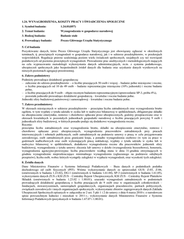 1.24. WYNAGRODZENIA, KOSZTY PRACY I ŚWIADCZENIA SPOŁECZNE 1. Symbol badania: 1.24.01(057) 2. Temat badania: Wynagrodzenia w gospodarce narodowej 3. Rodzaj badania: Badanie stałe 4. Prowadzący badanie: Prezes Głównego Urzędu Statystycznego 5. Cel badania Pozyskiwanie danych, które Prezes Głównego Urzędu Statystycznego jest obowiązany ogłaszać w określonych terminach, tj. przeciętnych wynagrodzeń w gospodarce narodowej, jak i w sektorze przedsiębiorstw, w przekrojach wojewódzkich. Regulacje prawne uzależniają poziom wielu świadczeń społecznych, socjalnych czy też rozwiązań podatkowych od poziomu przeciętnych wynagrodzeń. Prowadzenie prac analitycznych i metodologicznych mających na celu wypracowanie metodologii wykorzystania danych administracyjnych, m.in. z systemu podatkowego, ubezpieczeń społecznych jako bezpośrednich źródeł danych dla badania oraz uzyskanie danych wynikowych na niższych poziomach agregacji przestrzennej. 6. Zakres podmiotowy Podmioty prowadzące działalność gospodarczą: – zaliczone do sektora przedsiębiorstw – o liczbie pracujących 50 osób i więcej – badanie pełne miesięczne i roczne, o liczbie pracujących od 10 do 49 osób – badanie reprezentacyjne miesięczne (10% jednostek) i roczne badanie pełne, – o liczbie pracujących do 9 osób – objęte rocznym badaniem reprezentacyjnym (sprawozdanie SP-3, próba 4%), – pozostałe jednostki prowadzące działalność gospodarczą – kwartalne i roczne badanie pełne. Jednostki sfery budżetowej państwowej i samorządowej – kwartalne i roczne badanie pełne. 7. Zakres przedmiotowy W okresach miesięcznych w sektorze przedsiębiorstw – przeciętna liczba zatrudnionych oraz wynagrodzenia brutto ogółem, w tym wypłaty z tytułu udziału w zysku lub w nadwyżce bilansowej w spółdzielniach, obligatoryjne składki na ubezpieczenie emerytalne, rentowe i chorobowe opłacane przez ubezpieczonych, godziny przepracowane oraz w okresach kwartalnych w pozostałych jednostkach gospodarki narodowej o liczbie pracujących powyżej 9 osób i jednostkach sfery budżetowej, w których ponadto podaje się dodatkowe wynagrodzenia roczne. Rocznie: przeciętna liczba zatrudnionych oraz wynagrodzenia brutto, składki na ubezpieczenie emerytalne, rentowe i chorobowe opłacane przez ubezpieczonych, wynagrodzenia pracowników zatrudnionych przy pracach interwencyjnych i robotach publicznych, osób zatrudnionych na podstawie umowy o pracę w celu przygotowania zawodowego, osób zatrudnionych poza granicami kraju, a ponadto wynagrodzenia osobowe (w tym za prace w godzinach nadliczbowych oraz osób wykonujących pracę nakładczą), wypłaty z tytułu udziału w zysku lub w nadwyżce bilansowej w spółdzielniach, dodatkowe wynagrodzenia roczne dla pracowników jednostek sfery budżetowej, wynagrodzenia z tytułu umowy zlecenia lub umowy o dzieło (wynagrodzenia bezosobowe), honoraria, wynagrodzenia agencyjno-prowizyjne; liczba pracowników według stanu w dniu 31 grudnia otrzymujących w grudniu wynagrodzenie nieprzekraczające minimalnego wynagrodzenia (ogłaszanego na podstawie odrębnych przepisów), liczba osób, wobec których wystąpiły zaległości w wypłacie wynagrodzeń, oraz wysokość tych zaległości. 8. Źródła danych Dane Ministerstwa Finansów z Systemu Informacji Podatkowych – Baza danych o podatnikach podatku dochodowego od osób fizycznych (PIT). Wtórne wykorzystanie danych ze sprawozdań GUS: Z-03, Z-06, (omówionych w badaniu 1.23.02), DG-1 (omówionych w badaniu 1.61.04), SP-3 (omówionych w badaniu 1.61.05), wykorzystanie danych ZUS z KSI ZUS – Centralny Rejestr Ubezpieczonych, KSI ZUS – Centralny Rejestr Płatników Składek (omówionych w badaniu 1.23.02 i 1.80.01); szacunki wynagrodzeń zatrudnionych w podmiotach prowadzących działalność gospodarczą o liczbie pracujących do 9 osób oraz w organizacjach członkowskich – fundacjach, stowarzyszeniach, samorządach gospodarczych, organizacjach pracodawców, partiach politycznych, związkach zawodowych i innych organizacjach społecznych; wykorzystanie zbiorów zagregowanych danych Zakładu Ubezpieczeń Społecznych opisanych w załączniku nr 2 ust. 5 pkt 1 i 2 do ustawy z dnia 4 marca 2010 r. o narodowym spisie powszechnym ludności i mieszkań w 2011 r.; wykorzystanie danych Ministerstwa Finansów z Systemu Informacji Podatkowych (pozyskanych w badaniu 1.67.07 i 1.80.01). Lp. Podmioty przekazujące dane statystyczne Forma przekazania danych 8.0 8.1 1 Ministerstwo Finansów 8.2 System Informacji Podatkowych – Baza danych o podatnikach podatku dochodowego od osób fizycznych (PIT); dane jednostkowe o płatnikach podatku dochodowego od osób fizycznych nieprowadzących samodzielnie działalności gospodarczej wykazanych w lp. 2 w zakresie: NIP płatnika, rodzaj płatnika, adres siedziby lub zamieszkania płatnika: kod kraju, kod województwa, kod powiatu, kod gminy, miejscowość, ulica, numer domu, kod pocztowy, poczta; w formie elektronicznej 2 Ministerstwo Finansów System Informacji Podatkowych – Baza danych o podatnikach podatku dochodowego od osób fizycznych (PIT); dane zagregowane (PIT-11, PIT-40) dotyczące podatników podatku dochodowego od osób fizycznych nieprowadzących samodzielnie działalności gospodarczej według: NIP płatnika, miejsca zamieszkania podatnika (województwo, powiat, gmina), płci podatnika w zakresie: – koszty uzyskania przychodu, przychód, dochód, dochód zwolniony z podatku, zaliczka pobrana przez płatnika według liczby podatników oraz tytułów: – należności ze stosunku: pracy, służbowego, spółdzielczego i z pracy nakładczej, a także zasiłki pieniężne z ubezpieczenia społecznego wypłacone przez zakład pracy, o którym mowa w art. 31 ustawy z dnia 26 lipca 1991 r. o podatku dochodowym od osób fizycznych, oraz płatników, o których mowa w art. 42e ust. 1 ustawy z dnia 26 lipca 1991 r. o podatku dochodowym od osób fizycznych, – 
