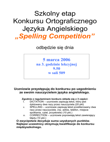 Szkolny etap Konkursu Ortograficznego Języka Angielskiego „Spelling Competition” odbędzie się dnia 5 marca 2006 na 3. godzinie lekcyjnej 9.50 w sali 509 Uczniowie przystępują do konkursu po uzgodnieniu ze swoim nauczycielem języka angielskiego. Zgodnie z regulaminem konkurs składa się z 3 części: I. DICTATION – uczniowie zapisują tekst, który jest dyktowany dwa razy przez nauczyciela.(20 pkt) II. SPELLING – uczniowie zapisują tekst przeliterowany dwa razy przez nauczyciela. (np. adres, telefon, miejsce spotkania, cytat, przysłowie) (10 pkt.) III. CORRECTION – uczniowie poprawiają tekst zawierający błędy.(10 pkt.) O zwycięstwie decyduje suma uzyskanych punktów. Najlepsi uczestnicy otrzymują kwalifikacje do konkursu międzyszkolnego.