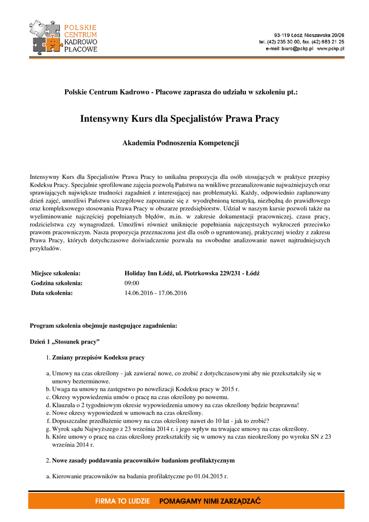 Polskie Centrum Kadrowo - Płacowe zaprasza do udziału w szkoleniu pt.: Intensywny Kurs dla Specjalistów Prawa Pracy Akademia Podnoszenia Kompetencji Intensywny Kurs dla Specjalistów Prawa Pracy to unikalna propozycja dla osób stosujących w praktyce przepisy Kodeksu Pracy. Specjalnie sprofilowane zajęcia pozwolą Państwu na wnikliwe przeanalizowanie najważniejszych oraz sprawiających największe trudności zagadnień z interesującej nas problematyki. Każdy, odpowiednio zaplanowany dzień zajęć, umożliwi Państwu szczegółowe zapoznanie się z wyodrębnioną tematyką, niezbędną do prawidłowego oraz kompleksowego stosowania Prawa Pracy w obszarze przedsiębiorstw. Udział w naszym kursie pozwoli także na wyeliminowanie najczęściej popełnianych błędów, m.in. w zakresie dokumentacji pracowniczej, czasu pracy, rodzicielstwa czy wynagrodzeń. Umożliwi również uniknięcie popełniania najczęstszych wykroczeń przeciwko prawom pracowniczym. Nasza propozycja przeznaczona jest dla osób o ugruntowanej, praktycznej wiedzy z zakresu Prawa Pracy, których dotychczasowe doświadczenie pozwala na swobodne analizowanie nawet najtrudniejszych przykładów. Miejsce szkolenia: Holiday Inn Łódź, ul. Piotrkowska 229/231 - Łódź Godzina szkolenia: 09:00 Data szkolenia: 14.06.2016 - 17.06.2016 Program szkolenia obejmuje następujące zagadnienia: Dzień 1 „Stosunek pracy” 1. Zmiany przepisów Kodeksu pracy a. Umowy na czas określony - jak zawierać nowe, co zrobić z dotychczasowymi aby nie przekształciły się w umowy bezterminowe. b. Uwaga na umowy na zastępstwo po nowelizacji Kodeksu pracy w 2015 r. c. Okresy wypowiedzenia umów o pracę na czas określony po nowemu. d. Klauzula o 2 tygodniowym okresie wypowiedzenia umowy na czas określony będzie bezprawna! e. Nowe okresy wypowiedzeń w umowach na czas określony. f. Dopuszczalne przedłużenie umowy na czas określony nawet do 10 lat - jak to zrobić? g. Wyrok sądu Najwyższego z 23 września 2014 r. i jego wpływ na trwające umowy na czas określony. h. Które umowy o pracę na czas określony przekształciły się w umowy na czas nieokreślony po wyroku SN z 23 września 2014 r. 2. Nowe zasady poddawania pracowników badaniom profilaktycznym a. Kierowanie pracowników na badania profilaktyczne po 01.04.2015 r. b. W jakich sytuacjach pracodawca będzie mógł odstąpić od poddawania pracownika wstępnym badaniom lekarskim? c. Jakie kryteria stosować przy ustalaniu, czy warunki pracy w nowym miejscu pracy są tożsame z warunkami na dotychczasowym stanowisku pracy? 3. Kontrola PIP w zakładzie a. Jak przygotować się do kontroli inspektora pracy w zakładzie? b. W jakim zakresie inspektor pracy kontroluje dokumentację pracowniczą i za jaki okres. c. Szczegółowa kontrola badań lekarskich i szkoleń bhp w zakładzie – na co zwrócić uwagę. d. Odpowiedzialność za wykroczenia przeciwko prawom pracowniczym – jakie naruszenie jest wykroczeniem, jak nie popełniać wykroczeń? 4. Stosunek pracy a. Umowa zlecenia, umowa o dzieło – kiedy Inspektor Pracy je zakwestionuje. b. Nowelizacja przepisów z zakresu wynagradzania zleceniobiorców oraz prowadzenia dla nich ewidencji czasu pracy w 2016 r. c. Umowę zlecenia z własnym pracownikiem – kiedy to możliwe? d. Umowa o pracę na półtora etatu – czy będzie zakwestionowana? e. Umowa na część etatu – pamiętaj o dodatkowych elementach. f. Treść umowy o pracę – unikaj często popełnianych błędów. g. Miejsce pracy w umowie o pracę określone obszarowo – kiedy będzie zakwestionowane? h. Jak prawidłowo określić dzień rozpoczęcia pracy w umowie o pracę (np. 1 stycznia, czy 2 stycznia). i. Regulamin pracy – nieprzemyślane zapisy = poważne konsekwencje. j. Co warto zawrzeć w treści regulaminu pracy, a czego lepiej unikać? k. Jak prawidłowo wskazać przyczynę wypowiedzenia by nie narazić się na przywrócenie pracownika do pracy przez Sąd. l. Kiedy wysłać i jak określić termin rozwiązania umowy z pracownikiem długotrwale chorym (art. 53 Kp). 5. Dokumentacja pracownicza a. Umowę trzeba będzie podpisać przed dopuszczeniem do pracy pracownika – nowelizacja KP w 2016 r. b. Akta osobowe – nie żądaj dokumentów, za które kontrolujący może skierować zawiadomienie do prokuratury o bezprawne gromadzenie danych osobowych. c. Badania lekarskie, szkolenia bhp – oryginały czy kopie w aktach osobowych? d. Informacja o warunkach zatrudnienia (art. 29 § 3 Kp) – najczęstsze błędy. e. Wydawanie świadectw pracy po nowemu – kiedy wydać by nie popełnić wykroczenia? f. Najczęstsze błędy w treści świadectwa pracy. g. W której części akt umieścić świadectwa pracy i dyplomy doniesione przez pracownika w trakcie zatrudnienia. h. W której części akt umieścić porozumienie urlopowe. i. W której części akt umieścić świadectwa doniesione w trakcie zatrudnienia. j. Wpływ doniesionych świadectw w trakcie zatrudnienia na wymiar urlopu i dodatek stażowy – czy liczyć wstecz. Dzień 2 „Czas pracy” 1. Planowanie czasu pracy po nowelizacji Kodeksu pracy a. Kto ma obowiązek tworzenia harmonogramów czasu pracy. b. W jakiej formie należy sporządzić harmonogram. c. W jakim czasie i w jaki sposób pracownik powinien być poinformowany o obowiązującym go harmonogramie. d. Czy można zmieniać harmonogram w trakcie jego obowiązywania. e. Przechowywanie harmonogramów czasu pracy. f. Harmonogram czasu pracy a rozkład czasu pracy pracownika. g. Tworzenie grafików – zajęcia praktyczne. 2. Okresy rozliczeniowe czasu pracy – czy warto wydłużyć? a. Co to jest okres rozliczeniowy i jakie są konsekwencje jego ustalenia. b. Podstawowa długość okresu rozliczeniowego w poszczególnych systemach czasu pracy. c. Przedłużenie okresu rozliczeniowego do 12 miesięcy – zasady, niezbędne formalności. d. Informowanie organów PIP o przedłużonym okresie – konsekwencje poinformowania lub brak