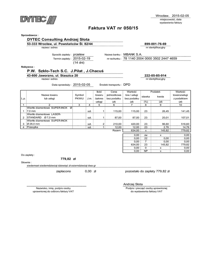 Wrocław, 2015-02-05 miejscowość, data wystawienia faktury Faktura VAT nr 050/15 Sprzedawca : DYTEC Consulting Andrzej Słota 53-333 Wrocław, ul. Powstańców Śl. 82/44 899-001-76-69 nazwa i adres nr identyfikacyjny Sposób zapłaty : Termin zapłaty : przelew 2015-02-19 (14 dni) Nazwa banku : nr rachunku : MBANK S.A. 78 1140 2004 0000 3502 2447 4659 Nabywca : P.W. Szkło-Tech S.C. J.Piłat , J.Chacuś 43-600 Jaworzno, ul. Staszica 20 222-05-85-914 nazwa i adres nr identyfikacyjny Data sprzedaży : Nazwa towaru lub usługi L.p. 1 1 2 3 4 2015-02-05 2 Wiertło diamentowe SUPER-INOX 7,0 mm Wiertło diamentowe LASERSTANDARD Ø 7,0 mm Wiertło diamentowe SUPER-INOX Ø 26,0 mm Przesylka Symbol PKWiU J.m. 3 4 Środek transportu : Ilość towaru /zakres usługi 5 DPD Cena jednostkowa bez podatku (zł) 6 Wartość tow./ usługi bez podatku (zł) 7 Podatek stawka kwota (%) 8 (zł) 9 Wartość towaru/usługi z podatkiem (zł) 10 Ø szt. 1 115,00 115,00 23 26,45 141,45 szt. 1 87,00 87,00 23 20,01 107,01 szt. szt. 2 1 210,00 12,00 Razem 420,00 12,00 634,00 23 23 x 96,60 2,76 145,82 516,60 14,76 779,82 0,00 0,00 0,00 634,00 0,00 0,00 zw 22 7 23 0 NP x 0,00 0,00 0,00 779,82 0,00 0,00 0,00 0,00 145,82 x x Do zapłaty : 779,82 zł Słownie : siedemset siedemdziesiąt dziewięć zł osiemdziesiąt dwa gr zapłacono 0,00 zł pozostało do zapłaty 779,82 zł Andrzej Słota Nazwisko, imię, podpis osoby uprawnionej do odbioru faktury VAT Podpis i pieczęć osoby uprawnionej do wystawienia faktury VAT