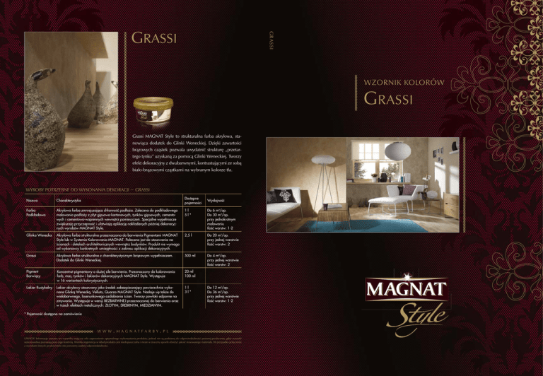 GRAS S I GRASSI WZORNIK KOLORÓW G RASSI Grassi MAGNAT Style to strukturalna farba akrylowa, stanowiąca dodatek do Glinki Weneckiej. Dzięki zawartości brązowych cząstek pozwala uwydatnić strukturę „przetartego tynku” uzyskaną za pomocą Glinki Weneckiej. Tworzy efekt dekoracyjny z dwubarwnymi, kontrastującymi ze sobą biało-brązowymi cząstkami na wybranym kolorze tła. WYROBY POTRZEBNE DO WYKONANIA DEKORACJI − GRASSI Dostępne pojemności Nazwa Charakterystyka Wydajność Farba Podkładowa Akrylowa farba zmniejszająca chłonność podłoża. Zalecana do podkładowego malowania podłoży z płyt gipsowo-kartonowych, tynków gipsowych, cementowych i cementowo-wapiennych wewnątrz pomieszczeń. Specjalne wypełniacze zwiększają przyczepność i ułatwiają aplikację nakładanych później dekoracyjnych wyrobów MAGNAT Style. 1l 5l* Do 6 m2/op. Do 30 m2/op. przy jednokrotnym malowaniu Ilość warstw: 1-2 Glinka Wenecka Akrylowa farba strukturalna przeznaczona do barwienia Pigmentami MAGNAT Style lub w Systemie Kolorowania MAGNAT. Polecana jest do stosowania na ścianach i detalach architektonicznych wewnątrz budynków. Produkt nie wymaga od wykonawcy konkretnych umiejętności z zakresu aplikacji dekoracyjnych. 2,5 l Do 20 m2/op. przy jednej warstwie Ilość warstw: 2 Grassi Akrylowa farba strukturalna z charakterystycznym brązowym wypełniaczem. Dodatek do Glinki Weneckiej. 500 ml Do 4 m2/op. przy jednej warstwie Ilość warstw: 2 Pigment Barwiący Koncentrat pigmentowy o dużej sile barwienia. Przeznaczony do kolorowania farb, mas, tynków i lakierów dekoracyjnych MAGNAT Style. Występuje w 16 wariantach kolorystycznych. 20 ml 100 ml Lakier Rustykalny Lakier akrylowy stosowany jako środek zabezpieczający powierzchnie wykonane Glinką Wenecką, Velluto, Quarzo MAGNAT Style. Nadaje się także do wielobarwnego, laserunkowego ozdabiania ścian. Tworzy powłoki odporne na zmywanie. Występuje w wersji BEZBARWNEJ przeznaczonej do barwienia oraz w trzech efektach metalicznych: ZŁOTYM, SREBRNYM, MIEDZIANYM. 1l 3l* Do 12 m2/op. Do 36 m2/op. przy jednej warstwie Ilość warstw: 1-2 * Pojemność dostępna na zamówienie W W W . M A G N AT FA R B Y . P L UWAGA! Informacje zawarte we wzorniku mają na celu zapewnienie optymalnego wykorzystania produktu, jednak nie są podstawą do odpowiedzialności prawnej producenta, gdyż warunki wykonawstwa pozostają poza jego kontrolą. Wszelka ingerencja w skład produktu jest niedopuszczalna i może w znaczny sposób obniżyć jakość stosowanego materiału. W przypadku połączenia z wyrobami innych producentów nie ponosimy żadnej odpowiedzialności. GW 2,5 l + G 0,5 l + PB MALACHIT P7 20 ml GW 2,5 l + G 0,5 l + PB OLIWIN P8 20 ml GW 2,5 l + G 0,5 l + PB OLIWIN P8 20 ml + PB KWARC P9 20 ml GW 2,5 l + G 0,5 l + PB ONYKS P5 20 ml GW 2,5 l + G 0,5 l + PB KALCYT P4 20 ml GW 2,5 l + G 0,5 l + PB KALCYT P4 20 ml + PB KWARC P9 20 ml GW 2,5 l + G 0,5 l + PB CYTRYN P2 20 ml GW 2,5 l + G 0,5 l + PB CYTRYN P2 20 ml + PB KWARC P9 20 ml GW 2,5 l + G 0,5 l + PB JANTAR P6 20 ml GW 2,5 l + G 0,5 l + PB AGAT P3 20 ml GW 2,5 l + G 0,5 l + PB AGAT P3 20 ml + PB KWARC P9 20 ml GW 2,5 l + G 0,5 l + PB KRYSZTAŁ P1 20 ml GW 2,5 l + G 0,5 l + PB RUBIN P12 20 ml GW 2,5 l + G 0,5 l + PB RUBIN P12 20 ml + PB ONYKS P5 20 ml GW 2,5 l + G 0,5 l + PB KWARC P9 20 ml GW 2,5 l + G 0,5 l + PB AMETYST P14 20 ml GW – Glinka Wenecka, PB – Pigment Barwiący, G – Grassi GRAS S I GRASSI WZORNIK KOLORÓW G RASSI Grassi MAGNAT Style to strukturalna farba akrylowa, stanowiąca dodatek do Glinki Weneckiej. Dzięki zawartości brązowych cząstek pozwala uwydatnić strukturę „przetartego tynku” uzyskaną za pomocą Glinki Weneckiej. Tworzy efekt dekoracyjny z dwubarwnymi, kontrastującymi ze sobą biało-brązowymi cząstkami na wybranym kolorze tła. WYROBY POTRZEBNE DO WYKONANIA DEKORACJI − GRASSI Dostępne pojemności Nazwa Charakterystyka Wydajność Farba Podkładowa Akrylowa farba zmniejszająca chłonność podłoża. Zalecana do podkładowego malowania podłoży z płyt gipsowo-kartonowych, tynków gipsowych, cementowych i cementowo-wapiennych wewnątrz pomieszczeń. Specjalne wypełniacze zwiększają przyczepność i ułatwiają aplikację nakładanych później dekoracyjnych wyrobów MAGNAT Style. 1l 5l* Do 6 m2/op. Do 30 m2/op. przy jednokrotnym malowaniu Ilość warstw: 1-2 Glinka Wenecka Akrylowa farba strukturalna przeznaczona do barwienia Pigmentami MAGNAT Style lub w Systemie Kolorowania MAGNAT. Polecana jest do stosowania na ścianach i detalach architektonicznych wewnątrz budynków. Produkt nie wymaga od wykonawcy konkretnych umiejętności z zakresu aplikacji dekoracyjnych. 2,5 l Do 20 m2/op. przy jednej warstwie Ilość warstw: 2 Grassi Akrylowa farba strukturalna z charakterystycznym brązowym wypełniaczem. Dodatek do Glinki Weneckiej. 500 ml Do 4 m2/op. przy jednej warstwie Ilość warstw: 2 Pigment Barwiący Koncentrat pigmentowy o dużej sile barwienia. Przeznaczony do kolorowania farb, mas, tynków i lakierów dekoracyjnych MAGNAT Style. Występuje w 16 wariantach kolorystycznych. 20 ml 100 ml Lakier Rustykalny Lakier akrylowy stosowany jako środek zabezpieczający powierzchnie wykonane Glinką Wenecką, Velluto, Quarzo MAGNAT Style. Nadaje się także do wielobarwnego, laserunkowego ozdabiania ścian. Tworzy powłoki odporne na zmywanie. Występuje w wersji BEZBARWNEJ przeznaczonej do barwienia oraz w trzech efektach metalicznych: ZŁOTYM, SREBRNYM, MIEDZIANYM. 1l 3l* Do 12 m2/op. Do 36 m2/op. przy jednej warstwie Ilość warstw: 1-2 * Pojemność dostępna na zamówienie W W W . M A G N AT FA R B Y . P L UWAGA! Informacje zawarte we wzorniku mają na celu zapewnienie optymalnego wykorzystania produktu, jednak nie są podstawą do odpowiedzialności prawnej producenta, gdyż warunki wykonawstwa pozostają poza jego kontrolą. Wszelka ingerencja w skład produktu jest niedopuszczalna i może w znaczny sposób obniżyć jakość st
