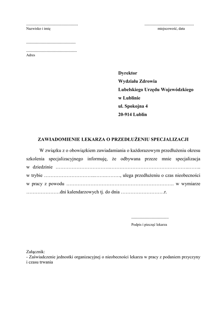 ........................................... ......................................... Nazwisko i imię miejscowość, data ......................................... .......................................... Adres Dyrektor Wydziału Zdrowia Lubelskiego Urzędu Wojewódzkiego w Lublinie ul. Spokojna 4 20-914 Lublin ZAWIADOMIENIE LEKARZA O PRZEDŁUŻENIU SPECJALIZACJI W związku z o obowiązkiem zawiadamiania o każdorazowym przedłużeniu okresu szkolenia specjalizacyjnego informuję, że odbywana przeze mnie specjalizacja w dziedzinie …………………………….………………………………………….…….. w trybie …………………………..…….………, ulega przedłużeniu o czas nieobecności w pracy z powodu …………………………………………………………. w wymiarze …………………dni kalendarzowych tj. do dnia ………………………r. ............................... Podpis i pieczęć lekarza Załącznik: - Zaświadczenie jednostki organizacyjnej o nieobecności lekarza w pracy z podaniem przyczyny i czasu trwania