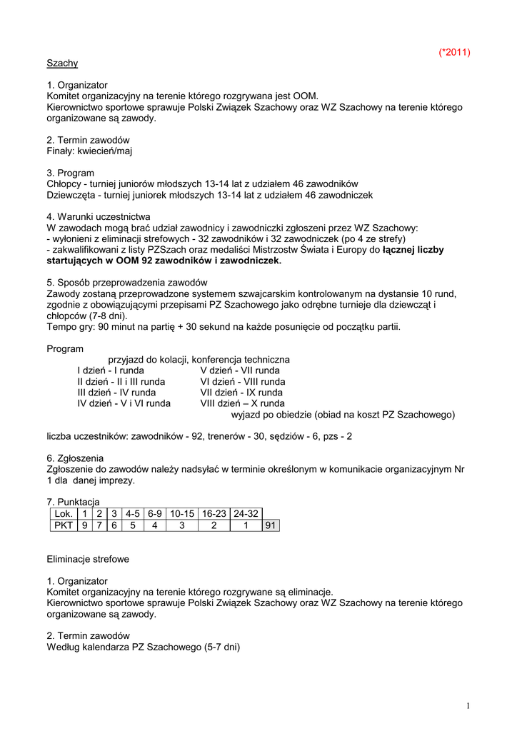 (*2011) Szachy 1. Organizator Komitet organizacyjny na terenie którego rozgrywana jest OOM. Kierownictwo sportowe sprawuje Polski Związek Szachowy oraz WZ Szachowy na terenie którego organizowane są zawody. 2. Termin zawodów Finały: kwiecień/maj 3. Program Chłopcy - turniej juniorów młodszych 13-14 lat z udziałem 46 zawodników Dziewczęta - turniej juniorek młodszych 13-14 lat z udziałem 46 zawodniczek 4. Warunki uczestnictwa W zawodach mogą brać udział zawodnicy i zawodniczki zgłoszeni przez WZ Szachowy: - wyłonieni z eliminacji strefowych - 32 zawodników i 32 zawodniczek (po 4 ze strefy) - zakwalifikowani z listy PZSzach oraz medaliści Mistrzostw Świata i Europy do łącznej liczby startujących w OOM 92 zawodników i zawodniczek. 5. Sposób przeprowadzenia zawodów Zawody zostaną przeprowadzone systemem szwajcarskim kontrolowanym na dystansie 10 rund, zgodnie z obowiązującymi przepisami PZ Szachowego jako odrębne turnieje dla dziewcząt i chłopców (7-8 dni). Tempo gry: 90 minut na partię + 30 sekund na kaŜde posunięcie od początku partii. Program przyjazd do kolacji, konferencja techniczna I dzień - I runda V dzień - VII runda II dzień - II i III runda VI dzień - VIII runda III dzień - IV runda VII dzień - IX runda IV dzień - V i VI runda VIII dzień – X runda wyjazd po obiedzie (obiad na koszt PZ Szachowego) liczba uczestników: zawodników - 92, trenerów - 30, sędziów - 6, pzs - 2 6. Zgłoszenia Zgłoszenie do zawodów naleŜy nadsyłać w terminie określonym w komunikacie organizacyjnym Nr 1 dla danej imprezy. 7. Punktacja Lok. 1 2 3 4-5 6-9 10-15 16-23 24-32 PKT 9 7 6 5 4 3 2 1 91 Eliminacje strefowe 1. Organizator Komitet organizacyjny na terenie którego rozgrywane są eliminacje. Kierownictwo sportowe sprawuje Polski Związek Szachowy oraz WZ Szachowy na terenie którego organizowane są zawody. 2. Termin zawodów Według kalendarza PZ Szachowego (5-7 dni) 1 4. Warunki uczestnictwa W zawodach mogą brać udział zawodnicy i zawodniczki zgłoszeni przez WZ Szachowy. Zawodnik moŜe wystąpić tylko w swojej grupie wiekowej. 5. Sposób przeprowadzenia zawodów Zawody zostaną przeprowadzone systemem szwajcarskim kontrolowanym na dystansie 7-9 rund, zgodnie z obowiązującymi przepisami PZ Szachowego jako odrębne turnieje dla dziewcząt i chłopców. Tempo gry: umoŜliwiające zdobycie centralnych kategorii szachowych. 6. Zgłoszenia Zgłoszenie do zawodów naleŜy nadsyłać w terminie określonym w komunikacie organizacyjnym Nr 1 dla danej imprezy. 7. Ocena wyników Do zawodów finałowych awansują zawodnicy i zawodniczki, którzy w eliminacjach strefowych zajęli miejsca 1-4. D. System ocen Szachy II. Mistrzostwa Polski Juniorów K/M - 17-18 lat K/M - 15-16 lat 1. Program K/M - indywidualnie 2. Punktacja 17-18 lat Lok. 1 2 3 4 5 6 7 8 9-10 11-14 15-18 19-24 PKT 15 12 10 9 8 7 6 5 4 3 2 1 106 15-16 lat Lok. 1 2 3 4 5 6 7-8 9-12 13-16 17-24 25-32 PKT 12 10 9 8 7 6 5 4 3 2 1 114 III. Olimpiada MłodzieŜy- Mistrzostwa Polski Juniorów Młodszych K/M - 13-14 lat 1. Program K/M - indywidualnie 2. Punktacja Lok. 1 2 3 4-5 6-9 10-15 16-23 24-32 PKT 9 7 6 5 4 3 2 1 91 Eliminacje do OOM - strefowe Strefy A – WLP-ZPM D – DŚL-LBU G – ŚL-OPO B – POM-KPM E – ŁDZ-ŚWI H – MŁP-PKR C – MAZ-WM F – LUB-PDL 2 III. Mistrzostwa Polski Juniorów Młodszych 1. Program K/M - indywidualnie 2. Punktacja Lok. 1 2-3 4-8 9-16 17-24 25-32 PKT 6 5 4 3 2 1 K/M - 11-12 lat 84 IV. Międzywojewódzkie Mistrzostwa Młodzików 1. Program K/M - indywidualnie 2. Punktacja Lok. 1 2-3 4-12 PKT 3 2 1 16 Strefy A – WLP-ZPM D – DŚL-LBU G – ŚL-OPO K/M – 9-10 lat B – POM-KPM E – ŁDZ-ŚWI H – MŁP-PKR C – MAZ-WM F – LUB-PDL Szachy szybkie II. Mistrzostwa Polski Juniorów K/M - 17-18 lat K/M - 15-16 lat 1. Program K/M - indywidualnie 2. Punktacja 17-18 lat Lok. 1 2 3 4 5 6 7 8 9 10-11 12-16 17-24 PKT 15 12 10 9 8 7 6 5 4 3 2 1 100 15-16 lat Lok. 1 2 3 4 5 6 7-8 9-10 11-12 13-16 17-32 PKT 12 10 9 8 7 6 5 4 3 2 1 100 III. Mistrzostwa Polski Juniorów Młodszych K/M - 13-14 lat 1. Program K/M - indywidualnie 2. Punktacja 13-14 lat Lok. 1 2 3 4-5 6-8 9-12 13-24 25-40 PKT 9 7 6 5 4 3 2 1 96 11-12 lat Lok. 1 2 3-4 5-8 9-24 25-40 PKT 6 5 4 3 2 1 79 Szachy błyskawiczne II. Mistrzostwa Polski Juniorów 1. Program K/M - indywidualnie 2. Punktacja 17-18 lat Lok. 1 2 3 4 5 6 7 8 PKT 15 12 10 9 8 7 6 5 15-16 lat K/M - 17-18 lat 9 4 10-11 3 12-16 2 K/M - 11-12 lat K/M - 15-16 lat 17-24 1 100 3 Lok. PKT 1 12 2 10 E. Roczniki juniorzy juniorzy młodsi młodzik 3 4 5 6 9 8 7 6 7-8 5 9-10 4 11-12 13-16 17-32 3 2 1 100 17-18 lat (w 2011 roku urodzeni 01.01.1993 – 31.12.1994) 15-16 lat (w 2011 roku urodzeni 01.01.1995 – 31.12.1996) 13-14 lat (w 2011 roku urodzeni 01.01.1997 – 31.12.1998) 11-12 lat (w 2011 roku urodzeni 01.01.1999 – 31.12.2000) 9-10 lat (w 2011 roku urodzeni 01.01.2001 – 31.12.2002) Przypominamy: - w zawodach uczestniczą kluby posiadające licencję wydaną przez właściwy polski związek, - zawodnicy muszą posiadać licencję wydaną przez właściwy związek, - w przypadku braku licencji klubowej – punkty naliczane będą dla gminy, - komunikat z zawodów powinien zawierać rok urodzenia zawodnika, numer licencji zawodnika oraz pełną nazwę klubu, wykaz członków komisji sędziowskiej wraz z ich nr licencji i być podpisany przez sędziego głównego z podaniem jego nr licencji - komunikat z zawodów naleŜy przesłać na adres Polskiej Federacji Sportu MłodzieŜowego w ciągu 14 dni po zawodach, - prosimy o zapoznanie się z częścią ogólną regulaminu współzawodnictwa, gdzie podane są zasady uczestnictwa i oceny wyników we wszystkich dyscyplinach systemu, - na stronie internetowej PFSM (www.sportmlodziezowy.pl) umieszczane są średnio co dwa tygodnie wyniki współzawodnictwa, 4