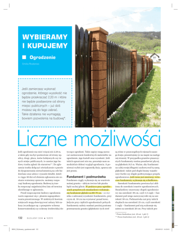 WYBIERAMY I KUPUJEMY Ogrodzenie Emilia Rosïaniec fot. Joniec JeĂli zamierzasz wykonaÊ ogrodzenie, którego wysokoĂÊ nie bÚdzie przekraczaÊ 2,20 m i które nie bÚdzie postawione od strony miejsc publicznych – juĝ dziĂ moĝesz siÚ do tego zabraÊ. Takie dziaïania nie wymagajÈ bowiem pozwolenia na budowÚ*. Liczne moĝliwoĂci JeĂli ogrodzenie ma mieÊ wiÚcej niĝ 2,20 m, a takĝe gdy ma byÊ postawione od strony np. ulicy, drogi, placu, torów kolejowych czy innych miejsc publicznych, to zamiar jego budowy trzeba zgïosiÊ do starostwa**. Do zgïoszenia trzeba doïÈczyÊ oĂwiadczenie o prawie do dysponowania nieruchomoĂciÈ na cele budowlane oraz szkice i rysunki dziaïki. Jeĝeli w ciÈgu 30 dni od zïoĝenia zgïoszenia nie zostanie wniesiony sprzeciw, moĝemy rozpoczÈÊ budowÚ ogrodzenia. BudowÚ tÚ trzeba rozpoczÈÊ najpóěniej dwa lata od terminu okreĂlonego w zgïoszeniu. Przed rozpoczÚciem budowy ogrodzenia warto zapoznaÊ siÚ z planem zagospodarowania przestrzennego. W niektórych bowiem miejscach mogÈ obowiÈzywaÊ zakazy lub nakazy (wynikajÈce np. z przepisów ochrony konserwatorskiej czy ochrony Ărodowiska) do- 132 BUDUJEMY DOM BD10_Wybieramy_ogrodzenie.indd 132 10/2010 tyczÈce ogrodzeñ. Takie zapisy mogÈ narzucaÊ zastosowanie konkretnych materiaïów na ogrodzenie, jego ksztaït oraz wysokoĂÊ. JeĂli takich ograniczeñ nie ma, pozostaje nam samodzielnie dobraÊ wyglÈd ogrodzenia. A poniewaĝ wybór jest naprawdÚ duĝy, sprawa nie jest prosta. Fundament i podmurówka Fundamen ciÈgïy wykonuje siÚ na warstwie noĂnej gruntu – ubitym ĝwirze lub piasku bÈdě suchej glinie. W praktyce przy ogrodzeniach przÚsïowych standardowo wykonuje siÚ fundament gïÚboki na 60–70 cm – co wynika z zalecanej wysokoĂci fundamentu, przy czym ok. 10 cm ma wystawaÊ ponad teren. Jedynie przy ciÚĝkich ogrodzeniach peïnych fundamenty naleĝy osadzaÊ poniĝej poziomu przemarzania gruntu (gïÚbokoĂci tych stref sÈ róĝne w poszczególnych rejonach naszego kraju; prezentujemy je na mapie na nastÚpnej stronie). W przypadku gruntów piaszczystych fundamenty moĝna posadawiaÊ pïycej, na gïÚbokoĂci 0,5 m. Waĝne, aby fundament na caïej swojej dïugoĂci zachowywaï tÚ samÈ gïÚbokoĂÊ: takĝe pod sïupki bramy wjazdowej i furtki czy sïupki podtrzymujÈce przÚsïa ogrodzeniowe. JeĂli teren jest nierówny, wówczas fundamenty wykonuje siÚ schodkowo. SzerokoĂÊ fundamentu powinna byÊ zbliĝona do szerokoĂci murów ogrodzeniowych. Standardowy murowany sïupek ogrodzeniowy ma szerokoĂÊ 38 cm, czyli 1,5 cegïy – fundament pod niego zazwyczaj robi siÚ na szerokoĂÊ 30 cm. Podmurówka zaĂ przy takich sïupkach ma szerokoĂÊ 25 cm, czyli szerokoĂÊ 1 cegïy – fundament pod niÈ wykonuje siÚ zatem na szerokoĂÊ 20 cm. Przy takich pro- * Prawo budowlane (art. 29 ust. 1 pkt 7) ** Prawo budowlane (art. 30 ust. 1 pkt 3) 2010-09-23 16:24:01 OGRODZENIA BETONOWE 120 zï/m 150 zï/m 2,18 zï/element 14,88 zï/bloczek JONIEC JONIEC Sïupki i podmurówki systemu JONIEC z ïupanych pïytek ogrodzeniowych imitujÈcych piaskowiec wymiary elementów sïupka: wys. 10 cm, szer. 28 cm, dï. 28 cm; wymiary elementów podmurówki: wys. 10 cm, szer. 3 cm, dï. 24 cm www.joniec.pl Sïupki i podmurówki systemu GORC z zalewowych bloczków betonowych wymiary bloczków: wys. 16 cm, szer. 22 cm, dï. 38 cm www.joniec.pl GïÚbokoĂci przemarzania gruntu w róĝnych rejonach Polski porcjach elementy murowane sÈ szersze od fundamentów o ok. 3 cm z kaĝdej strony, co tworzy kapinos chroniÈcy fundament przed spïywajÈcÈ wodÈ. Gdy mur jest kamienny, szerokoĂÊ fundamentu powinna stanowiÊ 1/5 wysokoĂci muru i mieÊ nie mniej niĝ 30 cm. Fundamenty sïupów bram powinny byÊ szersze niĝ w pozostaïej czÚĂci, aby uniosïy ruchome ciÚĝkie skrzydïa bram. Zazwyczaj wystarcza, aby miaïy 60–100 cm. Wykop pod ïawy fundamentowe zabezpiecza siÚ foliÈ i bezpoĂrednio na niej wylewa fundament. Najlepiej uĝyÊ do tego niezbrojonego betonu klasy C12/15 (dawniej B15). Zbrojenie trzeba wykonaÊ jedynie wtedy, gdy ogrodzenie ma ciÚĝkÈ konstrukcjÚ (jest z cegïy lub kamienia). Uĝywa siÚ do tego prÚtów o Ărednicy 12 mm, uïoĝonych poprzecznie i poïÈczonych co 25 cm strzemionami z prÚtów Ărednicy 6 mm. Warto w takiej sytuacji uĝyÊ takĝe mocniejszego betonu. Na fundamencie powinno siÚ wykonaÊ izolacjÚ poziomÈ, która zapobiegnie kapilarnemu podciÈganiu wody z gruntu. Do tego celu uĝywa siÚ papy, specjalnej folii lub masy bitumicznej. Izolacja wyeliminuje ryzyko powstawania wykwitów na murze i sïupkach. Poza fundamentem wykonuje siÚ takĝe podmurówkÚ (czÚĂÊ nad fundamentem ponad gruntem). DziÚki niej dolna krawÚdě wypeïnienia ogrodzenia (przÚseï czy siatki) jest odseparowana od powierzchni terenu. Zabezpiecza to przed przyĂpieszonÈ korozjÈ i wrastaniem trawy w ogrodzenie. OGRODZENIA METALOWE 211 zï/panel IGEL BETAFENCE Ogrodzenie panelowe ze stali ocynkowanej malowanej proszkowo wymiary: panel – wys. 150 cm, szer. 250 cm, sïupek – 6 × 4 cm, podmurówka – wys. 25 cm www.igel.com.pl *cena za 1 m kompleksowego ogrodzenia Panele ogrodzeniowe Decofor ze stali ocynkowanej malowane proszkowo wymiary panela: wys. 86,6 cm, dï. 201,5 cm www.betafence.pl 3907 zï/ok. 20 m* 7715 zï/ok. 20 m* WI¥NIOWSKI WI¥NIOWSKI fot. Colorex Ogrodzenie WI¥NIOWSKI – system Lux (wzór AW 10.53) z wypeïnieniem z prÚtów stalowych ocynkowanych wymiary przÚsïa: wys. 90 cm, szer. 250 cm www.wisniowski.pl *w tym: przÚsïo – 6560 zï (8 × 820 zï), sïupek i akcesoria montaĝowe – 755 zï (8 × 94,40 zï), montaĝ – ok. 400 zï BUDUJEMY DOM 10/2010 133 – ceny brutto – Ogrodzenie WI¥NIOWSKI – system Classic (wzór AW 10.05) z wypeïnieniem z ksztaïtowników stalowych zamkniÚtych wymiary przÚsïa: wys. 90 cm, szer. 250 cm www.wisniowski.pl *w tym: przÚsïo – 2752 zï (8 × 344 zï), sïupek i akcesoria montaĝowe 