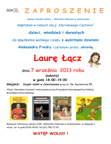 Z A P R O S Z E N I E Gminny Ośrodek Kultury - Biblioteka Publiczna w Celestynowie zaprasza w ramach akcji „Narodowego Czytania” dzieci, młodzieŜ i dorosłych do spędzenia wolnego czasu z wybitnymi dziełami Aleksandra Fredry czytanymi przez aktorkę Laurę Łącz dnia 7 września 2013 roku (sobota) w godz.18.00-19.00 miejsce: Zespół Szkół w Celestynowie przy ul. Św. Kazimierza 55. Akcja „Narodowe Czytanie” zainicjowana przez Prezydenta Rzeczpospolitej Polskiej Bronisława Komorowskiego BliŜszych informacji udziela: GOK -Biblioteka Publiczna w Celestynowie, ul. Regucka 1 od pn. –pt. w godz.10.00-18.00, tel.(22) 789-71-02. WSTĘP WOLNY !