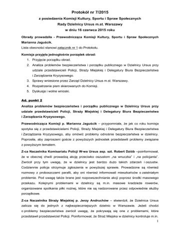 Protokół nr 7/2015 z posiedzenia Komisji Kultury, Sportu i Spraw Społecznych Rady Dzielnicy Ursus m.st. Warszawy w dniu 16 czerwca 2015 roku Obrady prowadziła - Przewodnicząca Komisji Kultury, Sportu i Spraw Społecznych Marianna Jaguścik. Lista obecności stanowi załącznik nr 1 do Protokołu. Komisja przyjęła jednogłośnie porządek obrad: 1. Przyjęcie porządku obrad. 2. Analiza problemów bezpieczeństwa i porządku publicznego w Dzielnicy Ursus przy udziale przedstawicieli Policji, Straży Miejskiej i Delegatury Biura Bezpieczeństwa i Zarządzania Kryzysowego. 3. Sprawy wniesione przez Zarząd Dzielnicy Ursus m.st. Warszawy. 4. Rozpatrzenie pism skierowanych do Komisji. 5. Dyskusja i wolne wnioski. Ad. punkt 2 Analiza problemów bezpieczeństwa i porządku publicznego w Dzielnicy Ursus przy udziale przedstawicieli Policji, Straży Miejskiej i Delegatury Biura Bezpieczeństwa i Zarządzania Kryzysowego. Przewodnicząca Komisji p. Marianna Jaguścik – przypomniała, że jak co roku komisja spotyka się z przedstawicielami Policji, Straży Miejskiej i Delegatury Biura Bezpieczeństwa i Zarządzania Kryzysowego, aby omówić problemy odnośnie bezpieczeństwa w dzielnicy. Poprosiła, aby zaproszeni goście z powyższych jednostek przedstawili problemy związane z powyższym tematem. Z-ca Naczelnika Komisariatu Policji W-wa Ursus asp. szt. Robert Dziób –poinformował, że w obecnej chwili prowadzą akcję przeciwko oszustom „na wnuczka” i „na policjanta”. Zwrócił przy tym uwagę, że w dzielnicy jest bardzo dużo takich zdarzeń i oszustw. Codziennie policja otrzymuje zgłoszenia w powyższej sprawie. Prowadzone są również rozmowy z proboszczami parafii, aby oni również informowali mieszkańców o zaistniałym problemie. Pod uwagę także brane jest rozpowszechnianie akcji poprzez środki masowego przekazu. Kolejnymi problemami w dzielnicy są m.in. masowe kradzieże rowerów, organizowane spotkania piłki nożnej, które nie są nadzorowane przez odpowiednie służby porządkowe. Z-ca Naczelnika Straży Miejskiej p. Jerzy Andruchów – stwierdził, że Dzielnica Ursus zalicza się do jednych z najbezpieczniejszych dzielnic w Warszawie. Jeżeli chodzi o problemy bezpieczeństwa zwrócił uwagę, że pokrywają się one z problemami, które przedstawił przedstawiciel Policji. Poinformował, że Straż Miejska w dzielnicy kontroluje m.in. 1 - rowerzystów pod względem trzeźwości, przestrzegania przepisów jak i również sprawdzają, czy rowery nie są kradzione, - spożywanie alkoholu w miejscach do tego nie przeznaczonych oraz wszystkie pochodne z tego tytułu, które powstają. Odniósł się także do rozmów prowadzonych dotyczących projektowanych zmian w ustawie o wychowaniu w trzeźwości i przeciwdziałaniu alkoholizmowi. Zwrócił uwagę, na poniższe aspekty: - nie zabrania się spożywania alkoholu w budynku mieszkalnym (wobec powyższego każda osoba paląca, pijąca alkohol na klatce schodowej nie może zostać ukarana), - brak zdefiniowania słowa „ulica” (każda osoba może to słowo zdefiniować inaczej), - problem z zezwoleniami na sprzedaż alkoholu, - brak sprecyzowania w zapisie dotyczącym zakazu spożywania alkoholu w pobliżu sklepu czy przystanku autobusowego. Przytaczając powyższe aspekty zaznaczył, że jest wiele niedomówień, które tak naprawdę utrudniają pracę jednostkom porządkowym. Następnie poruszył sprawę konglomeratu ruchu drogowego gdzie najgorzej oceniana jest jazda pod wpływem alkoholu. Natomiast w okresie letnim Straż Miejska włącza się do akcji „Bezpieczne lato w mieście”, współpracują także z placówkami oświatowymi oraz kontrolują place zabaw. Na zakończenie stwierdził, że bezpieczeństwo dzieci i młodzieży jest najważniejszym aspektem pracy Straży Miejskiej. Naczelnik Wydziału ds. Nieletnich i Patologii kom. Sławomir Gajda – poinformował, że tendencja przestępstw popełnianych przez nieletnich w okresie poszczególnych lat jest na podobnym stopniu. Ponadto coraz więcej pojawia się zgłoszeń o przestępstwach internetowych, ale za to spadła brutalizacja młodzieży. Bardzo dużym problemem są także środki odurzające, które nie są zdefiniowane w ustawie. W skutek zażywania tych substancji kilka osób było już hospitalizowanych. Odniósł się również do bardzo dobrej współpracy z placówkami oświatowymi tj. gimnazja i szkoły podstawowe. Wielokrotnie zgłaszane są także problemy wychowawcze m.in. wagary, palenie papierosów, picie alkoholu. Zdarza się także, że sami rodzice zgłaszają potrzebę pomocy wychowawczej. Delegatura Biura Bezpieczeństwa i Zarządzania Kryzysowego p. Aleksander Zblewski – poinformował, że kilka razy w roku przedstawiciele lokalnych społeczności, właściwi terenowo dzielnicowy i inspektor do spraw terenu Straży Miejskiej oraz pracownik Delegatury BBiZK spotykają się podczas programu „Bezpieczne osiedle”, którego przedmiotem działań jest zbieranie informacji o niedostatkach w infrastrukturze miejskiej mających wpływ na poczucie bezpieczeństwa, określanie miejsc niebezpiecznych (miejsca gromadzenia się agresywnej młodzieży, spożywania alkoholu w miejscach publicznych, narkomanii, itp.) Zwrócił również uwagę, że dzielnica dzieli się na sektory, w których jest spokojnie a w innych 2 miejscach odczucie bezpieczeństwa jest małe. Podał przykład, że np. na Skoroszach występuje ok. 50% popełnianych przestępstw. Natomiast w Czechowicach tylko 12%. Ważnym także problemem dla dzielnicy są grafficiarze których jest ciężko złapać na popełnionym uczynku. Odniósł się również do bardzo dobrej współpracy z młodzieżą. Trwają także prace nad aktywizacją nauczycieli. Szkoły zachęcane są także do korzystania z „miasteczka ruchu drogowego”, który uczy dzieci i młodzież z przepisowego poruszania się po dzielnicy. Radny p. Stanisław Jasiński – stwierdził, że w dzie