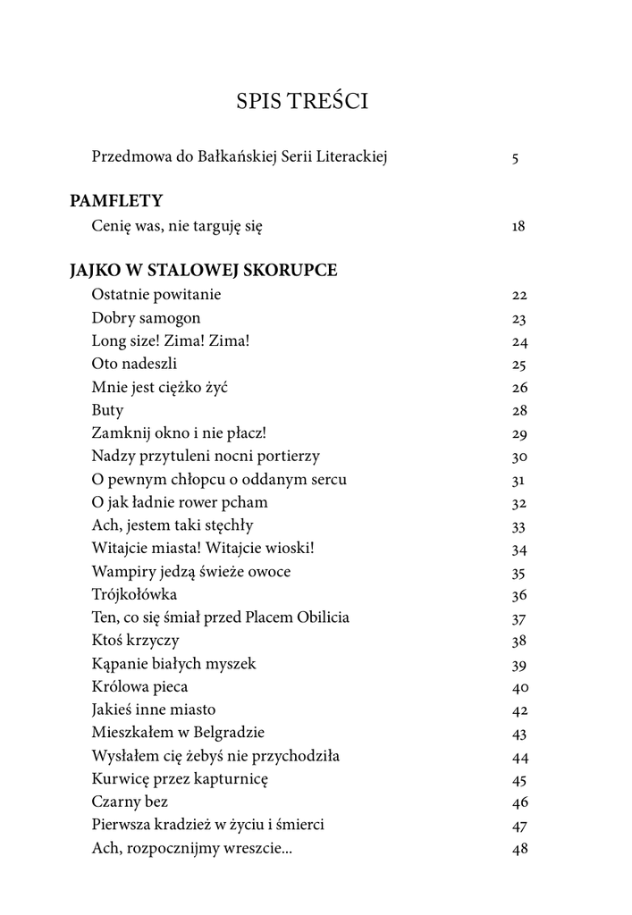 SPIS TREŚCI Przedmowa do Bałkańskiej Serii Literackiej 5 PAMFLETY Cenię was, nie targuję się 18 JAJKO W STALOWEJ SKORUPCE Ostatnie powitanie Dobry samogon Long size! Zima! Zima! Oto nadeszli Mnie jest ciężko żyć Buty Zamknij okno i nie płacz! Nadzy przytuleni nocni portierzy O pewnym chłopcu o oddanym sercu O jak ładnie rower pcham Ach, jestem taki stęchły Witajcie miasta! Witajcie wioski! Wampiry jedzą świeże owoce Trójkołówka Ten, co się śmiał przed Placem Obilicia Ktoś krzyczy Kąpanie białych myszek Królowa pieca Jakieś inne miasto Mieszkałem w Belgradzie Wysłałem cię żebyś nie przychodziła Kurwicę przez kapturnicę Czarny bez Pierwsza kradzież w życiu i śmierci Ach, rozpocznijmy wreszcie... 22 23 24 25 26 28 29 30 31 32 33 34 35 36 37 38 39 40 42 43 44 45 46 47 48 Jesteśmy produktywni! Poszedł Goethe na przechadzkhę Kiedy na człowieka spadnie ciężar jak ołów Piastunki śmierci Budzik wspomnień Olko-ol! Ten straszny olko-ol! Jajko w stalowej skorupce Zwróćmy się do biednego kredensu Niektóre kobiety przeszły Allada o martwym Przy okręgowej prokuraturze publicznej się zdarzyło Spanie na kanapie Pieśń rozstania Dusza duszy chlebek pokruszy Nieprzyjaciele Mufka! Uważajcie, pistolet jest w mufce! Cigarillos sonet Jak oskarżyli mnie o morderstwo Granie na czarnych klawiszach Kupię ci małego osiołka Pani z oparciem do rejestratora „HERMES” Przełącznik światła Na próżno mi niebo błękitnieje! Ucze-cze Moja stara spiżarnio, ty dla duszy darnio Wyprasowane szturmówki Kelnerzy mojej duszy Allan Poe Restauracyjna jesień Pękają płucne kombinezony Wyszło nowe pisklę Często uderzałem głową... Nie bądź ćwok, naucz się cmok! Mnie nikt nigdy nie kochał... Allady o martwym II 50 51 52 54 55 57 58 60 64 65 66 67 68 69 72 73 75 76 78 79 80 81 82 83 84 86 87 88 89 90 91 93 94 96 97 SEN I KRYTYKA Książka jest otwarta, człowiek jest zamknięty Biegnij strzelaj dalej Rozcięty kłębuszek, obwąchiwał zmarznięty Tamto czy, ciebie z Sierść pomidor mysz, góra ogień mgła Godzinami łyżeczka wczoraj, czasami łza jutro Głód się spóźnia, serce śpiewa Zmrok jesień burza, wiatr pustynia sen Chropawe mleko lepkie, zdjęte wyprostowane głębokie Praca kwitnie, góry są dalekie Zielono walnąć, pisemnie podupaść Surowe gotowane, strachliwe, odważne Błyskawicę szeleści bolał, niespokojna stole ziewała Spódnica wełna lód, wtyczka ołów góra Kupiony nie jelito, srogi nie mocz Machać sikać płakać Gorący dziki kudłaty, wilgotny ściśnięty pusty O łza i, i mąka o Zielono właściwy liże... Łyżka jest pełna, szafa jest pusta Łóżko upieczony, garnek zawinięty Mów szybko, podróżuj uważnie Gwóźdź mózg woda, dłuto czaszka serwatka Tchórz odważny, piękny brzydki Śnieg wieje, miłość jest wieczna Kiedy dam nie ma, komory deskę wyciska Jadowity dreszcz, brutalny atak Skóra dotyk, zima śnieg Odszedł zniknął zgubiony Paznokcie rosną, włosy wypadają Tutaj tam gdzieś daleko Deska biegunka, uderzenie sen Od ile od, od wbity od 100 102 103 104 105 106 107 108 109 110 111 112 113 114 115 116 117 118 119 120 121 122 123 124 125 126 127 128 129 130 131 132 133 Paznokieć jeśli paznokieć, rzemiosło jeśli rzemiosło Szklankę naparstek, kosza worek Weszły wodę uścisk Pije chłepcze cacka trzęsie Mikser sad, grzejnik sen Spluń pędź ciągnij, ssij szarp gnieć Chyli się stara ruszali Ścieżka cegła zapałka, jeleń płaszcz język Morderca samotny, na kwaśne jabłko stłuc Człowiek zdrowie serce 134 135 136 137 138 139 140 141 142 143 GNOJEK POŚRÓD NOCY Piję grzane wino W pociągu Triest–Wenecja Wyszedłem na lód Liczę zawsze, kiedy się błyska U literata Bory Ćosicia Na ciężkich robotach w Macedonii Zsikałem się ze strachu Na dworcu autobusowymw Belgradzie Fotografowałem się Poeta Branko Andrić Leżę w pokoju Pewnego lata, o północy W autobusie do Belgradu Poszedłem do uzdrowiska Banja Rusanda Cichcem wyszczerzam zęby Ostrożnie sam ją podnosiłem Kopałem siedem dni Poszliśmy nocą Zaprowadziła mnie matka Tancerz wszechstronny Przed hotelem Jugosławia Poszedłem trenować boks 146 147 148 149 150 151 152 153 154 155 156 157 158 159 160 161 162 163 164 165 167 168 Na wyspie Veli Lošinj Kto może mocniej pierdnąć O poranku podczas wichury W pewnym czasopiśmie Patrzymy sobie w oczy Na Ochrydzie, z Josipem Severem Kucnąłem obok jakiegoś psa W trawie, na dnie rowu Gdy siąpił jesienny deszcz Jako dziecko bałem się Pospieszyłem się i skoczyłem Wieża czaszek W ubikacji Wydziału Filozoficznego Kiedy myłem nogi W drzwiach łazienki W pracowni poety Vaska Popy Bawiliśmy się w doktora Wstałem i zapytałem Gnojek pośród nocy Pięcioramienna gwiazda 169 170 171 172 173 174 175 176 177 178 179 180 181 182 183 184 185 186 187 188 REFORM-GROTESK Wszyscy byliśmy młodzi, wszyscy pamiętamy O zaimki i przysłówki, o wykrzyknienia Gubimy się w tekstach Otwieram zamkniętą składnię Spojrzenia się strzegą Sztuka śpi Mówię szeptem Gdzie jesteśmy, o nasza jaśniejąca gwiazdo Bijcie dzieci, ubijcie swoją śmierć Wy, którzy jesteście młodzi Wszystkie drzwi są zamknięte Usta mi się zacisnęły 190 191 192 193 194 195 196 197 198 199 200 201 Poranne jajko Samotny i piękny, obsypany piegami pryszczami To jest czas ziemi Dzieci mają duszę I my kiedyś pospacerujemy Spójrz, i zapamiętaj Poeci wyklęci, termin Verlaine’a Unikajcie wzroku swoich ojców Upojne są obiecanki cacanki Przytul mnie Lodowaty wiatr zamyka nam drogę Oparty o poliwinyl Ruja i porubstwo to jest mój świat Kartka papieru: bliskość i dal Poranek Dawno temu pewien generał Śmierć jest wieczną życiową potrzebą O gwiazdy, usłane w wieczności Niekiedy wyjeżdżam na wakacje Czy jestem dzieckiem rewolucji W kosmosie, na pustyni Chce mi się śpiewać, do śmierci Odsunąłem płytę, wszystkich czasów Ucałowałem różę i kawałek białeg