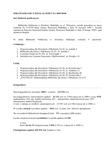 SPRAWOZDANIE Z DZIAŁALNOŚCI ZA 2009 ROK Sieć bibliotek publicznych Biblioteka Publiczna w Dzielnicy Białołęka m. st. Warszawy została powołana na mocy Uchwały Nr V/47/99 Rady Gminy Warszawa Białołęka z dnia 29 stycznia 1999 r. Została wpisana do Rejestru Instytucji Kultury Gminy Warszawa Białołęka w dniu 10 lutego 1999 r. pod numerem drugim. W skład Biblioteki Publicznej w Dzielnicy Białołęka wchodzi 9 placówek: 4 Oddziały: 1. 2. 3. 4. Wypożyczalnia dla Dorosłych i Młodzieży Nr 42, ul. Antalla 5 Biblioteka dla Dzieci i Młodzieży Nr IV, ul. Antalla 5 Czytelnia Naukowa Nr XX, ul. Van Gogha 1 Interaktywne Centrum Nauczania „Multicentrum” ul. Porajów 14 5 Filii: 1. 2. 3. 4. 5. Wypożyczalnia dla Dorosłych i Młodzieży Nr 46, ul. Kowalczyka 3 Wypożyczalnia dla Dorosłych i Młodzieży Nr 58, ul. Ambaras 12 Wypożyczalnia dla Dorosłych i Młodzieży Nr 69, ul. Raciborska 20 Wypożyczalnia dla Dorosłych i Młodzieży Nr 88, Pl. Światowida 3 „NAUTILUS” Multimedialna Biblioteka dla Dzieci i Młodzieży Nr LVI Księgozbiory Stan księgozbiorów na koniec 2009 r. wyniósł – 132 954 wol. Do księgozbiorów wprowadzono ogółem – 24 123 wol. (o 5 844 więcej niż w 2008 r.) oraz 1970 multimediów (252 egz. książki mówionej, 423 – dokumentów elektronicznych oraz 1295 dokumentów audiowizualnych) w tym: z zakupu ze środków samorządowych – 23 943 wol. (o 6 864 więcej niż w 2008 r.) W wyniku selekcji wycofano ogółem – 3924 wol. i 6 jedn. inw. zbiorów specjalnych. We wszystkich bibliotekach dostępnych było - 271 czasopism (132 tytuły). Liczba zarejestrowanych czytelników wyniosła ogółem 14 185 w tym: dzieci do lat 15 zarejestrowano 3 694 (o 833 os. więcej niż w 2008 r.). Udostępniono ogółem 203 876 wol. książek w tym: - w wypożyczalniach dla dorosłych 141 529 wol. - w bibliotekach dla dzieci 51 051 wol. - w Czytelni Naukowej 11 296 wol. w tym na miejscu skorzystano ogółem z 15 056 książek. Ogółem w bibliotekach udzielono 8 913 informacji wykorzystując przede wszystkim katalogi komputerowe dostępne w ośmiu placówkach. Z Internetu skorzystało 7 014 użytkowników. Struktura księgozbiorów bibliotek w Dzielnicy Białołęka w stosunku do lat poprzednich przedstawia się następująco: 2008 r. Ilość wol. 2009 r. Udział % Ilość wol. Udział % Literatura piękna dla dzieci 22 305 19,8 27 854 21 Literatura piękna dla dorosłych 50 501 44,8 57 022 42,9 Literatura popularnonaukowa 39 949 35,4 48 078 36,1 Razem 112 755 100 132 954 100 Podstawowe wskaźniki: ROK 2008 ROK 2009 15,1% 16% Zakup nowości na 100 mieszkańców 23,3 wol. 27 wol. Wypożyczenia na 100 mieszkańców 226,8 wol. 230,3 146 wol. 150 wol. Zasięg czytelnictwa Zasobność księgozbioru na 100 mieszkańców Uwaga: dane o liczbie mieszkańców w 2009 r. pochodzą z danych GUS (stan na 30.09.2009) – 88 542. W 2009 roku wzrósł zasięg czytelnictwa. Wiąże się to zapewne ze sporym wzrostem liczby zakupionych nowości wydawniczych. W porównaniu z 2008 r. zwiększył się również wskaźnik wypożyczeń na 100 mieszkańców, a także liczna woluminów na 100 mieszkańców. Zakup W 2009 r. zakup książek był większy niż w roku ubiegłym w wyniku zwiększenia środków na ten cel, możliwości uzgadniania cen z hurtownikami, większe rabaty, a także zakupem nowości wydawniczych ze środków własnych biblioteki tj. opłat za przetrzymywanie książek pobieranych od czytelników w kwocie 50 tys. zł. Do wszystkich bibliotek można było dzięki temu zakupić więcej pozycji: nowości literatury pięknej dla dorosłych, literatury pięknej dla dzieci oraz literatury popularnonaukowej, a także sukcesywnie „odnawiać” księgozbiór zastępując stare, zniszczone egzemplarze tytułów nowymi. Można było także zwiększyć liczbę czasopism z 95 w 2008 r. do 132 tytułów w roku 2009. Selekcje W wyniku selekcji wycofano 3 924 wol. Przyczyną wycofania książek było: niezwrócenie przez czytelników, zniszczenie, zaczytanie, dezaktualizacja oraz nieprzydatność w danej bibliotece. Czytelnicy W 2009 r. zarejestrowało się w naszych placówkach 14 185 czytelników, którzy odwiedzili nas 155 608 razy. Struktura czytelników wg wieku. Przedziały wiekowe [lata] do 15 16- 19 20- 24 25- 44 45- 60 ponad 60 Ogółem Liczba czytelników 3694 1489 1595 5237 1723 447 14 185 Udział % 26 10,5 11,2 37 12,1 3,2 100 Struktura czytelników wg zajęcia. Kategoria Uczniowie Studenci Prac. umysłowi Robotnicy Rolnicy Inni Niezatrudnieni Ogółem Liczba czytelników 5570 1389 5097 689 9 538 893 14185 Udział % 39,2 9,7 36 4,9 0,1 3,8 6,3 100 Wśród czytelników zdecydowanie dominują uczniowie: szkół podstawowych, gimnazjów, szkół średnich oraz pracownicy umysłowi. Dużą grupę stanowią czytelnicy w przedziale wiekowym 25-44 lata. Udostępnianie zbiorów W 2009 roku odnotowanych zostało 188 820 wypożyczeń książek. Liczba wypożyczeń wzrosła mimo, iż 3 placówki były nieczynne przez 1 miesiąc każda z powodu remontu. Nastąpił niewielki spadek wypożyczeń lit. pięknej dla dorosłych na rzecz lit. pięknej dla dzieci. Struktura wypożyczeń wg grup książek. Rok 2008 Rok 2009 Liczba wypożyczeń Udział % Liczba wypożyczeń Udział % Literatura piękna dla dzieci 37 457 23,1 49375 26,1 Literatura piękna dla dorosłych 93 709 57,9 104063 55,1 Literatura popularnonaukowa 30 921 19,0 35382 18,8 Ogółem 162 087 100 188 820 100 Upowszechnianie czytelnictwa Formy popularyzacji książki W ramach promocji książki i popularyzacji czytelnictwa zorganizowano w 2009 r. we wszystkich placówkach bibliotecznych Białołęki: · · · · · · · · Tematyczne lekcje biblioteczne dla uczniów szkół podstawowych. Wzięło w nich udział 1109 uczniów. 8 spotkań autorskich, w których uczestniczyło 276 osób 17 spektakli teatralnych, w których uczestniczyło 527 dzieci Zajęcia muzyczne dla 150 dzieci 403 różne spotkania i imprezy, w tym wars