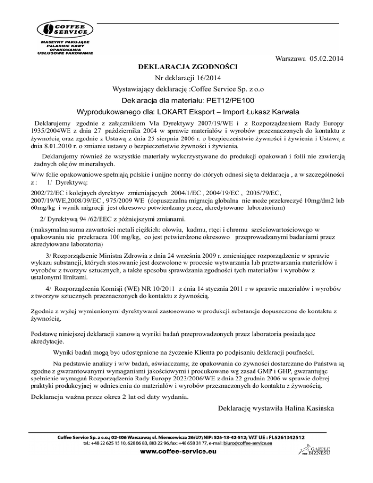 Warszawa 05.02.2014 DEKLARACJA ZGODNOŚCI Nr deklaracji 16/2014 Wystawiający deklarację :Coffee Service Sp. z o.o Deklaracja dla materiału: PET12/PE100 Wyprodukowanego dla: LOKART Eksport – Import Łukasz Karwala Deklarujemy zgodnie z załącznikiem VIa Dyrektywy 2007/19/WE i z Rozporządzeniem Rady Europy 1935/2004WE z dnia 27 października 2004 w sprawie materiałów i wyrobów przeznaczonych do kontaktu z żywnością oraz zgodnie z Ustawą z dnia 25 sierpnia 2006 r. o bezpieczeństwie żywności i żywienia i Ustawą z dnia 8.01.2010 r. o zmianie ustawy o bezpieczeństwie żywności i żywienia. Deklarujemy również że wszystkie materiały wykorzystywane do produkcji opakowań i folii nie zawierają żadnych olejów mineralnych. W/w folie opakowaniowe spełniają polskie i unijne normy do których odnosi się ta deklaracja , a w szczególności z : 1/ Dyrektywą: 2002/72/EC i kolejnych dyrektyw zmieniających 2004/1/EC , 2004/19/EC , 2005/79/EC, 2007/19/WE,2008/39/EC , 975/2009 WE (dopuszczalna migracja globalna nie może przekroczyć 10mg/dm2 lub 60mg/kg i wynik migracji jest okresowo potwierdzany przez, akredytowane laboratorium) 2/ Dyrektywą 94 /62/EEC z późniejszymi zmianami. (maksymalna suma zawartości metali ciężkich: ołowiu, kadmu, rtęci i chromu sześciowartościowego w opakowaniu nie przekracza 100 mg/kg, co jest potwierdzone okresowo przeprowadzanymi badaniami przez akredytowane laboratoria) 3/ Rozporządzenie Ministra Zdrowia z dnia 24 września 2009 r. zmieniające rozporządzenie w sprawie wykazu substancji, których stosowanie jest dozwolone w procesie wytwarzania lub przetwarzania materiałów i wyrobów z tworzyw sztucznych, a także sposobu sprawdzania zgodności tych materiałów i wyrobów z ustalonymi limitami. 4/ Rozporządzenia Komisji (WE) NR 10/2011 z dnia 14 stycznia 2011 r w sprawie materiałów i wyrobów z tworzyw sztucznych przeznaczonych do kontaktu z żywnością. Zgodnie z wyżej wymienionymi dyrektywami zastosowano w produkcji substancje dopuszczone do kontaktu z żywnością. Podstawę niniejszej deklaracji stanowią wyniki badań przeprowadzonych przez laboratoria posiadające akredytacje. Wyniki badań mogą być udostępnione na życzenie Klienta po podpisaniu deklaracji poufności. Na podstawie analizy i w/w badań, oświadczamy, że opakowania do żywności dostarczane do Państwa są zgodne z gwarantowanymi wymaganiami jakościowymi i produkowane wg zasad GMP i GHP, gwarantując spełnienie wymagań Rozporządzenia Rady Europy 2023/2006/WE z dnia 22 grudnia 2006 w sprawie dobrej praktyki produkcyjnej w odniesieniu do materiałów i wyrobów przeznaczonych do kontaktu z żywnością. Deklaracja ważna przez okres 2 lat od daty wydania. Deklarację wystawiła Halina Kasińska