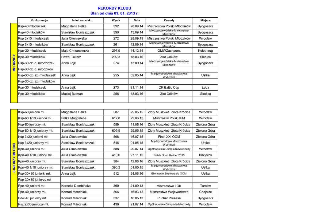 REKORDY KLUBU Stan od dnia 01. 01. 2013 r.