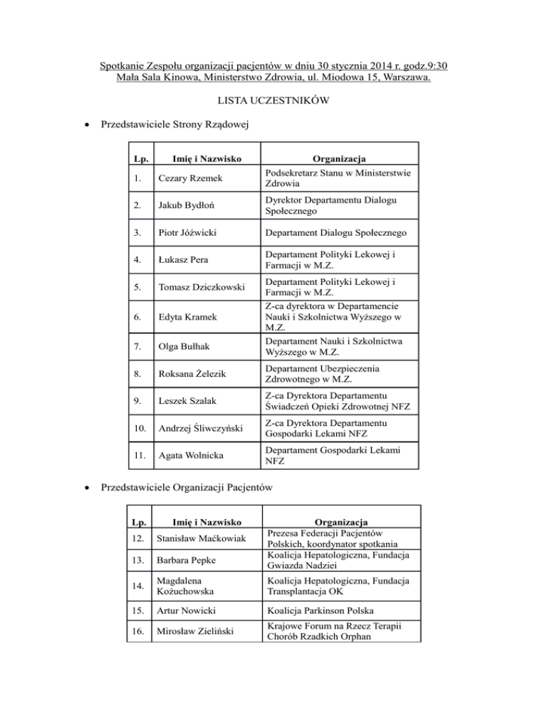 Spotkanie Zespołu organizacji pacjentów w dniu 30 stycznia 2014 r. godz.9:30 Mała Sala Kinowa, Ministerstwo Zdrowia, ul. Miodowa 15, Warszawa. LISTA UCZESTNIKÓW Przedstawiciele Strony Rządowej Lp. Imię i Nazwisko Organizacja Podsekretarz Stanu w Ministerstwie Zdrowia 1. Cezary Rzemek 2. Jakub Bydłoń Dyrektor Departamentu Dialogu Społecznego 3. Piotr Jóźwicki Departament Dialogu Społecznego 4. Łukasz Pera Departament Polityki Lekowej i Farmacji w M.Z. 5. Tomasz Dziczkowski 6. Edyta Kramek 7. Olga Bułhak 8. Roksana Żelezik Departament Ubezpieczenia Zdrowotnego w M.Z. 9. Leszek Szalak Z-ca Dyrektora Departamentu Świadczeń Opieki Zdrowotnej NFZ 10. Andrzej Śliwczyński Z-ca Dyrektora Departamentu Gospodarki Lekami NFZ 11. Agata Wolnicka Departament Gospodarki Lekami NFZ Departament Polityki Lekowej i Farmacji w M.Z. Z-ca dyrektora w Departamencie Nauki i Szkolnictwa Wyższego w M.Z. Departament Nauki i Szkolnictwa Wyższego w M.Z. Przedstawiciele Organizacji Pacjentów Lp. Imię i Nazwisko Organizacja Prezesa Federacji Pacjentów Polskich, koordynator spotkania Koalicja Hepatologiczna, Fundacja Gwiazda Nadziei 12. Stanisław Maćkowiak 13. Barbara Pepke 14. Magdalena Kożuchowska Koalicja Hepatologiczna, Fundacja Transplantacja OK 15. Artur Nowicki Koalicja Parkinson Polska 16. Mirosław Zieliński Krajowe Forum na Rzecz Terapii Chorób Rzadkich Orphan 17. Bartłomiej Kuchta 18. Monika Zientek 19. Roman Michalik 20. Krzysztof Kucharski 21. Jacek Gugulski 22. Anna Sarbak 23. Sebastian Szyper 24. Mariusz Baumgart Ekspert prawny organizacji pacjentów Ogólnopolska Federacja „REF”, Stowarzyszenie „3majmy się razem” Krajowe Forum ORPHAN, Stowarzyszenie Pacjentów z Choroba Fabry’ego Ogólnopolska Federacja „REF”, Stowarzyszenie chorych na ZZSK i osób ich wspierających Polska Koalicja Pacjentów Onkologicznych Stowarzyszenie Osób z NTM „UroConti” Zarząd Główny Stowarzyszenie Udarowcy – Liczy się Wsparcie Stowarzyszenie Udarowcy – Liczy się Wsparcie
