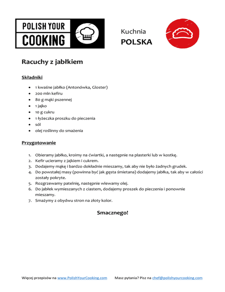 Kuchnia POLSKA Racuchy z jabłkiem Składniki 1 kwaśne jabłko (Antonówka, Gloster) 200 mln kefiru 80 g mąki pszennej 1 jajko 10 g cukru 1 łyżeczka proszku do pieczenia sól olej roślinny do smażenia Przygotowanie 1. 2. 3. 4. Obieramy jabłko, kroimy na ćwiartki, a następnie na plasterki lub w kostkę. Kefir ucieramy z jajkiem i cukrem. Dodajemy mąkę i bardzo dokładnie mieszamy, tak aby nie było żadnych grudek. Do powstałej masy (powinna być jak gęsta śmietana) dodajemy jabłka, tak aby w całości zostały pokryte. 5. Rozgrzewamy patelnię, następnie wlewamy olej. 6. Do jabłek wymieszanych z ciastem, dodajemy proszek do pieczenia i ponownie mieszamy. 7. Smażymy z obydwu stron na złoty kolor. Smacznego! Więcej przepisów na www.PolishYourCooking.com Masz pytania? Pisz na [email protected]