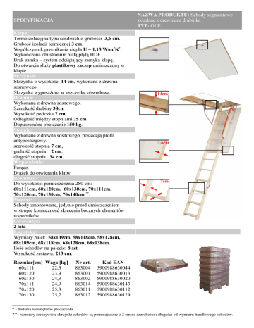 NAZWA PRODUKTU: Schody segmentowe składane z drewnianą drabinką TYP: OLE SPECYFIKACJA Klapa: Termoizolacyjna typu sandwich o grubości 3,6 cm. Grubość izolacji termicznej 3 cm. Współczynnik przenikania ciepła U = 1,13 W/m2K*. Wykończona obustronnie białą płytą HDF. Brak zamka – system odciążający zamyka klapę. Do otwarcia służy plastikowy zaczep umieszczony w klapie. Skrzynka: Skrzynka o wysokości 14 cm, wykonana z drewna sosnowego. Skrzynka wyposażona w uszczelkę obwodową. Drabina: Wykonana z drewna sosnowego. Szerokość drabiny 38cm Wysokość policzka 7 cm. Odległość między stopniami 25 cm. Dopuszczalne obciążenie 150 kg. Stopnie: Wykonane z drewna sosnowego, posiadają profil antypoślizgowy. szerokość stopnia 7 cm, grubość stopnia 2 cm, długość stopnia 34 cm. Wyposażenie: Poręcz. Drążek do otwierania klapy. Rozmiary: Do wysokości pomieszczenia 280 cm: 60x111cm, 60x120cm, 60x130cm, 70x111cm, 70x120cm, 70x130cm, 70x140cm **. Montaż: Schody zmontowane, jedynie przed umieszczeniem w stropie konieczność skręcenia bocznych elementów wsporników. Gwarancja: 2 lata Logistyka: Wymiary palet: 58x109cm, 58x118cm, 58x128cm, 68x109cm, 68x118cm, 68x128cm, 68x138cm. Ilość schodów na palecie: 8 szt. Wysokość zestawu: 213 cm. Rozmiar[cm] Waga [kg] 60x111 22,3 60x120 23,9 60x130 24,3 70x111 24,9 70x120 25,3 70x130 25,7 Nr art. 863004 863001 863002 863014 863011 863012 Kod EAN 5900988630044 5900988630013 5900988630020 5900988630143 5900988630112 5900988630129 * - badania wewnętrzne producenta **- rozmiary rzeczywiste skrzynki schodów są pomniejszone o 2 cm na szerokości i długości od wymiaru handlowego schodów. SPECYFIKACJA NAZWA PRODUKTU: Schody segmentowe składane z drewnianą drabinką TYP: OLE Instrukcja montażu: Etykieta produkcyjna: Instrukcja użytkowania (naklejka na klapie): Obwoluty: