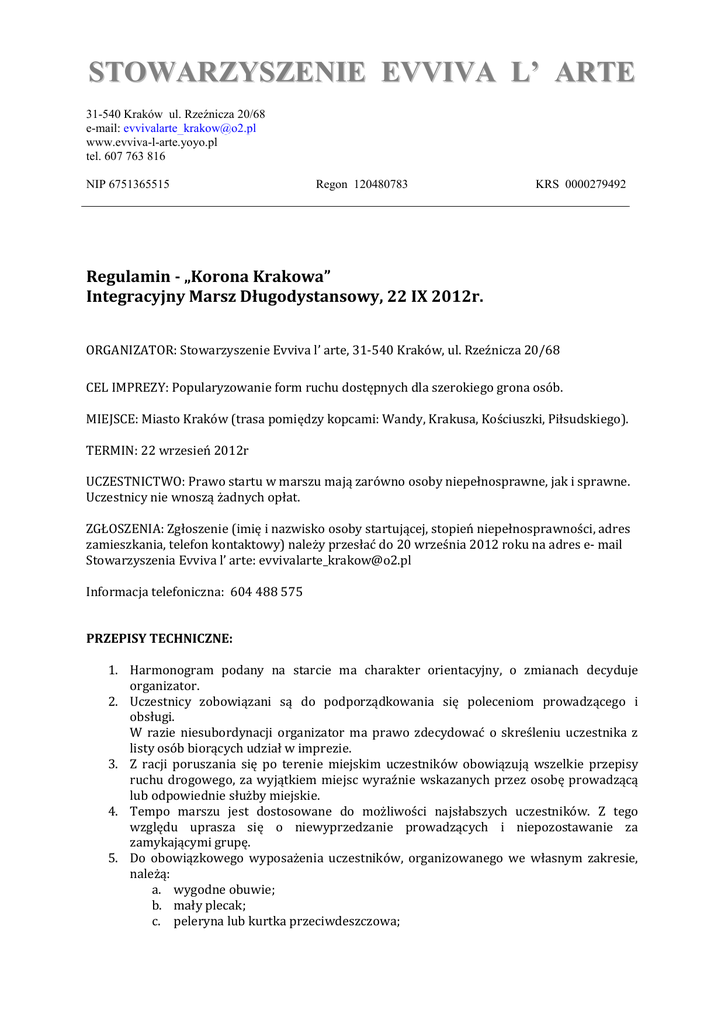 STOWARZYSZENIE EVVIVA L’ ARTE 31-540 Kraków ul. Rzeźnicza 20/68 e-mail: [email protected] www.evviva-l-arte.yoyo.pl tel. 607 763 816 NIP 6751365515 Regon 120480783 KRS 0000279492 Regulamin - „Korona Krakowa” Integracyjny Marsz Długodystansowy, 22 IX 2012r. ORGANIZATOR: Stowarzyszenie Evviva l’ arte, 31-540 Kraków, ul. Rzeźnicza 20/68 CEL IMPREZY: Popularyzowanie form ruchu dostępnych dla szerokiego grona osób. MIEJSCE: Miasto Kraków (trasa pomiędzy kopcami: Wandy, Krakusa, Kościuszki, Piłsudskiego). TERMIN: 22 wrzesień 2012r UCZESTNICTWO: Prawo startu w marszu mają zarówno osoby niepełnosprawne, jak i sprawne. Uczestnicy nie wnoszą żadnych opłat. ZGŁOSZENIA: Zgłoszenie (imię i nazwisko osoby startującej, stopień niepełnosprawności, adres zamieszkania, telefon kontaktowy) należy przesłać do 20 września 2012 roku na adres e- mail Stowarzyszenia Evviva l’ arte: [email protected] Informacja telefoniczna: 604 488 575 PRZEPISY TECHNICZNE: 1. Harmonogram podany na starcie ma charakter orientacyjny, o zmianach decyduje organizator. 2. Uczestnicy zobowiązani są do podporządkowania się poleceniom prowadzącego i obsługi. W razie niesubordynacji organizator ma prawo zdecydować o skreśleniu uczestnika z listy osób biorących udział w imprezie. 3. Z racji poruszania się po terenie miejskim uczestników obowiązują wszelkie przepisy ruchu drogowego, za wyjątkiem miejsc wyraźnie wskazanych przez osobę prowadzącą lub odpowiednie służby miejskie. 4. Tempo marszu jest dostosowane do możliwości najsłabszych uczestników. Z tego względu uprasza się o niewyprzedzanie prowadzących i niepozostawanie za zamykającymi grupę. 5. Do obowiązkowego wyposażenia uczestników, organizowanego we własnym zakresie, należą: a. wygodne obuwie; b. mały plecak; c. peleryna lub kurtka przeciwdeszczowa; 6. Ubezpieczenie obowiązuje we własnym zakresie. 7. Wymagane jest wcześniejsze zgłoszenie chęci uczestnictwa w imprezie – zgłoszenia na starcie nie będą przyjmowane. 8. Do udziału wymagana jest rejestracja uczestników u organizatora. Za pozostałe osoby organizatorzy nie ponoszą odpowiedzialności. Rezygnację z udziału w trakcie trwania imprezy należy zgłosić organizatorom. PROGRAM IMPREZY: Termin: 22.09.2012 (sobota) 7.30 Zbiórka uczestników pod Kopcem Wandy (ul. Ujastek Mogilski); rejestracja uczestników i przypomnienie regulaminu. 8.00 – 11.00 Pokonanie pierwszego odcinka trasy: Kopiec Wandy – Kopiec Krakusa; Długość: ok. 10,2 km. Trasa I etapu: Ptaszyckiego –Bardosa - Nowohucka – Powstańców Wielkopolskich – Wielicka – Robotnicza – Plac Przystanek – Kopiec Krakusa. Przerwa. 11.30 – 13.30 Pokonanie drugiego odcinka trasy: Kopiec Krakusa- Kopiec Kościuszki; Długość: ok. 7,1 km Trasa II etapu: Kopiec Krakusa – kładka – Powstańców Śląskich – Wielicka- Limanowskiego – Na Zjeździe – Most Powstańców – Bulwar Kurlandzki (dalej nad Wisłą) – Kościuszki – Al. Waszyngtona – Kopiec Kościuszki. Przerwa. 14.30– 16.00 Pokonanie trzeciego odcinka trasy: Kopiec Kościuszki – Kopiec Piłsudskiego; Długość: 6,1 km Trasa III etapu: Kopiec Kościuszki – Al. Waszyngtona –Szlak Dwóch Kopców (zielony) – Poniedziałkowy Dół – Al. Kasy Oszczędności Miasta Krakowa – szlak czerwony na Sowiniec. 16.30– 18.00 Zakończenie.