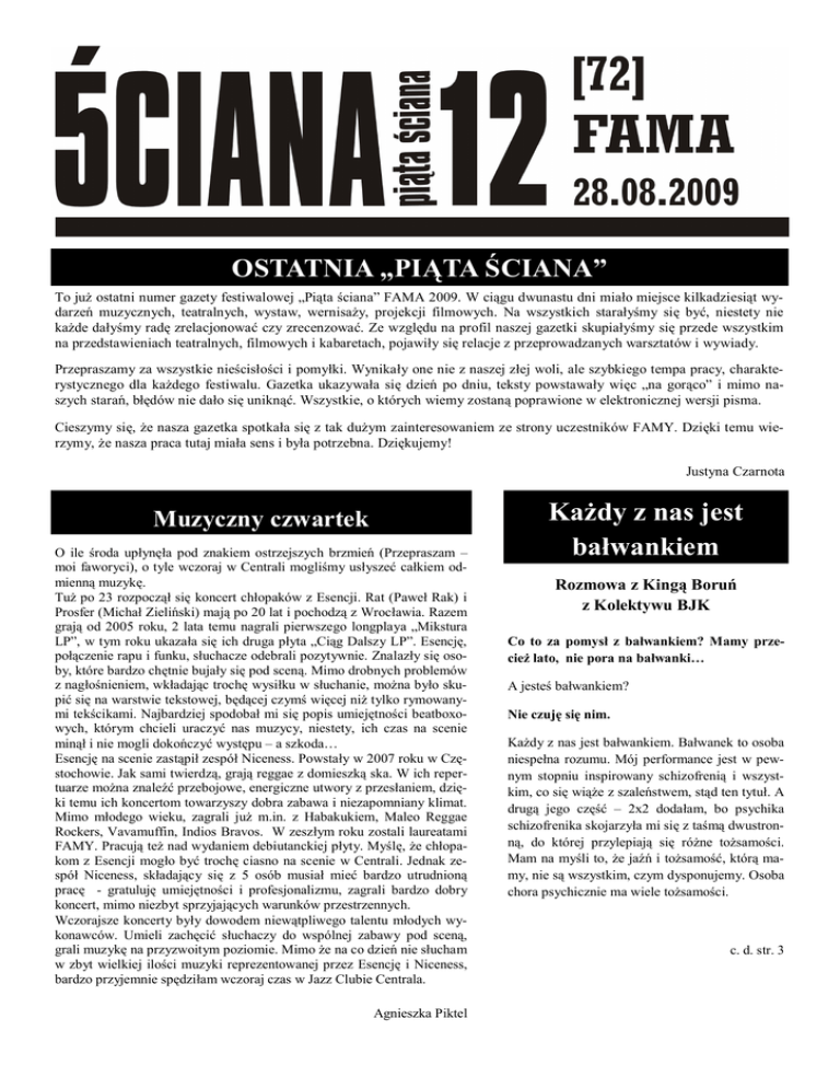 OSTATNIA „PIĄTA ŚCIANA” To już ostatni numer gazety festiwalowej „Piąta ściana” FAMA 2009. W ciągu dwunastu dni miało miejsce kilkadziesiąt wydarzeń muzycznych, teatralnych, wystaw, wernisaży, projekcji filmowych. Na wszystkich starałyśmy się być, niestety nie każde dałyśmy radę zrelacjonować czy zrecenzować. Ze względu na profil naszej gazetki skupiałyśmy się przede wszystkim na przedstawieniach teatralnych, filmowych i kabaretach, pojawiły się relacje z przeprowadzanych warsztatów i wywiady. Przepraszamy za wszystkie nieścisłości i pomyłki. Wynikały one nie z naszej złej woli, ale szybkiego tempa pracy, charakterystycznego dla każdego festiwalu. Gazetka ukazywała się dzień po dniu, teksty powstawały więc „na gorąco” i mimo naszych starań, błędów nie dało się uniknąć. Wszystkie, o których wiemy zostaną poprawione w elektronicznej wersji pisma. Cieszymy się, że nasza gazetka spotkała się z tak dużym zainteresowaniem ze strony uczestników FAMY. Dzięki temu wierzymy, że nasza praca tutaj miała sens i była potrzebna. Dziękujemy! Justyna Czarnota Muzyczny czwartek O ile środa upłynęła pod znakiem ostrzejszych brzmień (Przepraszam – moi faworyci), o tyle wczoraj w Centrali mogliśmy usłyszeć całkiem odmienną muzykę. Tuż po 23 rozpoczął się koncert chłopaków z Esencji. Rat (Paweł Rak) i Prosfer (Michał Zieliński) mają po 20 lat i pochodzą z Wrocławia. Razem grają od 2005 roku, 2 lata temu nagrali pierwszego longplaya „Mikstura LP”, w tym roku ukazała się ich druga płyta „Ciąg Dalszy LP”. Esencję, połączenie rapu i funku, słuchacze odebrali pozytywnie. Znalazły się osoby, które bardzo chętnie bujały się pod sceną. Mimo drobnych problemów z nagłośnieniem, wkładając trochę wysiłku w słuchanie, można było skupić się na warstwie tekstowej, będącej czymś więcej niż tylko rymowanymi tekścikami. Najbardziej spodobał mi się popis umiejętności beatboxowych, którym chcieli uraczyć nas muzycy, niestety, ich czas na scenie minął i nie mogli dokończyć występu – a szkoda… Esencję na scenie zastąpił zespół Niceness. Powstały w 2007 roku w Częstochowie. Jak sami twierdzą, grają reggae z domieszką ska. W ich repertuarze można znaleźć przebojowe, energiczne utwory z przesłaniem, dzięki temu ich koncertom towarzyszy dobra zabawa i niezapomniany klimat. Mimo młodego wieku, zagrali już m.in. z Habakukiem, Maleo Reggae Rockers, Vavamuffin, Indios Bravos. W zeszłym roku zostali laureatami FAMY. Pracują też nad wydaniem debiutanckiej płyty. Myślę, że chłopakom z Esencji mogło być trochę ciasno na scenie w Centrali. Jednak zespół Niceness, składający się z 5 osób musiał mieć bardzo utrudnioną pracę - gratuluję umiejętności i profesjonalizmu, zagrali bardzo dobry koncert, mimo niezbyt sprzyjających warunków przestrzennych. Wczorajsze koncerty były dowodem niewątpliwego talentu młodych wykonawców. Umieli zachęcić słuchaczy do wspólnej zabawy pod sceną, grali muzykę na przyzwoitym poziomie. Mimo że na co dzień nie słucham w zbyt wielkiej ilości muzyki reprezentowanej przez Esencję i Niceness, bardzo przyjemnie spędziłam wczoraj czas w Jazz Clubie Centrala. Agnieszka Piktel Każdy z nas jest bałwankiem Rozmowa z Kingą Boruń z Kolektywu BJK Co to za pomysł z bałwankiem? Mamy przecież lato, nie pora na bałwanki… A jesteś bałwankiem? Nie czuję się nim. Każdy z nas jest bałwankiem. Bałwanek to osoba niespełna rozumu. Mój performance jest w pewnym stopniu inspirowany schizofrenią i wszystkim, co się wiąże z szaleństwem, stąd ten tytuł. A drugą jego część – 2x2 dodałam, bo psychika schizofrenika skojarzyła mi się z taśmą dwustronną, do której przylepiają się różne tożsamości. Mam na myśli to, że jaźń i tożsamość, którą mamy, nie są wszystkim, czym dysponujemy. Osoba chora psychicznie ma wiele tożsamości. c. d. str. 3 2 FAMA - PODSUMOWANIE O ocenę tegorocznej edycji FAMY poprosiłyśmy organizatorów, wolontariuszy i uczestników Tomasz Paduch (Dyrektor Festiwalu): Ocenę FAMY pozostawiam uczestnikom. Magda (recepcjonistka): Fama w tym roku nareszcie wyszła do ludzi, dużo się dzieje. Jest mnóstwo studentów z potencjałem artystycznym. Jest świetnie! Agnieszka (recepcjonistka): Jest ciekawie, w tym roku dzieje się o wiele więcej niż w poprzednim. Niestety, siedzimy tu po dziesięć godzin i niewiele możemy zobaczyć. Justyna (pierwszy raz na FAMIE, wolontariuszka): Trochę zawiodłam się na FAMIE , to nie jest do końca to, czego oczekiwałam. Jak dla mnie, za mało rzeczy działo się na ulicy. Przeszkadzał mi też chaos organizacyjny, mam wrażenie, że tu wszyscy są od wszystkiego. Za to dużym plusem była grupa literacka, która nie mając opiekuna, sama się zorganizowała i wymyśliła naprawdę ciekawe akcje. Paweł Dudko (po raz dugi na FAMIE, uczestnik warsztatów fotograficznych): Mnie brakowało działań teatralnych czy happenerskich odbywających się w przestrzeni miasta. Rozumiem, że dominuje tu muzyka, która zapewnia dobrą zabawę wieczorem, ale mimo to czuję się nieco nieusatysfakcjonowany sztukami wizualnymi innego typu. Ale poza tą małą uwagą – super. Karol Wilkoszewski (piąta FAMA, członek zespołu TransMandala): Chciałbym, żeby w przyszłym roku projekty startujące w konkursie Trójząb Neptuna nie musiały być zgłaszane wcześniej, ale mogły być zgłoszone w trakcie trwania FAMY. Szymon Pietrasiewicz (wieloletni uczestnik FAMY, członek Grupy Tektura): Dla mnie FAMA jeszcze się nie skończyła, więc nie chcę jej oceniać. Przeczytam ostatnią „Piątą ścianę” i będę wiedział, co sądzić o festiwalu. Zbychu (pierwszy raz na FAMIE, związany z Grupą Tektura): Nie mogłem się zdecydować, czy przyjechać na pierwszy, czy drugi tydzień festiwalu. W końcu trafiłem na całą FAMĘ i zostanę tu jes