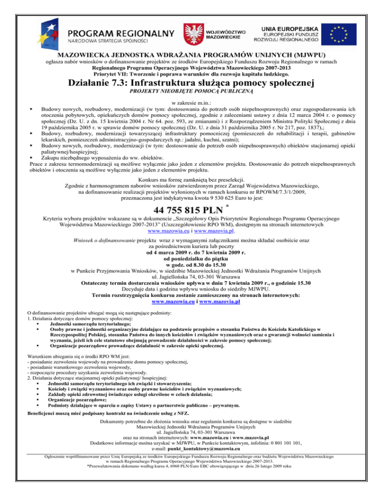 MAZOWIECKA JEDNOSTKA WDRAŻANIA PROGRAMÓW UNIJNYCH (MJWPU) ogłasza nabór wniosków o dofinansowanie projektów ze środków Europejskiego Funduszu Rozwoju Regionalnego w ramach Regionalnego Programu Operacyjnego Województwa Mazowieckiego 2007-2013 Priorytet VII: Tworzenie i poprawa warunków dla rozwoju kapitału ludzkiego. Działanie 7.3: Infrastruktura służąca pomocy społecznej PROJEKTY NIEOBJĘTE POMOCĄ PUBLICZNĄ w zakresie m.in.: Budowy nowych, rozbudowy, modernizacji (w tym: dostosowania do potrzeb osób niepełnosprawnych) oraz zagospodarowania ich otoczenia pobytowych, opiekuńczych domów pomocy społecznej, zgodnie z zaleceniami ustawy z dnia 12 marca 2004 r. o pomocy społecznej (Dz. U. z dn. 15 kwietnia 2004 r. Nr 64. poz. 593, ze zmianami) i z Rozporządzeniem Ministra Polityki Społecznej z dnia 19 października 2005 r. w sprawie domów pomocy społecznej (Dz. U. z dnia 31 października 2005 r. Nr 217, poz. 1837),; Budowy, rozbudowy, modernizacji towarzyszącej infrastruktury pomocniczej (pomieszczeń do rehabilitacji i terapii, gabinetów lekarskich, pomieszczeń administracyjno-gospodarczych np.: jadalni, kuchni, szatni); Budowy nowych, rozbudowy, modernizacji (w tym: dostosowanie do potrzeb osób niepełnosprawnych) obiektów stacjonarnej opieki paliatywnej/hospicyjnej; Zakupu niezbędnego wyposażenia do ww. obiektów. Prace z zakresu termomodernizacji są możliwe wyłącznie jako jeden z elementów projektu. Dostosowanie do potrzeb niepełnosprawnych obiektów i otoczenia są możliwe wyłącznie jako jeden z elementów projektu. Konkurs ma formę zamkniętą bez preselekcji. Zgodnie z harmonogramem naborów wniosków zatwierdzonym przez Zarząd Województwa Mazowieckiego, na dofinansowanie realizacji projektów wyłonionych w ramach konkursu nr RPOWM/7.3/1/2009, przeznaczona jest indykatywna kwota 9 530 625 Euro to jest: 44 755 815 PLN * Kryteria wyboru projektów wskazane są w dokumencie „Szczegółowy Opis Priorytetów Regionalnego Programu Operacyjnego Województwa Mazowieckiego 2007-2013” (Uszczegółowienie RPO WM), dostępnym na stronach internetowych www.mazowia.eu i www.mazovia.pl. Wniosek o dofinansowanie projektu wraz z wymaganymi załącznikami można składać osobiście oraz za pośrednictwem kuriera lub poczty od 4 marca 2009 r. do 7 kwietnia 2009 r. od poniedziałku do piątku w godz. od 8.30 do 15.30 w Punkcie Przyjmowania Wniosków, w siedzibie Mazowieckiej Jednostki Wdrażania Programów Unijnych ul. Jagiellońska 74, 03-301 Warszawa Ostateczny termin dostarczenia wniosków upływa w dniu 7 kwietnia 2009 r., o godzinie 15.30 Decyduje data i godzina wpływu wniosku do siedziby MJWPU. Termin rozstrzygnięcia konkursu zostanie zamieszczony na stronach internetowych: www.mazowia.eu i www.mazovia.pl O dofinansowanie projektów ubiegać mogą się następujące podmioty: 1. Działania dotyczące domów pomocy społecznej: Jednostki samorządu terytorialnego; Osoby prawne i jednostki organizacyjne działające na podstawie przepisów o stosunku Państwa do Kościoła Katolickiego w Rzeczypospolitej Polskiej, stosunku Państwa do innych kościołów i związków wyznaniowych oraz o gwarancji wolności sumienia i wyznania, jeżeli ich cele statutowe obejmują prowadzenie działalności w zakresie pomocy społecznej; Organizacje pozarządowe prowadzące działalność w zakresie opieki społecznej. Warunkiem ubiegania się o środki RPO WM jest: - posiadanie zezwolenia wojewody na prowadzenie domu pomocy społecznej, - posiadanie warunkowego zezwolenia wojewody, - rozpoczęcie procedury uzyskania zezwolenia wojewody. 2. Działania dotyczące stacjonarnej opieki paliatywnej/ hospicyjnej: Jednostki samorządu terytorialnego ich związki i stowarzyszenia; Kościoły i związki wyznaniowe oraz osoby prawne kościołów i związków wyznaniowych; Zakłady opieki zdrowotnej świadczące usługi określone w celach działania; Organizacje pozarządowe; Podmioty działające w oparciu o zapisy Ustawy o partnerstwie publiczno – prywatnym. Beneficjenci muszą mieć podpisany kontrakt na świadczenie usług z NFZ. Dokumenty potrzebne do złożenia wniosku oraz regulamin konkursu są dostępne w siedzibie Mazowieckiej Jednostki Wdrażania Programów Unijnych ul. Jagiellońska 74, 03-301 Warszawa oraz na stronach internetowych: www.mazowia.eu i www.mazovia.pl Dodatkowe informacje można uzyskać w MJWPU, w Punkcie kontaktowym, infolinia: 0 801 101 101, e-mail: [email protected] Ogłoszenie współfinansowane przez Unię Europejską ze środków Europejskiego Funduszu Rozwoju Regionalnego oraz budżetu Województwa Mazowieckiego w ramach Regionalnego Programu Operacyjnego Województwa Mazowieckiego 2007-2013. *Przewalutowania dokonano według kursu 4, 6960 PLN/Euro EBC obowiązującego w dniu 26 lutego 2009 roku