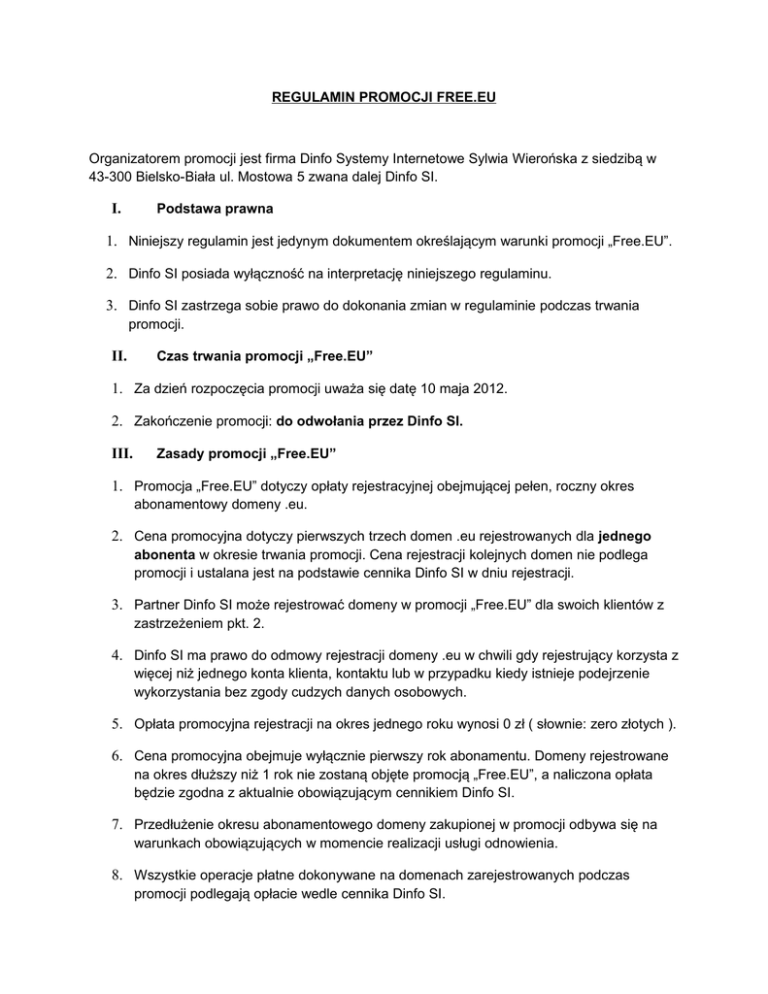 REGULAMIN PROMOCJI FREE.EU Organizatorem promocji jest firma Dinfo Systemy Internetowe Sylwia Wierońska z siedzibą w 43-300 Bielsko-Biała ul. Mostowa 5 zwana dalej Dinfo SI. I. Podstawa prawna 1. Niniejszy regulamin jest jedynym dokumentem określającym warunki promocji „Free.EU”. 2. Dinfo SI posiada wyłączność na interpretację niniejszego regulaminu. 3. Dinfo SI zastrzega sobie prawo do dokonania zmian w regulaminie podczas trwania promocji. II. Czas trwania promocji „Free.EU” 1. Za dzień rozpoczęcia promocji uważa się datę 10 maja 2012. 2. Zakończenie promocji: do odwołania przez Dinfo SI. III. Zasady promocji „Free.EU” 1. Promocja „Free.EU” dotyczy opłaty rejestracyjnej obejmującej pełen, roczny okres abonamentowy domeny .eu. 2. Cena promocyjna dotyczy pierwszych trzech domen .eu rejestrowanych dla jednego abonenta w okresie trwania promocji. Cena rejestracji kolejnych domen nie podlega promocji i ustalana jest na podstawie cennika Dinfo SI w dniu rejestracji. 3. Partner Dinfo SI może rejestrować domeny w promocji „Free.EU” dla swoich klientów z zastrzeżeniem pkt. 2. 4. Dinfo SI ma prawo do odmowy rejestracji domeny .eu w chwili gdy rejestrujący korzysta z więcej niż jednego konta klienta, kontaktu lub w przypadku kiedy istnieje podejrzenie wykorzystania bez zgody cudzych danych osobowych. 5. Opłata promocyjna rejestracji na okres jednego roku wynosi 0 zł ( słownie: zero złotych ). 6. Cena promocyjna obejmuje wyłącznie pierwszy rok abonamentu. Domeny rejestrowane na okres dłuższy niż 1 rok nie zostaną objęte promocją „Free.EU”, a naliczona opłata będzie zgodna z aktualnie obowiązującym cennikiem Dinfo SI. 7. Przedłużenie okresu abonamentowego domeny zakupionej w promocji odbywa się na warunkach obowiązujących w momencie realizacji usługi odnowienia. 8. Wszystkie operacje płatne dokonywane na domenach zarejestrowanych podczas promocji podlegają opłacie wedle cennika Dinfo SI. 9. Uczestnikiem promocji może zostać każdy podmiot, który w okresie jej trwania dokona zamówienia domeny .eu. 10. Zamówienia można dokonać wyłącznie poprzez zgłoszenie domeny do rejestracji w panelu klienta lub wypełniając formularz rejestracyjny na stronie http://dinfo.pl/rejestracja-domeny 11. Złożenie zamówienia nie oznacza rejestracji domeny. Domena rejestrowana jest przez system Dinfo SI po zweryfikowaniu zgłoszenia. 12. Dokonanie rejestracji domeny w promocji „Free.EU” jest jednoznaczne z oświadczeniem o zapoznaniu się i akceptacją następujących regulaminów: – Regulamin Dinfo Systemy Internetowe http://www.dinfo.pl/regulamin – Polityka rejestracji domen .eu http://www.eurid.eu/files/reg_pol_PL.pdf – Warunki korzystania z domen .eu http://www.eurid.eu/files/trm_con_PL.pdf 13. W przypadku złamania zasad promocji „Free.EU” lub któregokolwiek z regulaminów wymienionych w pkt.10. Dinfo SI zastrzega sobie prawo odmowy rejestracji domeny. 14. Dinfo SI zastrzega sobie prawo do zażądania od abonenta dokumentu potwierdzającego jego tożsamość lub w przypadku firm, zaświadczeń NIP i REGON. Dokument taki należy przesłać w formie elektronicznej do Dinfo SI w terminie 2 dni roboczych od chwili otrzymania wezwania. Brak nadesłania dokumentu jest jednoznaczny ze złamaniem regulaminu i skutkuje usunięciem domeny lub zgłoszenia do rejestracji. 15. Wszystkie domeny .eu zarejestrowane podczas trwania promocji „Free.EU” podlegają ogólnym zasadom utrzymania domen w Dinfo SI w trakcie całego okresu abonamentowego. IV. Odpowiedzialność Dinfo SI 1. Dinfo SI nie ponosi odpowiedzialności za kwestie sporne powstałe na skutek działania osób trzecich.