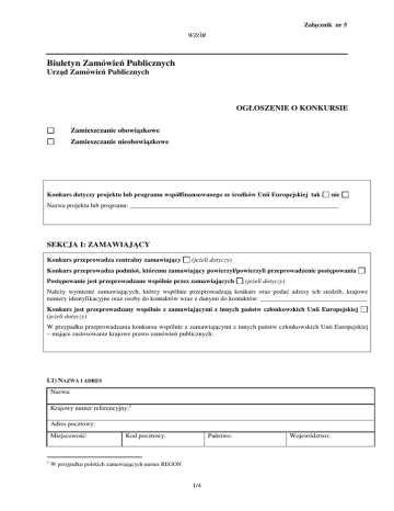 Załącznik nr 5 WZÓR Biuletyn Zamówień Publicznych Urząd Zamówień Publicznych OGŁOSZENIE O KONKURSIE Zamieszczanie obowiązkowe Zamieszczanie nieobowiązkowe Konkurs dotyczy projektu lub programu współfinansowanego ze środków Unii Europejskiej tak nie Nazwa projektu lub programu: _______________________________________________________________ SEKCJA I: ZAMAWIAJĄCY Konkurs przeprowadza centralny zamawiający (jeżeli dotyczy) Konkurs przeprowadza podmiot, któremu zamawiający powierzył/powierzyli przeprowadzenie postępowania Postępowanie jest przeprowadzane wspólnie przez zamawiających (jeżeli dotyczy) Należy wymienić zamawiających, którzy wspólnie przeprowadzają konkurs oraz podać adresy ich siedzib, krajowe numery identyfikacyjne oraz osoby do kontaktów wraz z danymi do kontaktów: ________________________________ Konkurs jest przeprowadzany wspólnie z zamawiającymi z innych państw członkowskich Unii Europejskiej (jeżeli dotyczy) W przypadku przeprowadzania konkursu wspólnie z zamawiającymi z innych państw członkowskich Unii Europejskiej – mające zastosowanie krajowe prawo zamówień publicznych: I.1) NAZWA I ADRES Nazwa: Krajowy numer referencyjny:1 Adres pocztowy: Miejscowość: 1 Kod pocztowy: Państwo: W przypadku polskich zamawiających numer REGON 1/4 Województwo: Tel.: Faks: E-mail: Adres strony internetowej (URL) Adres profilu nabywcy (jeżeli dotyczy): Adres strony internetowej, pod którym można uzyskać dostęp do narzędzi i urządzeń oraz formatów plików, które nie są ogólnie dostępne (jeżeli dotyczy): I.2) RODZAJ ZAMAWIAJĄCEGO Administracja rządowa centralna Administracja rządowa terenowa Administracja samorządowa Jednostka administracji samorządowej Zamawiający udzielający zamówień ze środków publicznych lub finansowych przez określone podmioty o którym mowa w art. 3 ust. 1 pkt 5 ustawy Pzp Zamawiający udzielający zamówień sektorowych Podmiot prawa publicznego Inny (proszę określić): I.3) WSPÓLNE ORGANIZOWANIE KONKURSU (jeżeli dotyczy) Podział obowiązków między zamawiającymi w przypadku wspólnego przeprowadzania konkursu, w tym w przypadku wspólnego przeprowadzania konkursu z zamawiającymi z innych państw członkowskich Unii Europejskiej (który z zamawiających jest odpowiedzialny za przeprowadzenie konkursu, czy i w jakim zakresie za przeprowadzenie konkursu odpowiadają pozostali zamawiający, czy nagroda w konkursie będzie przyznawana przez każdego z zamawiających indywidualnie, czy nagroda zostanie przyznana wspólnie w imieniu zamawiających): I.4) KOMUNIKACJA Nieograniczony, pełny i bezpośredni dostęp do dokumentów konkursowych, w tym regulaminu konkursu, można uzyskać pod adresem (URL): _____________________________________________________________ Dostęp do dokumentów konkursowych jest ograniczony- więcej informacji można znaleźć pod adresem: _____________________________________________________________________________________________ Wnioski o dopuszczenie do udziału w konkursie/Prace konkursowe należy przesyłać: Elektronicznie Pod adres: _________________________________________________________________________ Dopuszczone lub wymagane jest przesłanie wniosków o dopuszczenie do udziału w konkursie/prac konkursowych w inny sposób: ___________________________________________________________ Pod adres2: _________________________________________________________________________ 2 Adres pocztowy, numer faksu 2/4 Komunikacja elektroniczna wymaga korzystania z narzędzi i urządzeń, które nie są ogólnodostępne. Nieograniczony, pełny i bezpośredni dostęp do tych narzędzi można uzyskać pod adresem (URL): ___________________________________________________________________________________ SEKCJA II: PRZEDMIOT KONKURSU II.1) Nazwa nadana konkursowi przez zamawiającego Numer referencyjny (jeżeli dotyczy): II.2) Określenie przedmiotu konkursu: II.3) Główny kod CPV Dodatkowe kody CPV . . . - . . . - 3 SEKCJA III: INFORMACJE O CHARAKTERZE PRAWNYM, EKONOMICZNYM, FINANSOWYM I TECHNICZNYM WARUNKI UDZIAŁU Wymagania, jakie muszą spełniać uczestnicy konkursu:4 __________________________________________ Czy udział w konkursie jest zastrzeżony dla wykonawcy posiadającego uprawnienia do prowadzenia określonej działalności zawodowej: tak nie Należy podać dla jakiego zawodu: _________________________________________________________ SEKCJA IV: PROCEDURA IV.1) KRYTERIA OCENY PRAC KONKURSOWYCH 3 Zastosować tyle razy, ile jest to potrzebne Jeżeli nagrodą w konkursie jest zaproszenie do negocjacji w trybie negocjacji bez ogłoszenia co najmniej dwóch autorów wybranych prac konkursowych lub zaproszenie do negocjacji w trybie zamówienia z wolnej ręki autora wybranej pracy konkursowej, przepis art. 22 ustawy stosuje się odpowiednio. 4 3/4 Znaczenie Kryteria 1. 2. 3. 4. 5. IV.2) INFORMACJE ADMINISTRACYJNE IV.2.1 Termin i adres składania wniosków o dopuszczenie do udziału w konkursie/prac konkursowych: / / (dd/mm/rrrr) Godzina: _____________ Data: Adres, na który należy przesyłać wnioski o dopuszczenie do udziału w konkursie/prace konkursowe: ________________ Język lub języki, w jakich mogą być sporządzane wnioski o dopuszczenie do udziału w konkursie lub prace konkursowe: _______________________________________________________________________________________________ IV.2.2 Informacje dodatkowe: _____________________________________________________________________ IV.3) NAGRODY Rodzaj, liczba i wysokość nagród: __________________________________________________________________ Zamawiający przewiduje udzielenie zamówienia po konkursie: tak Zamówienie zostanie udzielone: zwycięscy konkursu: tak nie nie Zamówienie zostanie udzielone po przeprowadzeniu procedury konkurencyjnej pomiędzy wykonawcami, którzy złożyli najlepsze prace konkursowe: tak nie Informacje dodatkowe: ________________________________________________________________________
