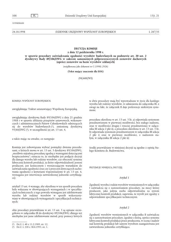 108 PL Dziennik Urzędowy Unii Europejskiej 13/t. 21 DZIENNIK URZĘDOWY WSPÓLNOT EUROPEJSKICH L 287/35 31998D0600 24.10.1998 DECYZJA KOMISJI z dnia 12 października 1998 r. w sprawie procedury zaświadczania zgodności wyrobów budowlanych na podstawie art. 20 ust. 2 dyrektywy Rady 89/106/EWG w zakresie samonośnych półprzezroczystych zestawów dachowych (oprócz zestawów na bazie wyrobów szklanych) (notyfikowana jako dokument nr C (1998) 2926) (Tekst mający znaczenie dla EOG) (98/600/WE) KOMISJA WSPÓLNOT EUROPEJSKICH, uwzględniając Traktat ustanawiający Wspólnotę Europejską, uwzględniając dyrektywę Rady 89/106/EWG z dnia 21 grudnia 1988 r w sprawie zbliżenia przepisów ustawowych, wykonawczych i administracyjnych Państw Członkowskich odnoszących się do wyrobów budowlanych (1), zmienioną dyrektywą 93/68/EWG (2), w szczególności jej art. 13 ust. 4, a także mając na uwadze, co następuje: Komisja jest zobowiązana wybrać pomiędzy dwiema procedurami, o których mowa w art. 13 ust. 3 dyrektywy 89/106/EWG, „możliwie najtańszą procedurę zgodną z wymogami dotyczącymi bezpieczeństwa”; oznacza to, że niezbędne jest podjęcie decyzji dla danego wyrobu lub rodziny wyrobów, czy obecność systemu fabrycznej kontroli produkcji, za który odpowiedzialność ponosi producent, jest koniecznym i wystarczającym warunkiem do zaświadczania zgodności oraz czy z przyczyn dotyczących zachowania zgodności z kryteriami wspomnianymi w art. 13 ust. 4, wymagana jest interwencja zatwierdzonej jednostki certyfikującej; artykuł 13 ust. 4 wymaga, aby określona w ten sposób procedura była wskazana w obowiązujących wymaganiach i w specyfikacjach technicznych; z tego powodu wymagane jest zdefiniowanie wyrobu lub rodziny wyrobów w sposób wykorzystywany w obowiązujących wymaganiach i specyfikacjach technicznych; obie procedury przewidziane w art. 13 ust. 3 są opisane szczegółowo w załączniku III do dyrektywy 89/106/EWG; dlatego też niezbędne jest jasne zdefiniowanie metod, przy pomocy których (1) Dz.U. L 40 z 11.2.1989, str. 12. (2) Dz.U. L 220 z 30.8.1993, str. 1. te dwie procedury mają być wprowadzane w życie dla każdego wyrobu lub rodziny wyrobów, w odniesieniu do załącznika III, z uwagi na fakt, że załącznik II daje preferencje niektórym systemom; procedura określona w art. 13 ust. 3 lit. a) odpowiada systemom przedstawionym w pierwszej możliwości, bez stałego nadzoru, oraz w możliwości drugiej i trzeciej przedstawionej w załączniku III sekcja 2 pkt ii), a procedura określona w art. 13 ust. 3 lit. b) odpowiada systemom przedstawionym w załączniku III sekcja 2 pkt i) oraz w pierwszej możliwości, z nadzorem stałym, w załączniku III sekcja 2 pkt ii); środki przewidziane w niniejszej decyzji są zgodne z opinią Stałego Komitetu ds. Budownictwa, PRZYJMUJE NINIEJSZĄ DECYZJĘ: Artykuł 1 Zgodność wyrobu i rodzin wyrobów wymienionych w załączniku I zaświadcza się z zastosowaniem procedury, na mocy której producent, jako jedyna osoba odpowiedzialna za system fabrycznej kontroli produkcji, zapewnia, że wyrób jest zgodny z odpowiednimi specyfikacjami technicznymi. Artykuł 2 Zgodność wyrobów wymienionych w załączniku II zaświadcza się z zastosowaniem procedury, zgodnie z którą, oprócz systemu fabrycznej kontroli produkcji przez producenta, w ocenę i nadzór nad kontrolą produkcji lub samym wyrobem zaangażowana jest zatwierdzona jednostka certyfikująca. 13/t. 21 PL Dziennik Urzędowy Unii Europejskiej 109 Artykuł 3 Procedurę zaświadczania zgodności określoną w załączniku III wskazuje się w mandatach dotyczących wytycznych dla europejskich zatwierdzeń technicznych. Artykuł 4 Niniejsza decyzja jest skierowana do Państw Członkowskich. Sporządzono w Brukseli, dnia 12 października 1998 r. W imieniu Komisji Martin BANGEMANN Członek Komisji 110 PL Dziennik Urzędowy Unii Europejskiej ZAŁĄCZNIK I Samonośne półprzezroczyste zestawy dachowe (oprócz zestawów na bazie wyrobów szklanych) Przeznaczone do wszystkich celów z wyjątkiem tych podlegających przepisom w zakresie reakcji na ogień dla wyrobów wykonanych z materiałów należących do klas A (1), B (1), C (1) . (1) Materiały, u których należy liczyć się z tym, że właściwości reakcji na ogień zmieniają się podczas procesu produkcyjnego (ogólnie rzecz biorąc takie, które są poddawane modyfikacjom chemicznym, np. opóźniacze ognia, lub których zmiany w składzie mogą prowadzić do zmiany właściwości reakcji na ogień). 13/t. 21 13/t. 21 PL Dziennik Urzędowy Unii Europejskiej ZAŁĄCZNIK II Samonośne półprzezroczyste zestawy dachowe (oprócz zestawów na bazie wyrobów szklanych) Do zastosowań podlegających przepisom reakcji na ogień dla wyrobów wykonanych z materiałów należących do klas A (1), B (1), C (1) . (1) Materiały, u których należy liczyć się z tym, że właściwości reakcji na ogień zmieniają się podczas procesu produkcyjnego (ogólnie rzecz biorąc takie, które są poddawane modyfikacjom chemicznym, np. opóźniacze ognia, lub których zmiany w składzie mogą prowadzić do zmiany właściwości reakcji na ogień). 111 112 Dziennik Urzędowy Unii Europejskiej PL 13/t. 21 ZAŁĄCZNIK III Uwaga: Dla wyrobów przeznaczonych na więcej niż jeden cel wskazanych w następujących rodzinach poniżej, zadania uprawnionego organu zgodnie z odpowiednimi systemami atestacji systemów zaświadczania zgodności, kumulują się. RODZINA WYROBÓW SAMONOŚNE PÓŁPRZEZROCZYSTE ZESTAWY DACHOWE (Z WYJĄTKIEM ZESTAWÓW NA BAZIE WYROBÓW SZKLANYCH) (1/3) 1. Systemy zaświadczania zgodności Dla wyrobu(ów) i przewidzianych zastosowań wnosi się do Europejskiej Organizacji Aprobaty Technicznej (EOTA) o wyszczególnienie następujących systemów zaświadczania zgodności w stosownych wytycznych europejskiej aprobaty technicznej: Wyrób (wyroby) Samonośne półprzezroczyste zestawy dachowe (oprócz zestawó