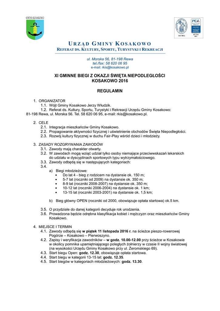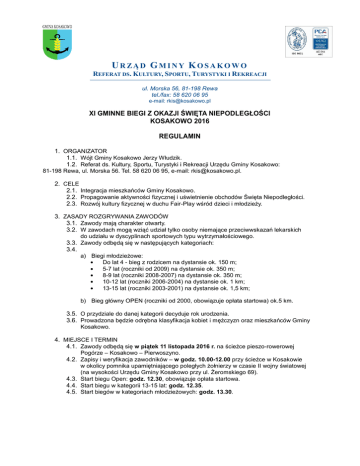 URZĄD GMINY KOSAKOWO REFERAT DS. KULTURY, SPORTU, TURYSTYKI I REKREACJI ul. Morska 56, 81-198 Rewa tel./fax: 58 620 06 95 e-mail: [email protected] XI GMINNE BIEGI Z OKAZJI ŚWIĘTA NIEPODLEGŁOŚCI KOSAKOWO 2016 REGULAMIN 1. ORGANIZATOR 1.1. Wójt Gminy Kosakowo Jerzy Włudzik. 1.2. Referat ds. Kultury, Sportu, Turystyki i Rekreacji Urzędu Gminy Kosakowo: 81-198 Rewa, ul. Morska 56. Tel. 58 620 06 95, e-mail: [email protected]. 2. CELE 2.1. Integracja mieszkańców Gminy Kosakowo. 2.2. Propagowanie aktywności fizycznej i uświetnienie obchodów Święta Niepodległości. 2.3. Rozwój kultury fizycznej w duchu Fair-Play wśród dzieci i młodzieży. 3. ZASADY ROZGRYWANIA ZAWODÓW 3.1. Zawody mają charakter otwarty. 3.2. W zawodach mogą wziąć udział tylko osoby niemające przeciwwskazań lekarskich do udziału w dyscyplinach sportowych typu wytrzymałościowego. 3.3. Zawody odbędą się w następujących kategoriach: 3.4. a) Biegi młodzieżowe: • Do lat 4 - bieg z rodzicem na dystansie ok. 150 m; • 5-7 lat (roczniki od 2009) na dystansie ok. 350 m; • 8-9 lat (roczniki 2008-2007) na dystansie ok. 350 m; • 10-12 lat (roczniki 2006-2004) na dystansie ok. 1 km; • 13-15 lat (roczniki 2003-2001) na dystansie ok. 1,5 km; b) Bieg główny OPEN (roczniki od 2000, obowiązuje opłata startowa) ok.5 km. 3.5. O przydziale do danej kategorii decyduje rok urodzenia. 3.6. Prowadzona będzie odrębna klasyfikacja kobiet i mężczyzn oraz mieszkańców Gminy Kosakowo. 4. MIEJSCE I TERMIN 4.1. Zawody odbędą się w piątek 11 listopada 2016 r. na ścieżce pieszo-rowerowej Pogórze – Kosakowo – Pierwoszyno. 4.2. Zapisy i weryfikacja zawodników – w godz. 10.00-12.00 przy ścieżce w Kosakowie w okolicy pomnika upamiętniającego poległych żołnierzy w czasie II wojny światowej (na wysokości Urzędu Gminy Kosakowo przy ul. Żeromskiego 69). 4.3. Start biegu Open: godz. 12.30, obowiązuje opłata startowa. 4.4. Start biegu w kategorii 13-15 lat: godz. 12.35. 4.5. Start biegów w kategoriach młodzieżowych: godz. 13.30. 5. ZGŁOSZENIA 5.1. Zgłoszeń do biegów dokonywać można do środy 09.11.2016 r., do godz. 21.00 poprzez formularz dostępny na stronach: • http://kosakowo.pl/rkis • https://elektronicznezapisy.pl/event/887/signup.html Możliwe będą również zapisy na miejscu w biurze zawodów w godz. 10.00-12.00. 5.2. Dla biegu Open obowiązuje opłata startowa: 5.3. • płatna przelewem poprzez formularz zgłoszeniowy do 09.11.2016 r. godz. 21.00: 5,00 zł dla mieszkańców Gminy Kosakowo, 10,00 zł dla osób spoza Gminy Kosakowo; • płatna na miejscu w biurze zawodów, 11.11.2016 r., w godz. 10.00-12.00: 10,00 zł dla mieszkańców Gminy Kosakowo, 15,00 zł dla osób spoza Gminy Kosakowo. 5.4. Zapisy do biegów w kategoriach dzieci i młodzieży przyjmowane są bezpłatnie. 5.5. Poprzez zgłoszenie się do biegu, uczestnik wyraża zgodę na publikację swojego wizerunku na stronach internetowych oraz w lokalnej prasie. 5.6. Raz uiszczona opłata nie może ulec zwrotowi ani przeniesieniu na poczet innej osoby. 6. NAGRODY 6.1. Pamiątkowe medale dla wszystkich uczestników, którzy ukończą bieg. Organizator 6.2. 6.3. 6.4. 6.5. 6.6. zapewnia na mecie ograniczoną liczbę medali. W przypadku większej liczby osób dodatkowe medale będą do odbioru w Referacie ds. Kultury i Sportu (Rewa, ul. Morska 56), po wpisaniu się na odpowiednią listę po zakończonym biegu. Nagrody rzeczowe dla miejsc od I do VI (K i M) w kategoriach dzieci i młodzieży z wyłączeniem kategorii dzieci do lat 4. Nagrody rzeczowe odpowiednio według zajętego miejsca: I, II, III miejsce w klasyfikacji generalnej Kobiet i Mężczyzn I, II, III miejsce w klasyfikacji mieszkańców Gminy Kosakowo (K i M) I, II, III miejsce w klasyfikacji mieszkańców 55+ Gminy Kosakowo Pamiątkowe puchary ufundowane przez Prezesa Zarządu Związku Piłsudczyków RP Stanisława Władysława Śliwę. I, II, III miejsce w klasyfikacji mieszkańców 55+ z Gminy Kosakowo Pamiątkowe puchary ufundowane przez Sołtysa wsi Kosakowo Najlepszy mieszkaniec i mieszkanka Sołectwa Kosakowo Nagrody nie dublują się, w przypadku zajęcia przez zawodnika miejsca I-III w więcej niż jednej kategorii, otrzymuje on tylko jedną nagrodę – o większej wartości. 7. INFORMACJE DODATKOWE 7.1. Każdy uczestnik powinien mieć wykupione ubezpieczenie NNW we własnym zakresie. 7.2. Zawodnicy będą mieć możliwość oddania swoich rzeczy w depozyt; odbiór rzeczy – na podstawie numeru startowego. 7.3. Każdy uczestnik na podstawie numeru startowego otrzyma na mecie: medal, wodę i słodki poczęstunek. 7.4. Wyniki biegów zostaną zamieszczone na stronie Referatu: kosakowo.pl/rkis, w Biuletynie Gminy Kosakowo oraz w lokalnej prasie. 7.5. Ostateczna interpretacja niniejszego regulaminu należy do organizatora. URZĄD GMINY KOSAKOWO REFERAT DS. KULTURY, SPORTU, TURYSTYKI I REKREACJI ul. Morska 56, 81-198 Rewa tel./fax: 58 620 06 95 e-mail: [email protected]