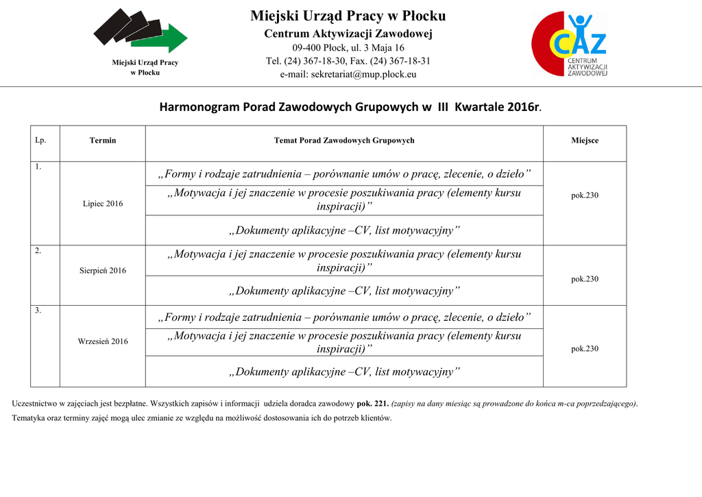 Miejski Urząd Pracy w Płocku Centrum Aktywizacji Zawodowej Miejski Urząd Pracy w Płocku 09-400 Płock, ul. 3 Maja 16 Tel. (24) 367-18-30, Fax. (24) 367-18-31 e-mail: [email protected] Harmonogram Porad Zawodowych Grupowych w III Kwartale 2016r. Lp. Termin 1. Temat Porad Zawodowych Grupowych Miejsce „Formy i rodzaje zatrudnienia – porównanie umów o pracę, zlecenie, o dzieło” Lipiec 2016 „Motywacja i jej znaczenie w procesie poszukiwania pracy (elementy kursu inspiracji)” pok.230 „Dokumenty aplikacyjne –CV, list motywacyjny” 2. Sierpień 2016 „Motywacja i jej znaczenie w procesie poszukiwania pracy (elementy kursu inspiracji)” pok.230 „Dokumenty aplikacyjne –CV, list motywacyjny” 3. „Formy i rodzaje zatrudnienia – porównanie umów o pracę, zlecenie, o dzieło” Wrzesień 2016 „Motywacja i jej znaczenie w procesie poszukiwania pracy (elementy kursu inspiracji)” pok.230 „Dokumenty aplikacyjne –CV, list motywacyjny” Uczestnictwo w zajęciach jest bezpłatne. Wszystkich zapisów i informacji udziela doradca zawodowy pok. 221. (zapisy na dany miesiąc są prowadzone do końca m-ca poprzedzającego). Tematyka oraz terminy zajęć mogą ulec zmianie ze względu na możliwość dostosowania ich do potrzeb klientów.