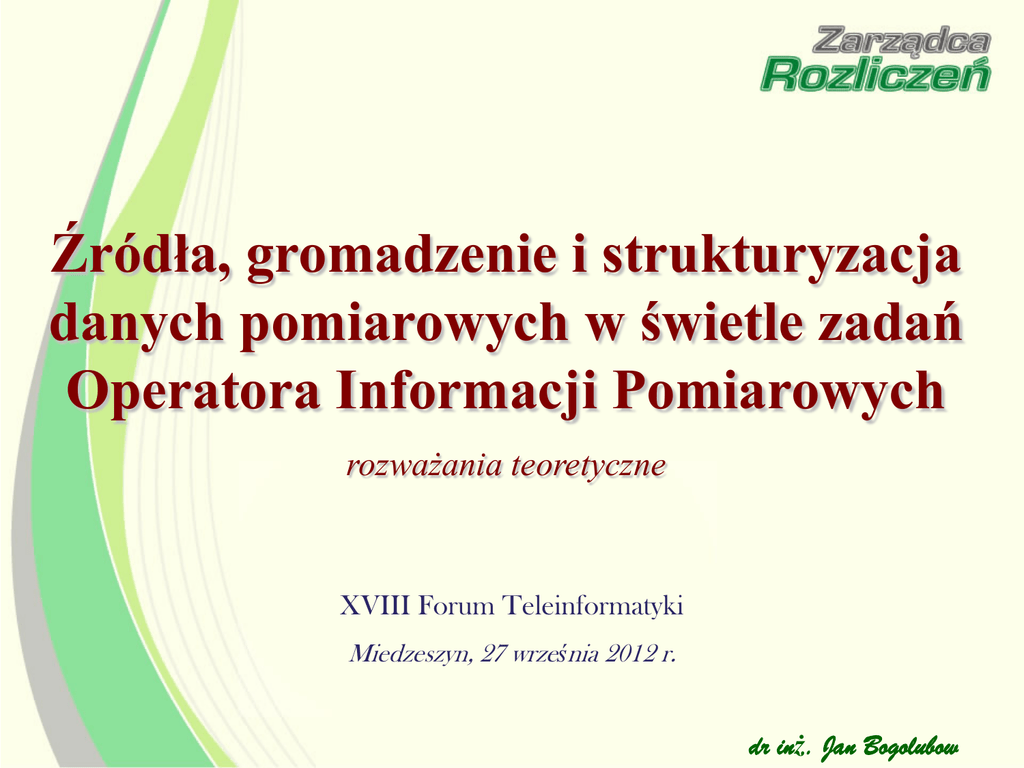 Źródła, gromadzenie i strukturyzacja danych pomiarowych w świetle zadań Operatora Informacji Pomiarowych rozważania teoretyczne XVIII Forum Teleinformatyki Miedzeszyn, 27 września 2012 r. dr inż. Jan Bogolubow Plan prezentacji • Wprowadzenie – kilka definicji, podstawowe regulacje, zadania OIP • Teoria (przebieg) i praktyka (uproszczenie) • Zawartość informacji pomiarowej – przykłady • Przebieg procesów, przepływ danych • Podsumowanie, wnioski końcowe www.zrkdt.pl dr inż. Jan Bogolubow 2 Wprowadzenie (1) kilka definicji - informacje pomiarowe (IP) Dane pomiarowe – rzeczywista wielkość wytworzonej i zużytej ee, niedotrzymanie parametrów jakościowych ee, przekroczenie mocy umownej i ponadnormatywny pobór ee Komendy sterujące – polecenia kierowane do licznika wpływające na pobór ee Sygnały rynkowe – informacje o obowiązujących w danym okresie cenach ee lub stawkach opłat za usługi przesyłania i dystrybucji www.zrkdt.pl dr inż. Jan Bogolubow 3 Wprowadzenie (2) podstawowe regulacje • Obowiązek instalacji inteligentnych liczników przez OSD • Rozliczenia za energię elektryczną oraz rozliczenia usługi przesyłania i dystrybucji na podstawie rzeczywistego zużycia • Dane do rozliczeń tylko od OIP, OSD może wykorzystać swoje ale do rozstrzygnięć ważne tylko dane OIP • OIP pozyskuje i udostępnia dane pomiarowe odpłatnie wg taryfy zatwierdzanej przez Prezesa URE • W procesie zmiany sprzedawcy lub rozpoczęcia sprzedaży awaryjnej – wymiana informacji między sprzedawcą i operatorem systemu tylko i wyłącznie za pośrednictwem OIP 4 www.zrkdt.pl dr inż. Jan Bogolubow 4 Wprowadzenie (3) Operator Informacji Pomiarowych (OIP) Podmiot pozyskujący i gromadzący dane pomiarowe i udostępniający je uprawnionym do tego podmiotom, powołany mocą ustawy, pełniący rolę regulowanego podmiotu zaufania publicznego. Stanowi regulowany podmiot zaufania publicznego •Tworzy centralny zbiór informacji pomiarowych (CZIP) •Odbiera, przetwarza, przechowuje, udostępnia i wysyła informacje pomiarowe •Prowadzi ewidencję punktów pomiarowych •Określa standardy dostępu do CZIP •Tworzy klasyfikację danych pomiarowych, określając częstość ich odbierania i udostępniania •Archiwizuje informacje pomiarowe 5 www.zrkdt.pl dr inż. Jan Bogolubow 5 Teoria i praktyka (1) model rynku opomiarowania Miejsce i rola operatora informacji pomiarowej w systemie obiegu informacji pomiarowej jest elementem uproszczenia tego systemu, zwiększenia dostępności, a co najważniejsze, rozwoju i wspomagania nieujawnionych dotychczas funkcjonalności Odpowiedź na pytanie czego rynek oczekuje od systemu przepływu i wymiany informacji pomiarowej pozwoli na precyzyjne określenie zakresu funkcjonalności Ingerencja OIP w poszczególne procesy dopuszczalna jest tylko wtedy, gdy zachowania poszczególnych uczestników naruszają swobodę dostępu do konkurencyjności na rynku Funkcjonowanie OIP oraz rola i zadania poszczególnych uczestników rynku wymaga prawnego oraz umownego uregulowania, jakiego stopnia szczegółowości wymagają te uregulowania, jakie są oczekiwania w tym zakresie. Zasadniczym pytaniem jest, czy rynek przyjmie czy odrzuci zalążki „nowego” oraz jak „wykorzysta” nowe struktury Na każdym etapie konieczne jest zapewnienie spełnienia wymogów bezpieczeństwa i ochrony danych wrażliwych w zgodzie z istniejącymi przepisami, ale to nie może blokować rozwoju i wdrożenia systemu www.zrkdt.pl dr inż. Jan Bogolubow 6 Teoria i praktyka (2) praktyczne uproszczenie BĘDZIE JEST OSP OSD sprzedawcy wytwórcy OSP OSD sprzedawcy wytwórcy OIP sp. obrotu odb. końcowi prosument www.zrkdt.pl sp. obrotu odb. końcowi prosument dr inż. Jan Bogolubow 7 Zawartość Informacji Pomiarowej (1) treść danych pomiarowych Dane identyfikujące licznik, znacznik czasu Wielkość energii elektrycznej czynnej – pobranej lub oddanej do sieci, rozdzielczość 15 minut pobór w obu kierunkach Energia bierna w obu kierunkach Wartość pobranej mocy 15-minutowej maksymalnej w okresie rozliczeniowym Informacje o zanikach napięcia i jego powrocie Informacje o przekroczeniu progów dopuszczalnych odchyleń napięcia Wartość mocy umownej Sygnał o naruszeniu integralności urządzenia Informacje na żądanie (bieżące zużycie, dziennik zdarzeń, ustawienia bieżące) www.zrkdt.pl dr inż. Jan Bogolubow 8 Zawartość Informacji Pomiarowej (2) komendy sterujące i sygnały rynkowe Sygnały rynkowe Komendy Sterujące Kod Nadawcy, Kod polecenia, kod adresata, parametry realizacji polecenia www.zrkdt.pl Kod Nadawcy, rodzaj sygnału rynkowego, kod adresata, kod rozgłaszania, treść informacji (suma stawki zmiennej dystrybucyjnej i ceny w podziale na strefy czasowe oraz stawka stała dr inż. Jan Bogolubow 9 Przebieg procesów przepływ danych Granica sieci Gdy wytwórca sprzedaje e.e. Wytwórcy Sprzedawcy OSP OIP OSD Procedura zmiany sprzedawcy Dane pomiarowe Relacje umowne OIP Odbiorcy/Prosumenci www.zrkdt.pl dr inż. Jan Bogolubow 10 Zmiana Sprzedawcy przepływ danych Licznik OSD, aplikacja OSD OIP, CZIP Nowy Sprzedawca na dzień sprzedaży po dniu sprzedaży Stary Sprzedawca Odbiorca www.zrkdt.pl dr inż. Jan Bogolubow 11 Wymiana informacji Udostępnianie zagregowanych danych nieodpłatnie – MG, MŚ, URE, UOKiK, operatorzy w celach bezpieczeństwa KSE i bieżących rozliczeń odpłatnie – inne podmioty oraz operatorzy w celach innych aniżeli ww. Udostępnianie jednostkowych danych nieodpłatnie – odbiorcy, którego dane te dotyczą odpłatnie – sprzedawcy do rozliczeń, operatorom w zakresie danych archiwalnych, upoważnionemu sprzedawcy w celu przygotowania oferty www.zrkdt.pl dr inż. Jan Bogolubow 12 Podsumowanie Wdrożenie inteligentnego opomiarowania i systemu inteligentnych sieci nie jest celem samym w sobie ale jest nieuniknionym skutkiem szybkiego postępu technologicznego Konieczne jest optymalne wykorzystanie możliwości